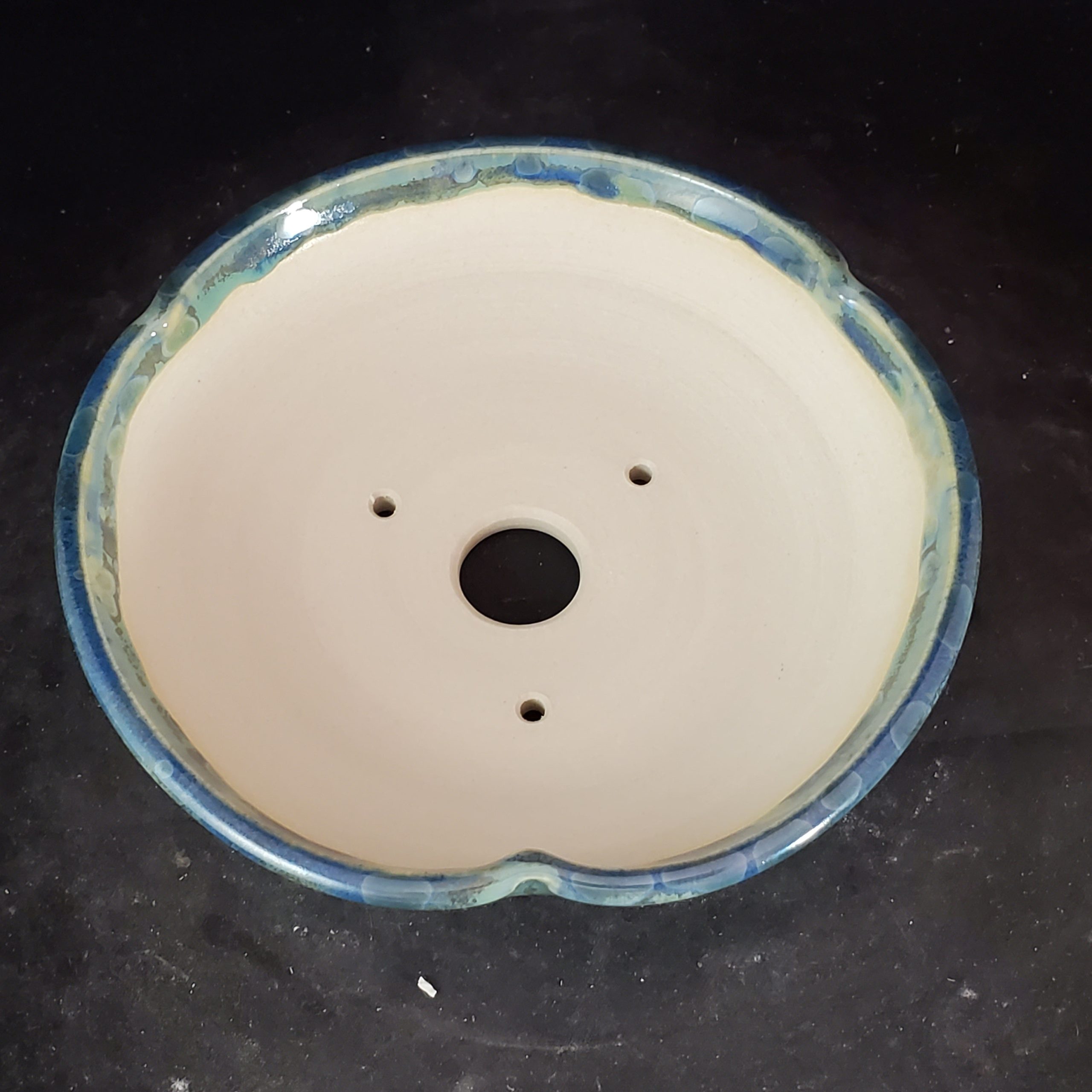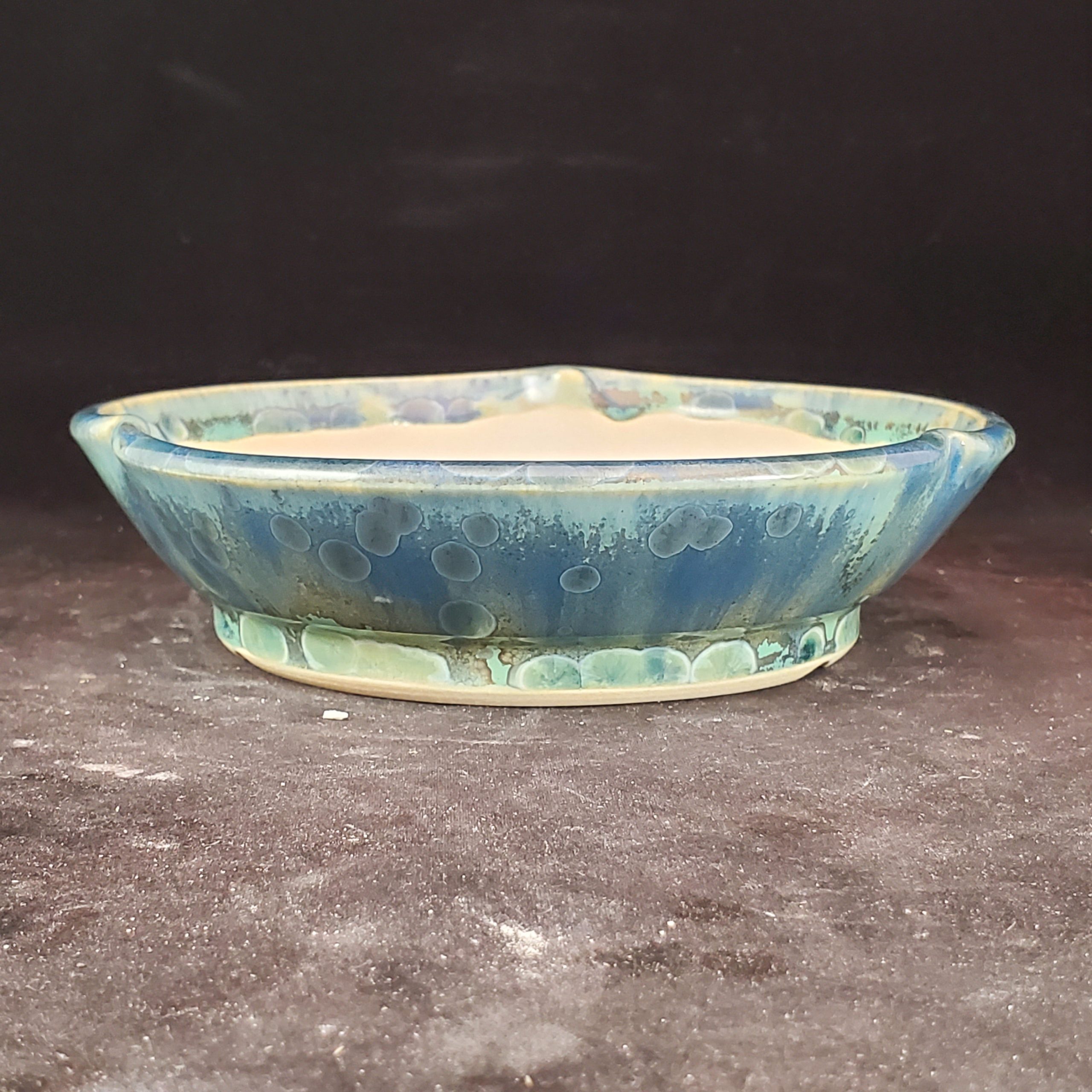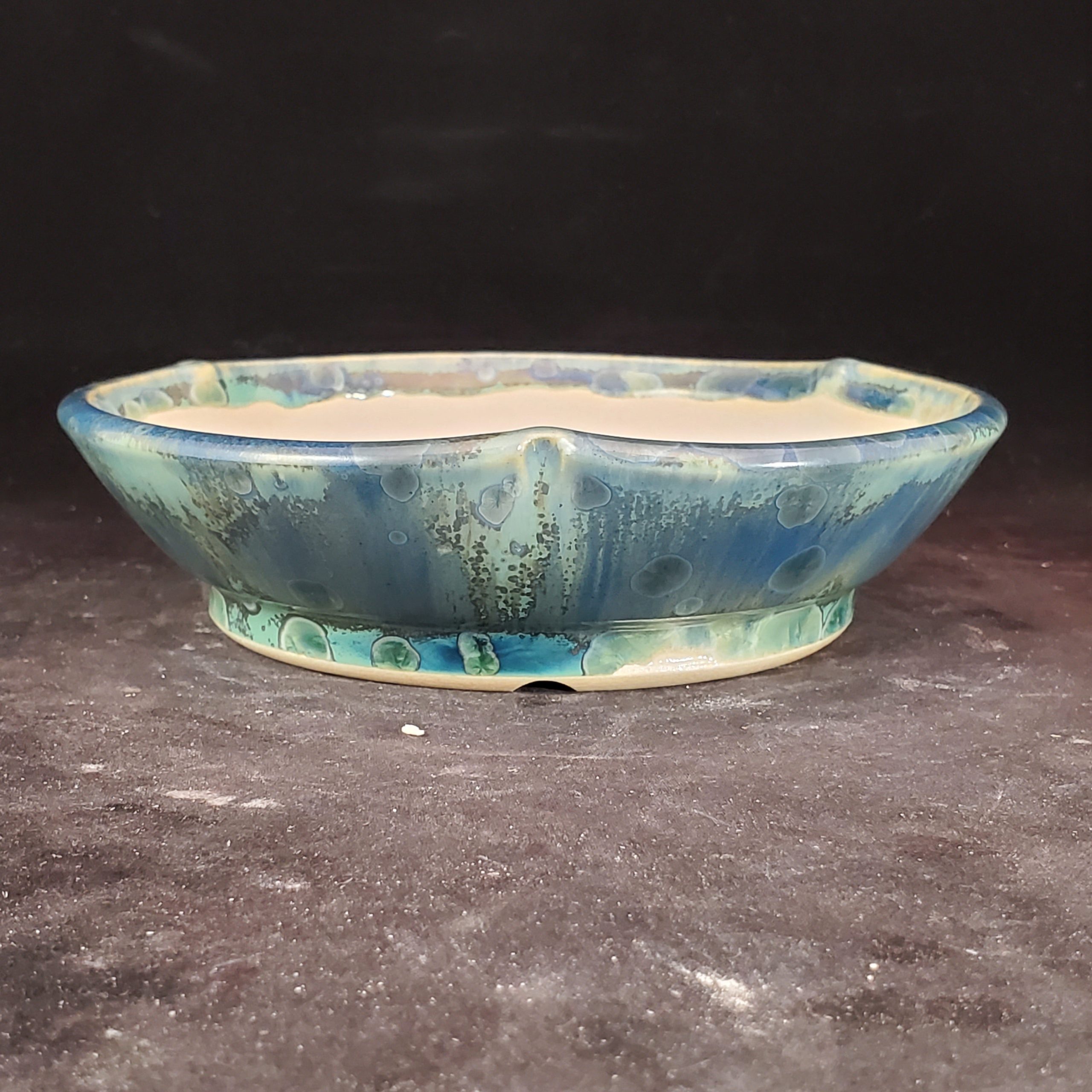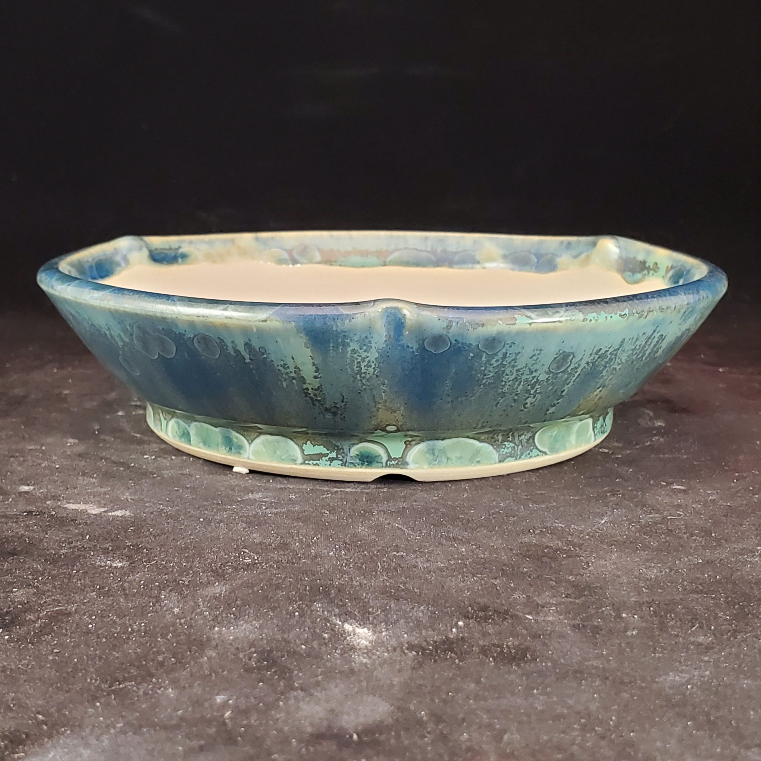 This ceramic bonsai pot is a beautiful and functional piece. It has a unique bubbled – textured exterior with a gradient of blue – green hues, while the interior is a light, off – white clay. The scalloped rim and footed base add to its aesthetic appeal, and the drainage holes make it suitable for growing small plants.