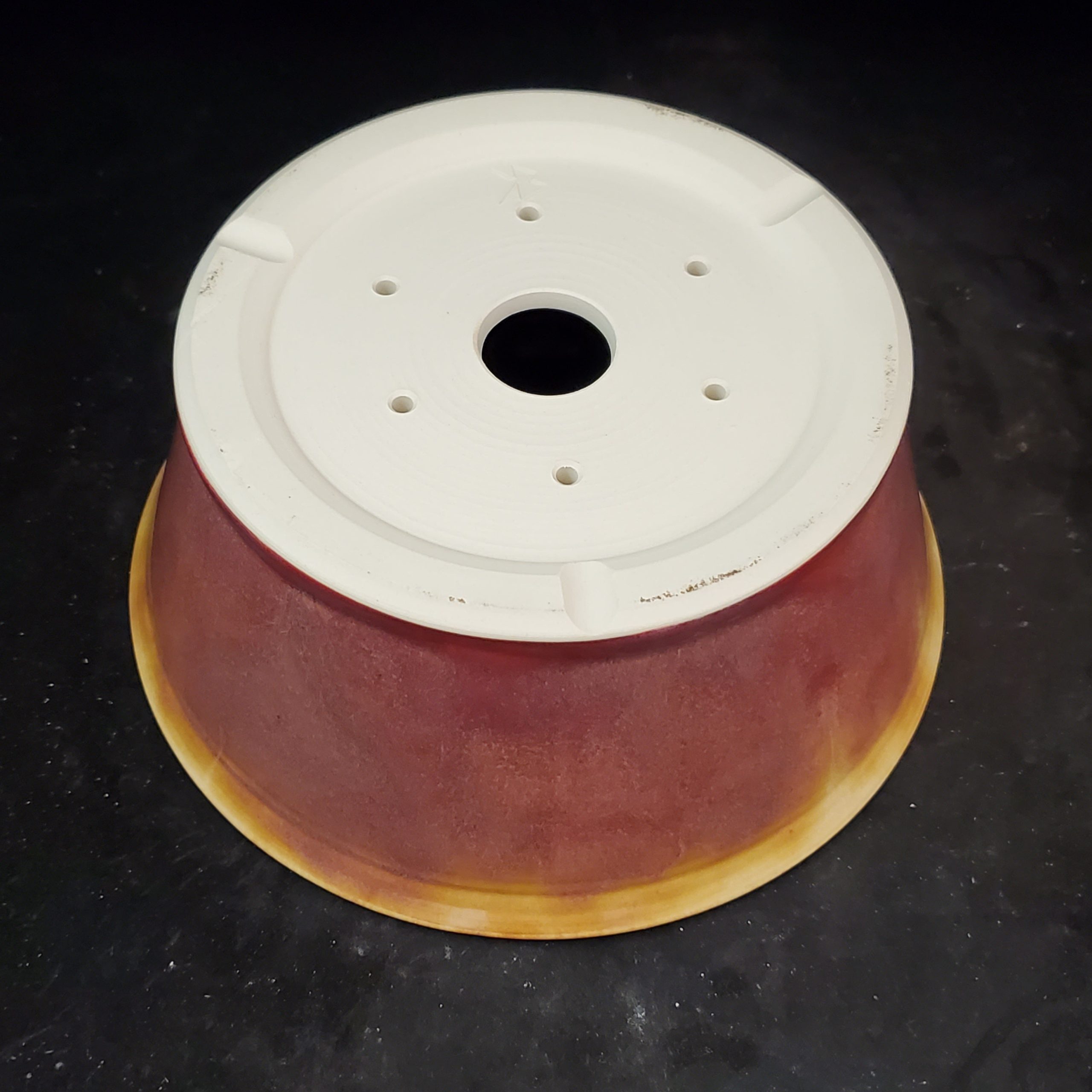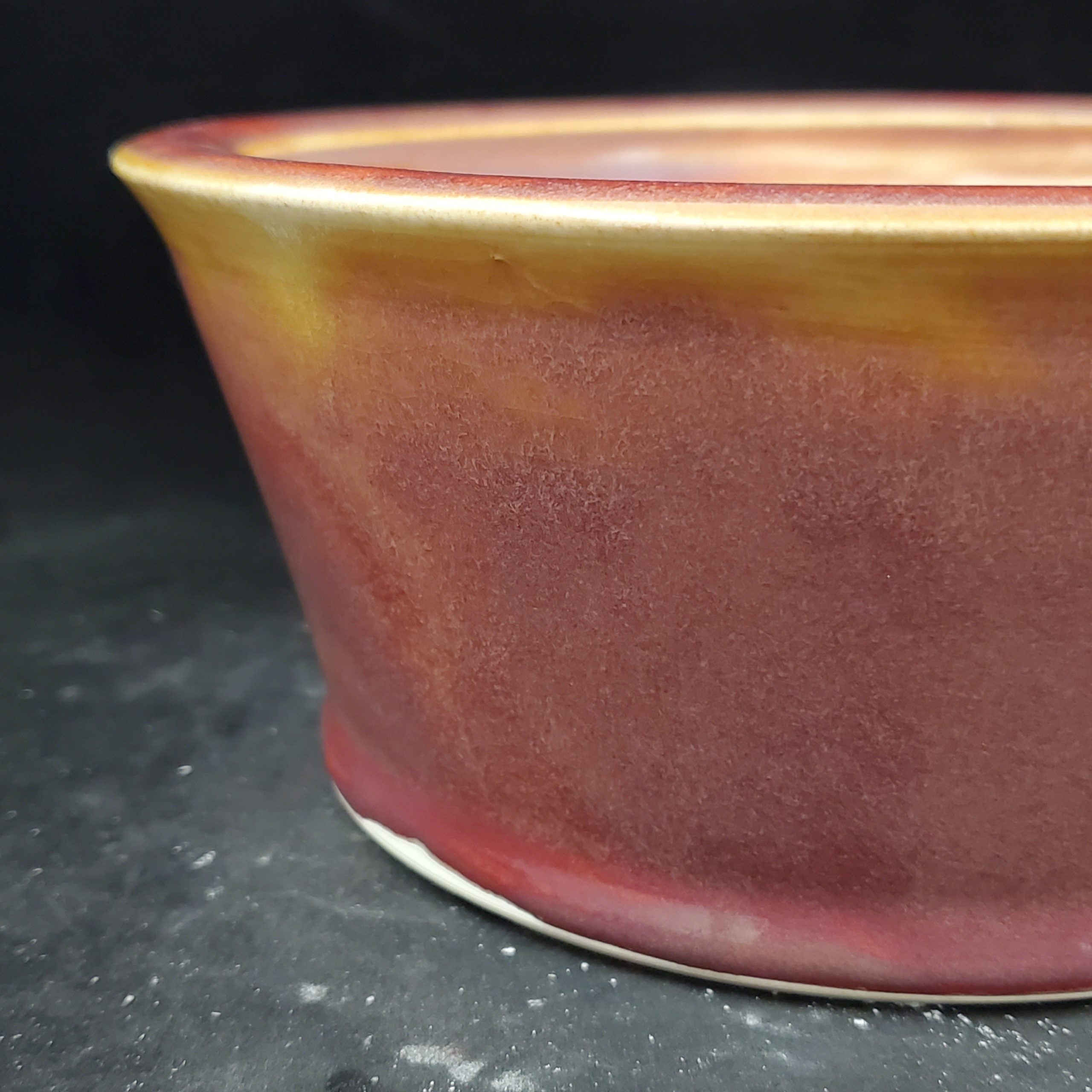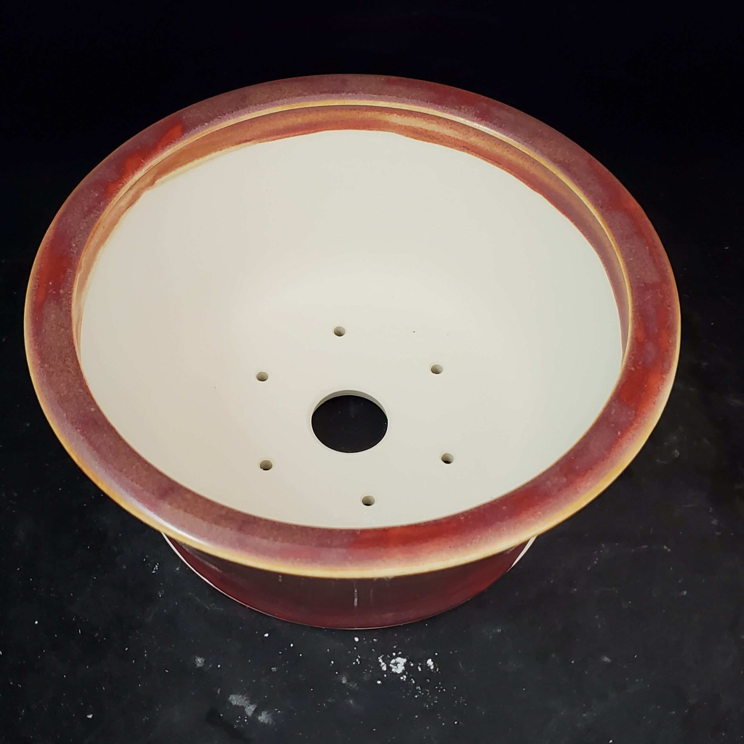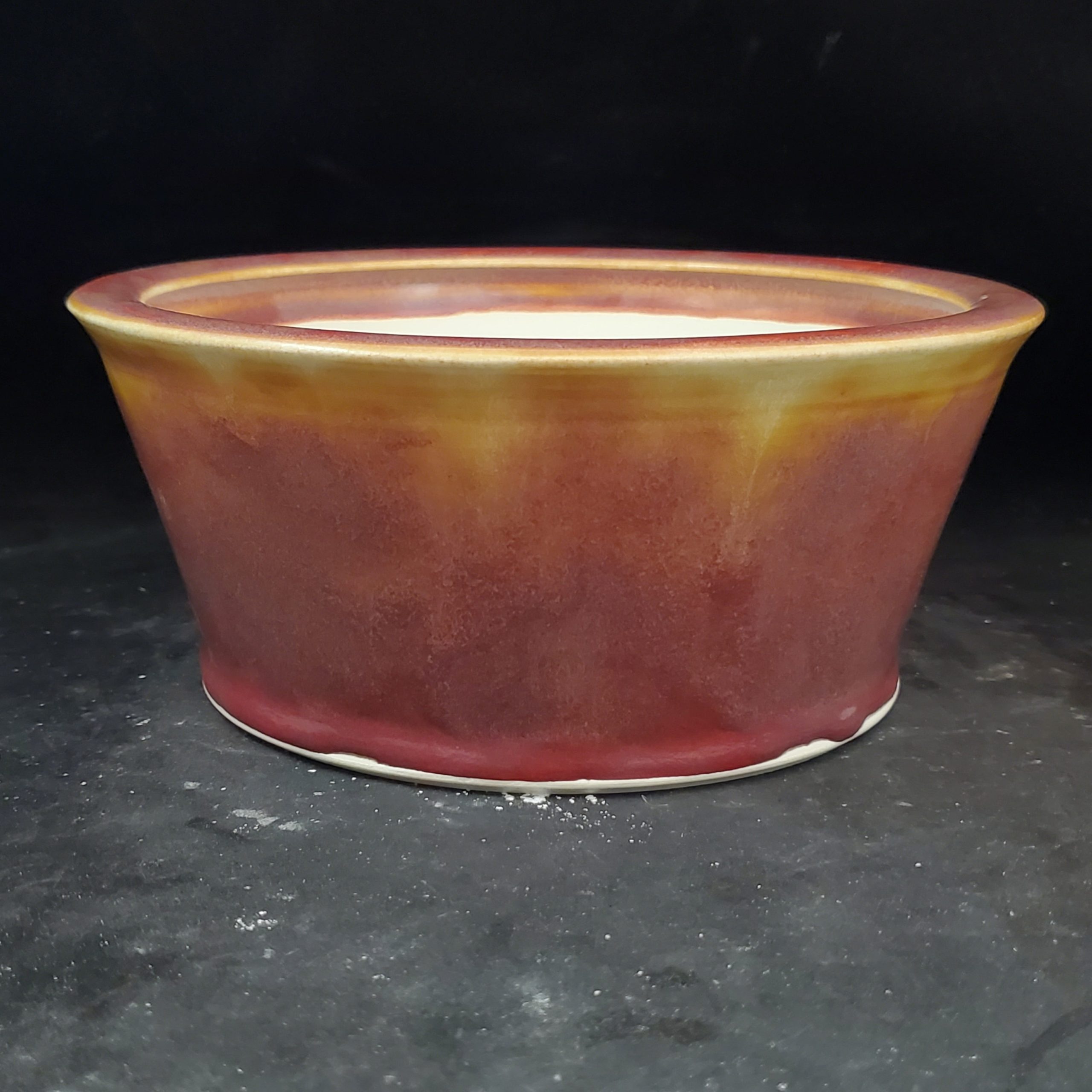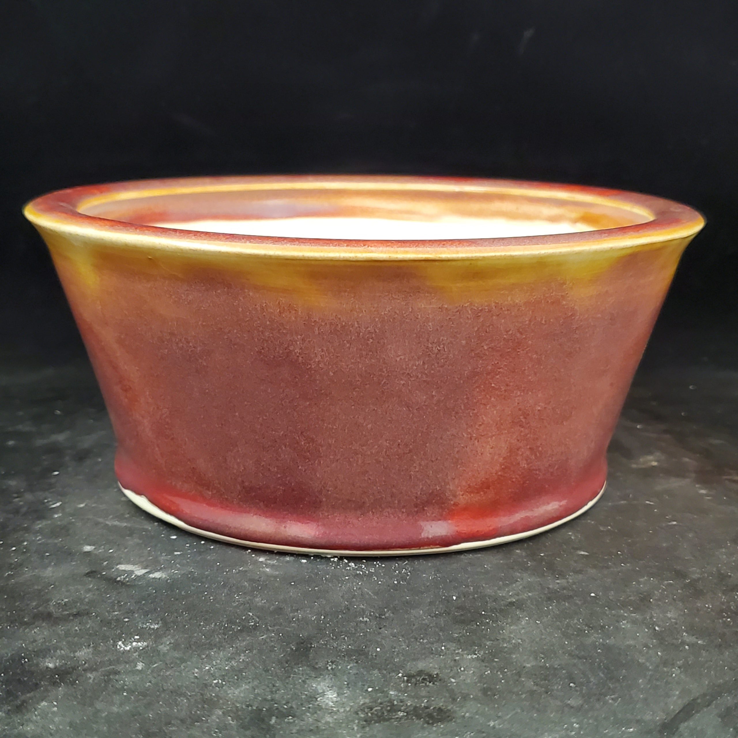 This ceramic bonsai pot is a beautiful and functional addition to any indoor space. Handmade in the US, it features a marbled-gradient glaze with reddish – brown and yellowish – gold tones on the exterior, while the interior is a clean white. The wide, shallow shape with a flared rim is both aesthetically pleasing and practical for growing small to medium plants.