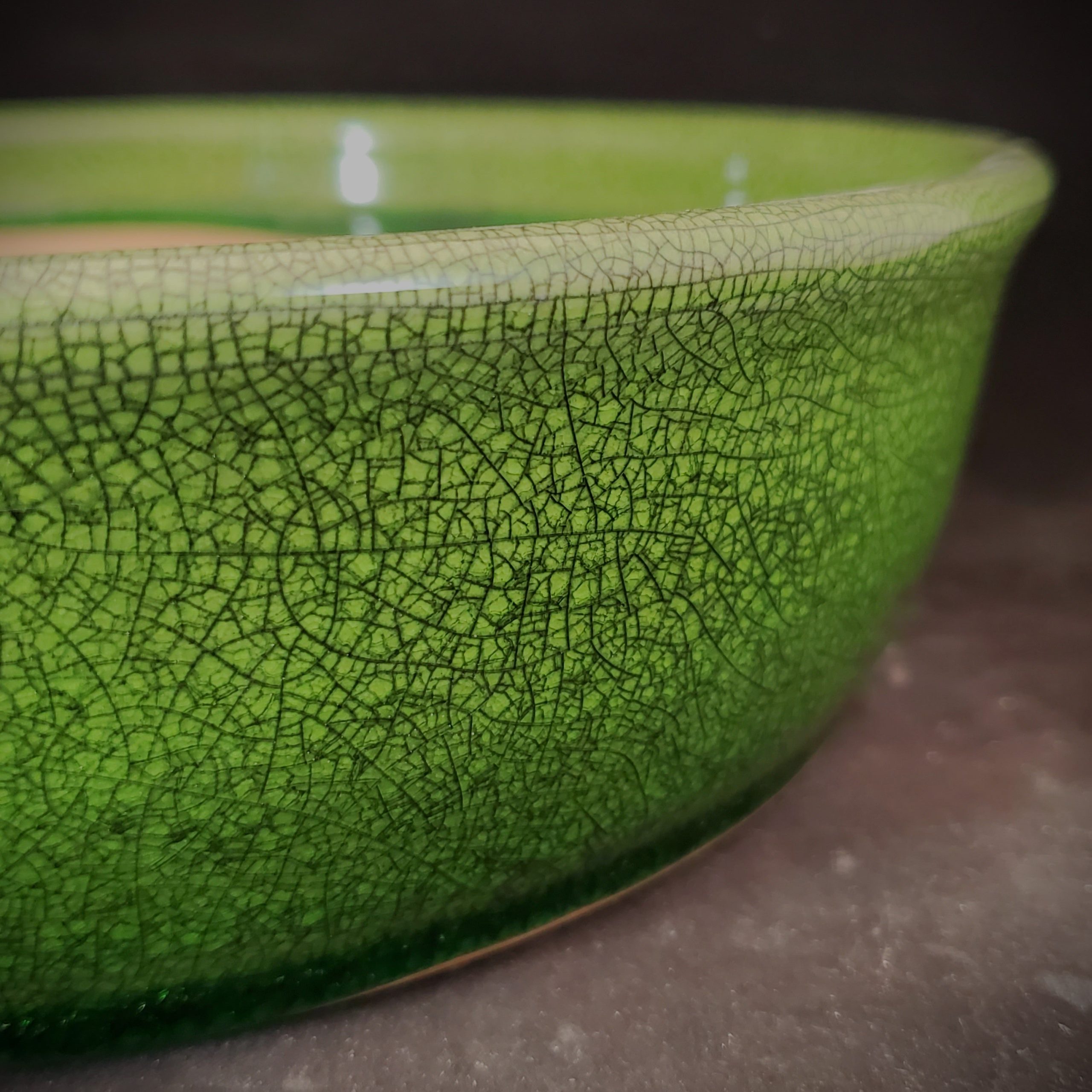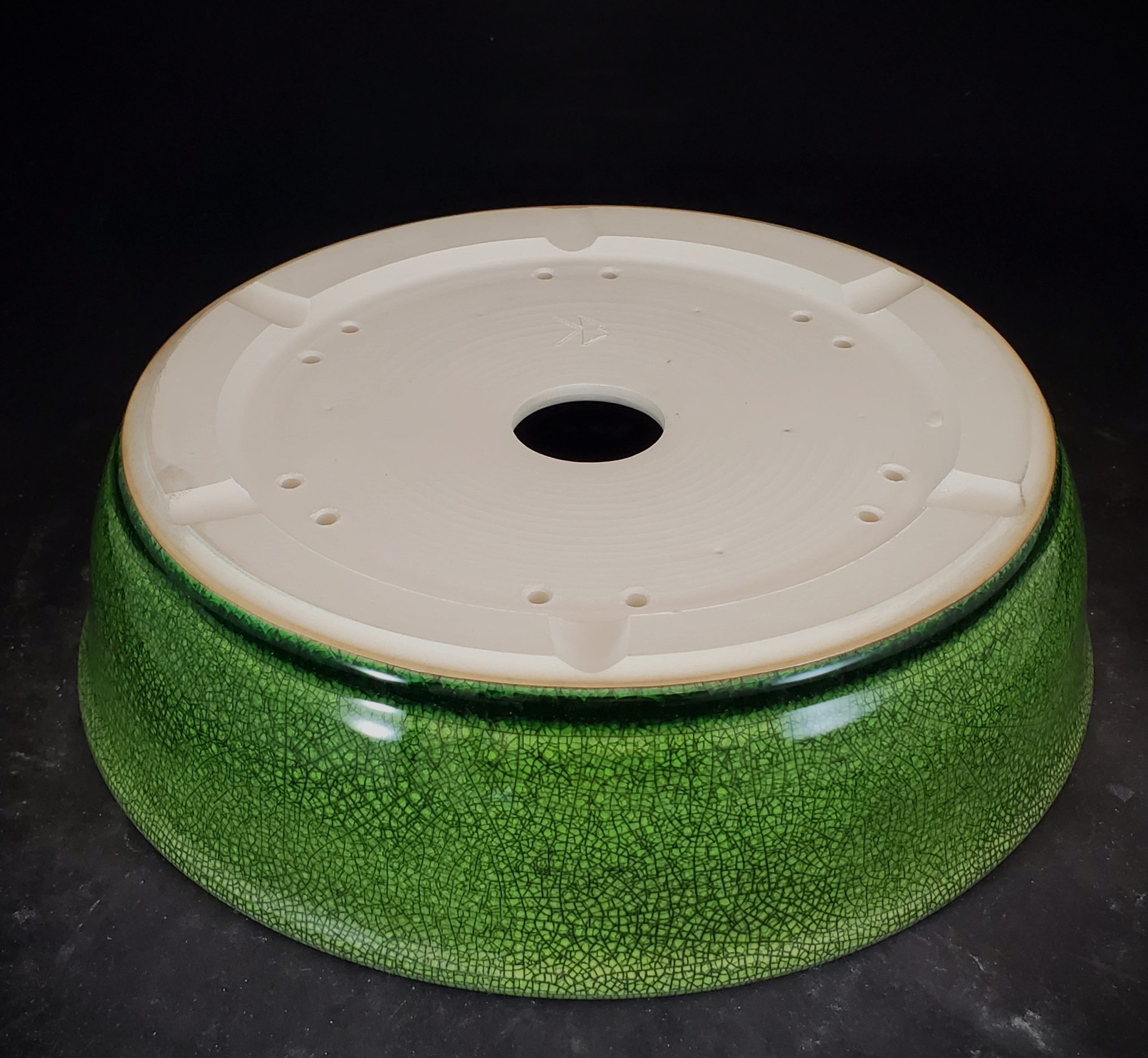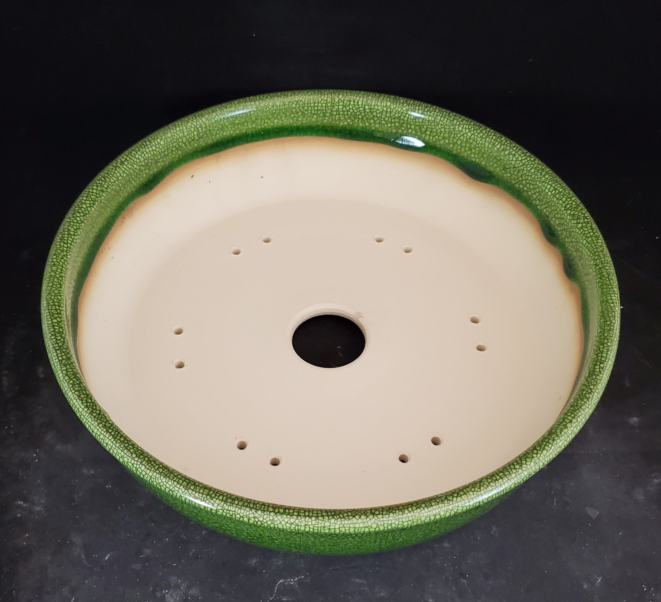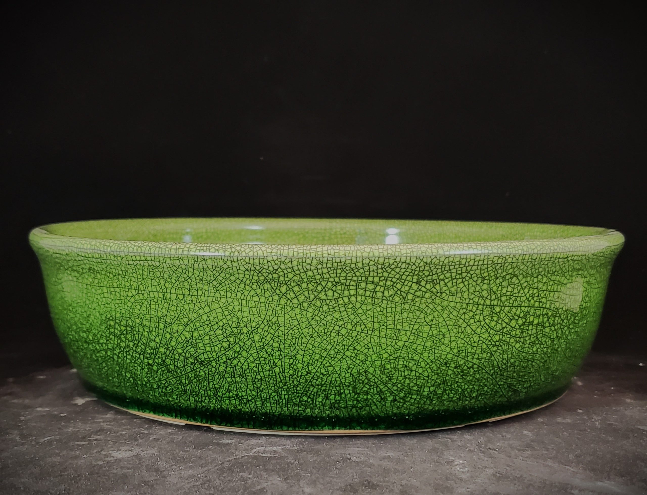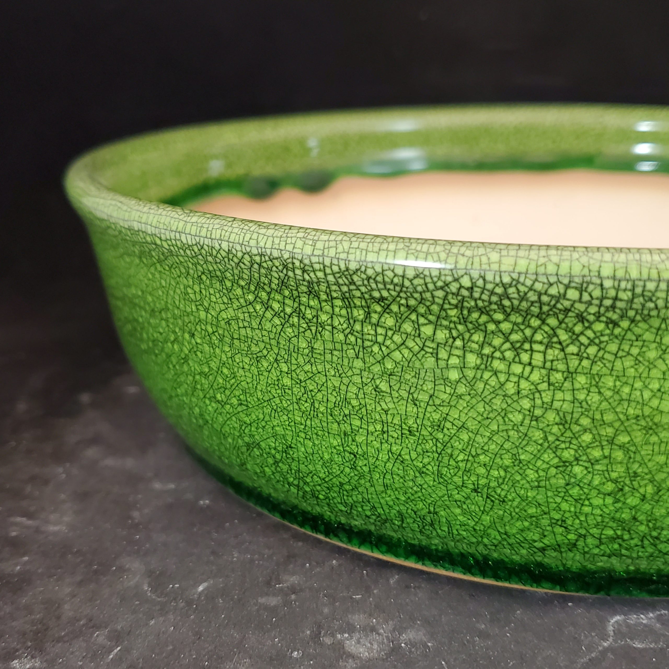 Introducing a medium-to-large, shallow ceramic planter, perfect for bonsai cultivation or small decorative plants. The exterior features a vibrant green crackle glaze, creating an intricate and decorative pattern. The interior is an unglazed light beige clay, providing breathability for the plant roots.