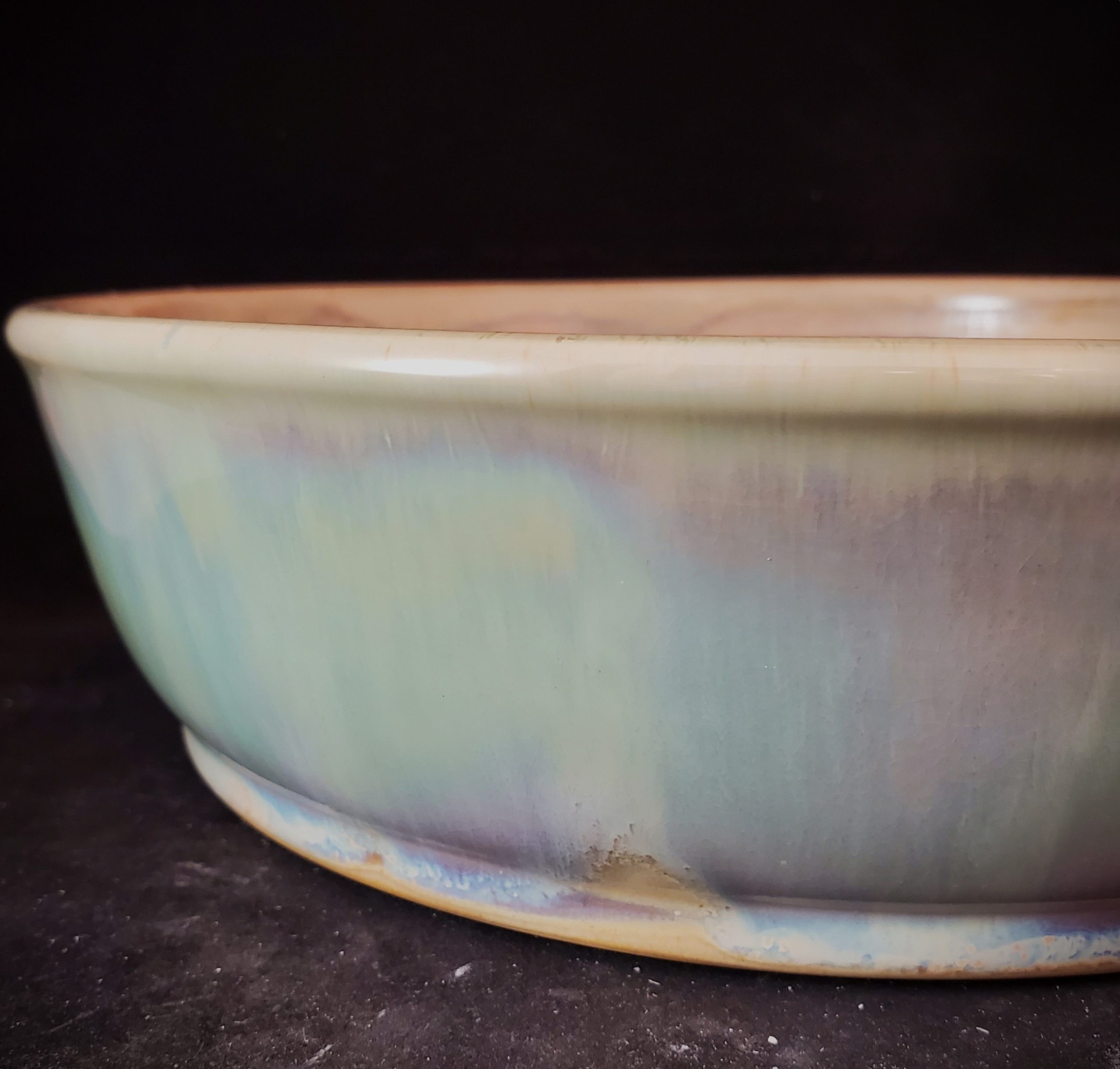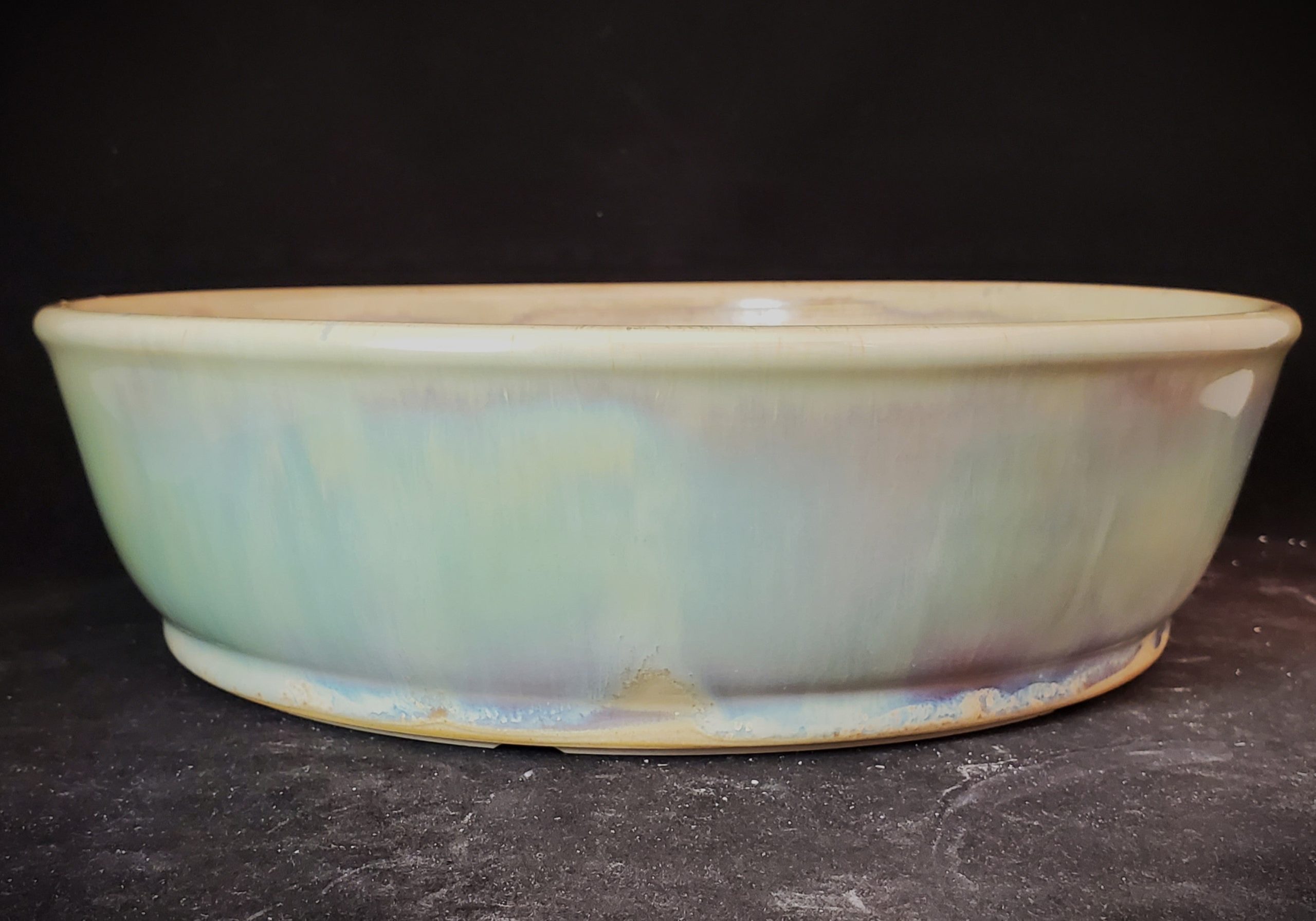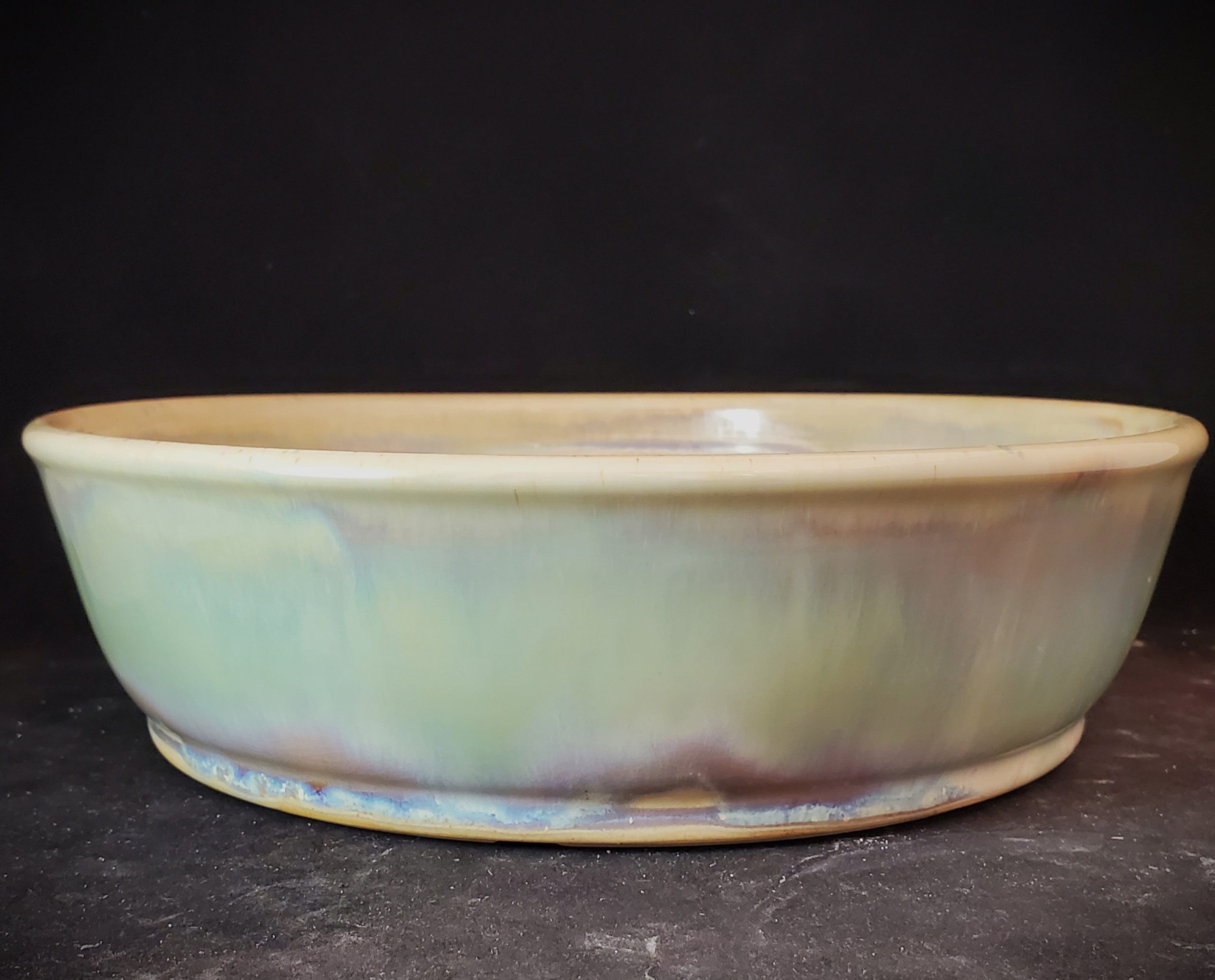 This is a beautiful ceramic bonsai pot. It has an eye – catching iridescent, marbled exterior glaze in soft green, blue, and purple hues, while the interior rim is a lighter cream color. The pot is handmade in the US, vitrified, and freeze – safe, and it comes with proper drainage features, making it ideal for growing plants.