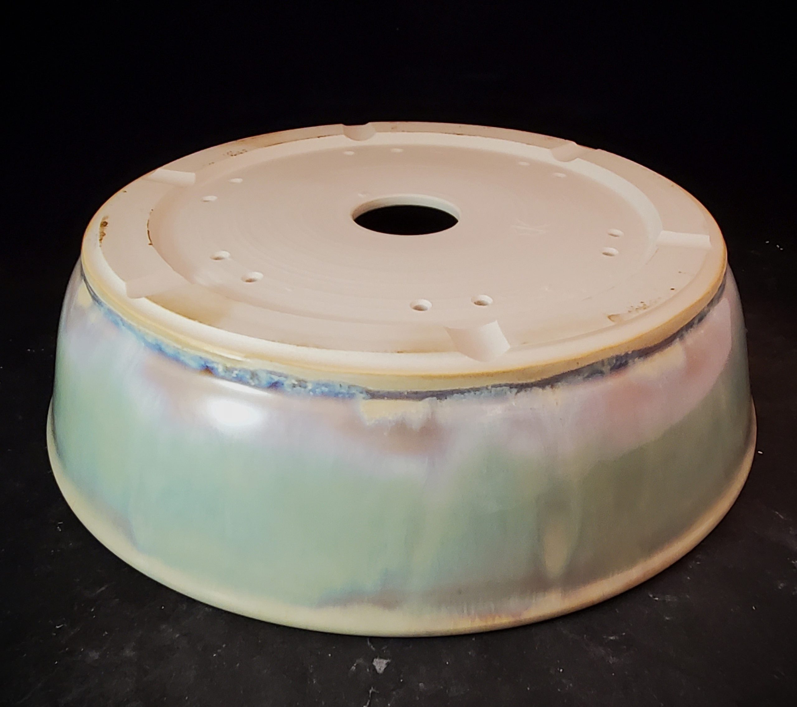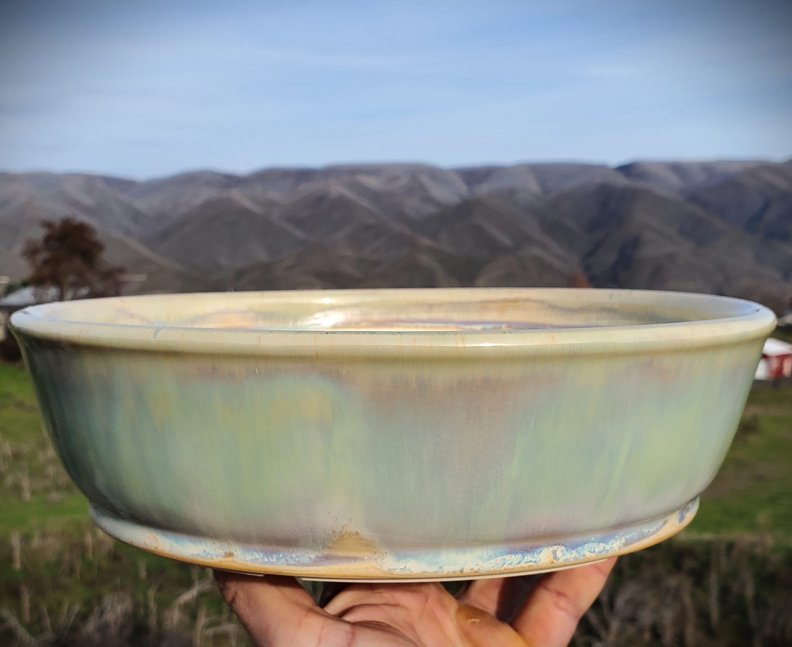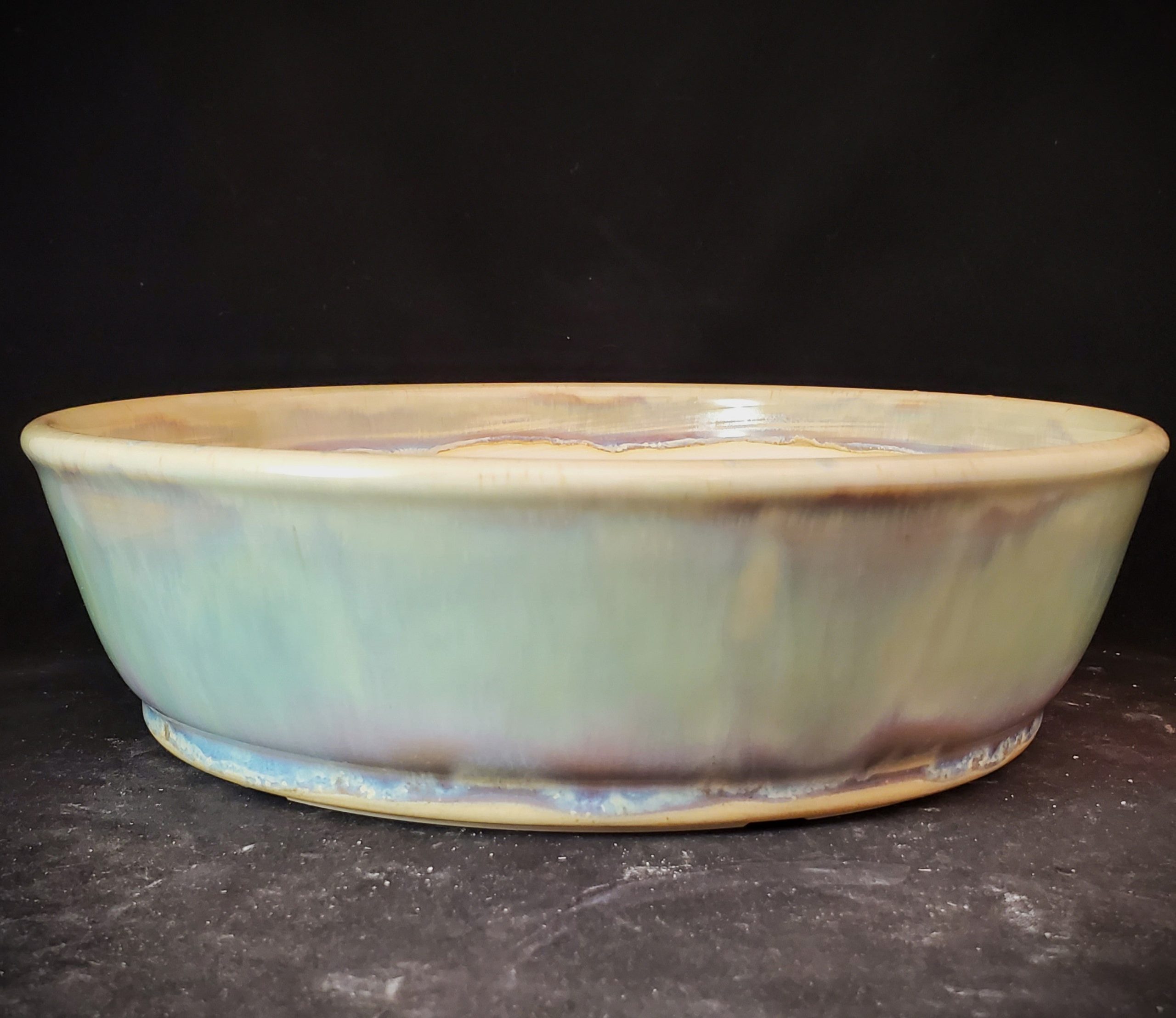 This is a beautiful ceramic bonsai pot. It has an eye – catching iridescent, marbled exterior glaze in soft green, blue, and purple hues, while the interior rim is a lighter cream color. The pot is handmade in the US, vitrified, and freeze – safe, and it comes with proper drainage features, making it ideal for growing plants.