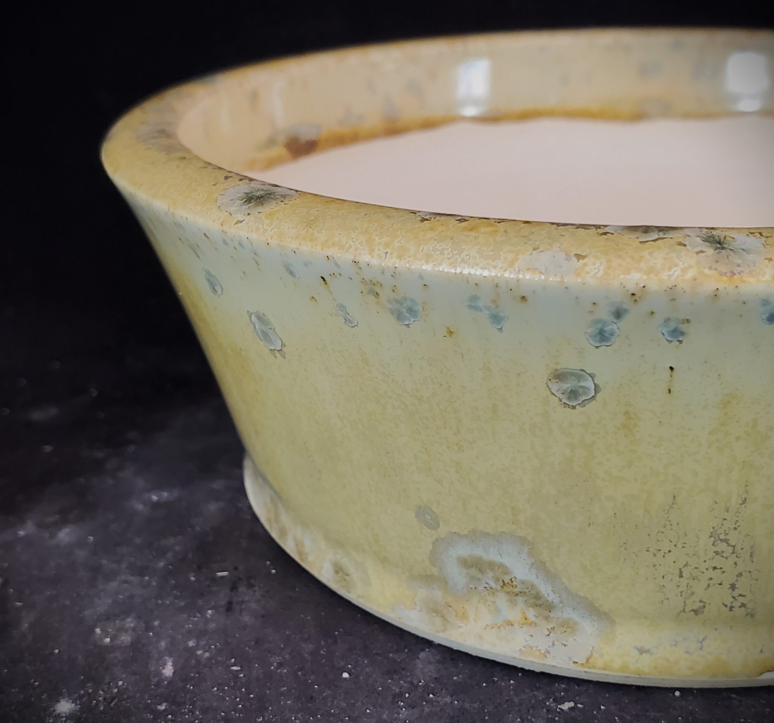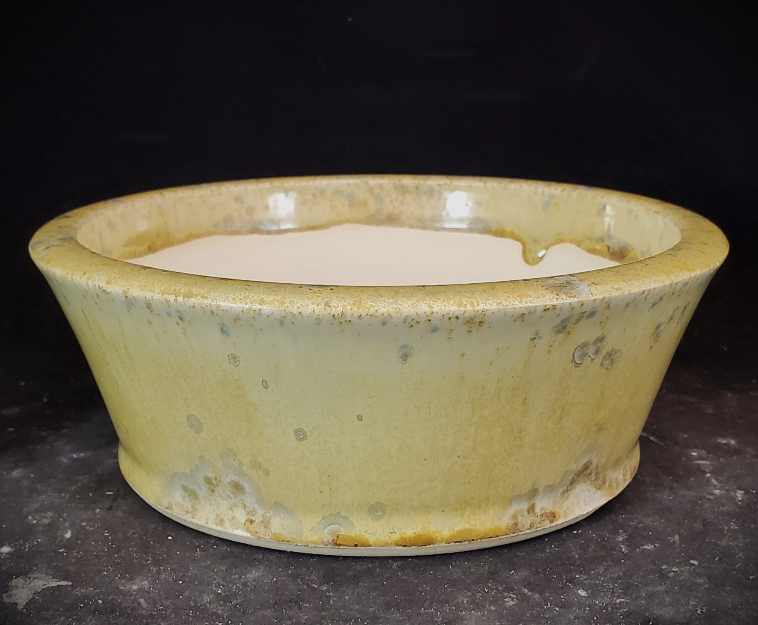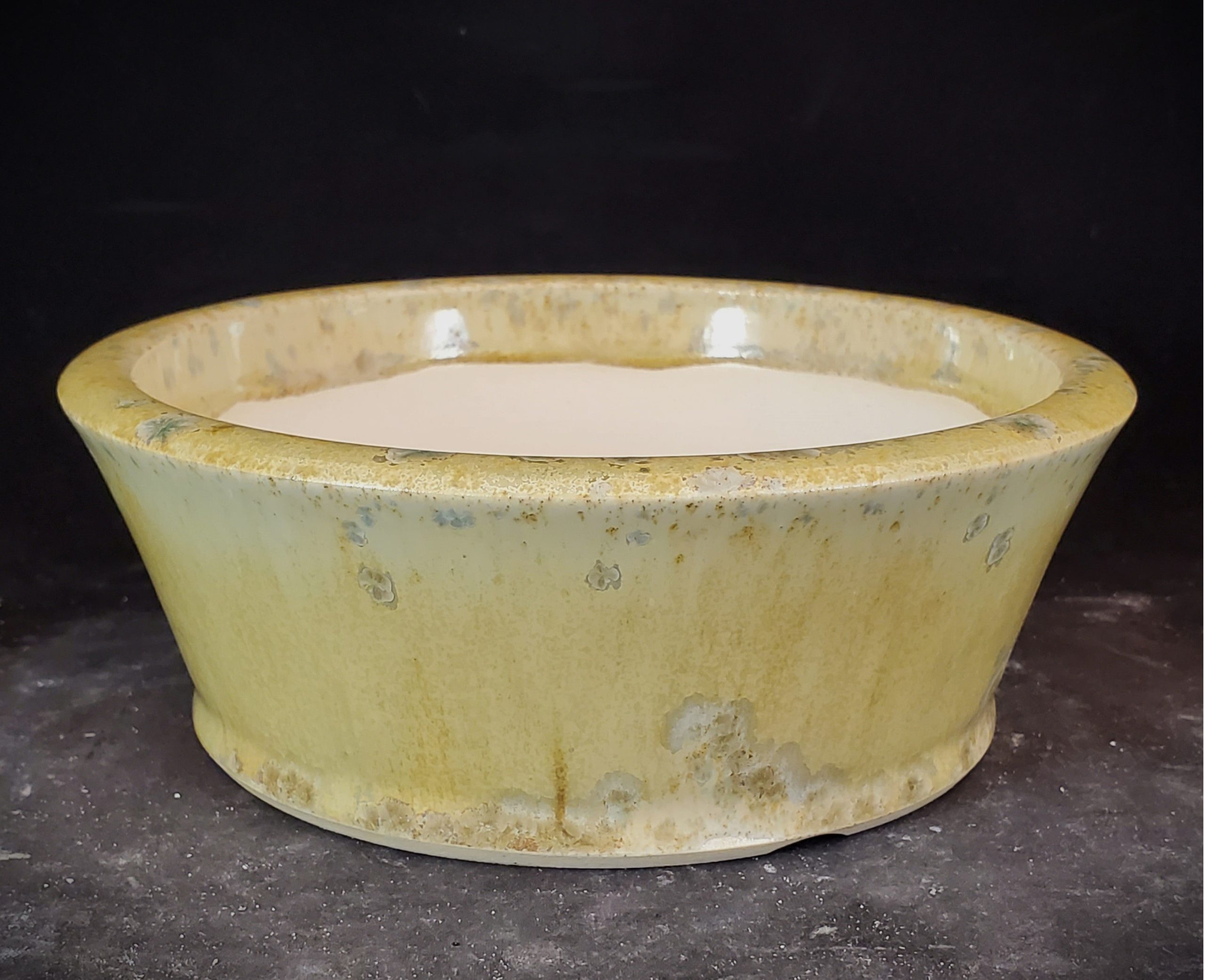 This ceramic bonsai pot features a shallow, wide bowl – shaped design with a flared rim. It has a multi – colored glossy glaze with a yellow base and blue – green speckles, creating a marbled and organic pattern. The pot is handmade in the US and comes with a proper drainage system, making it suitable for bonsai plants.
