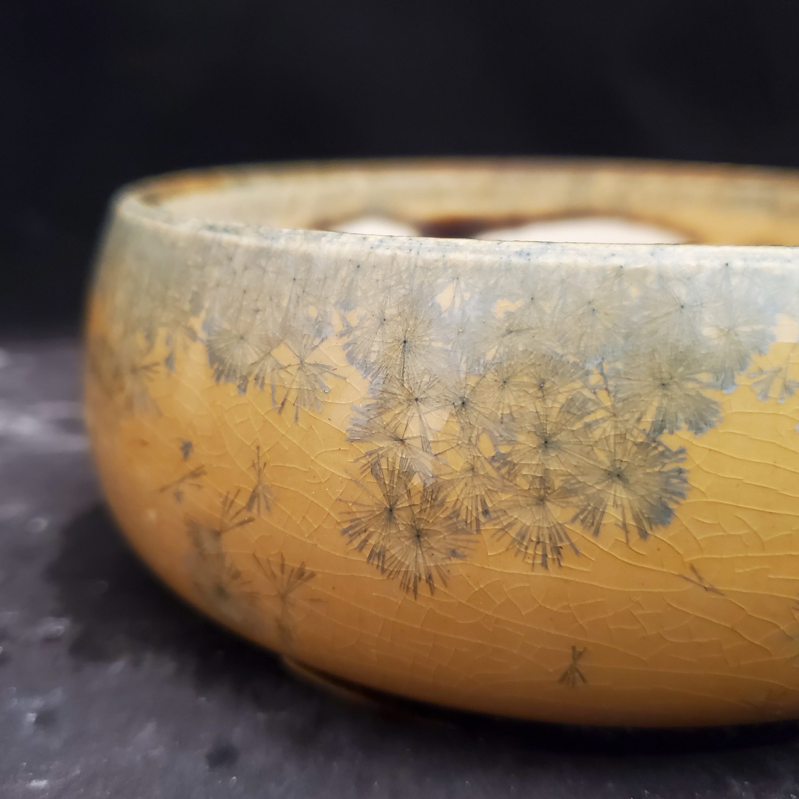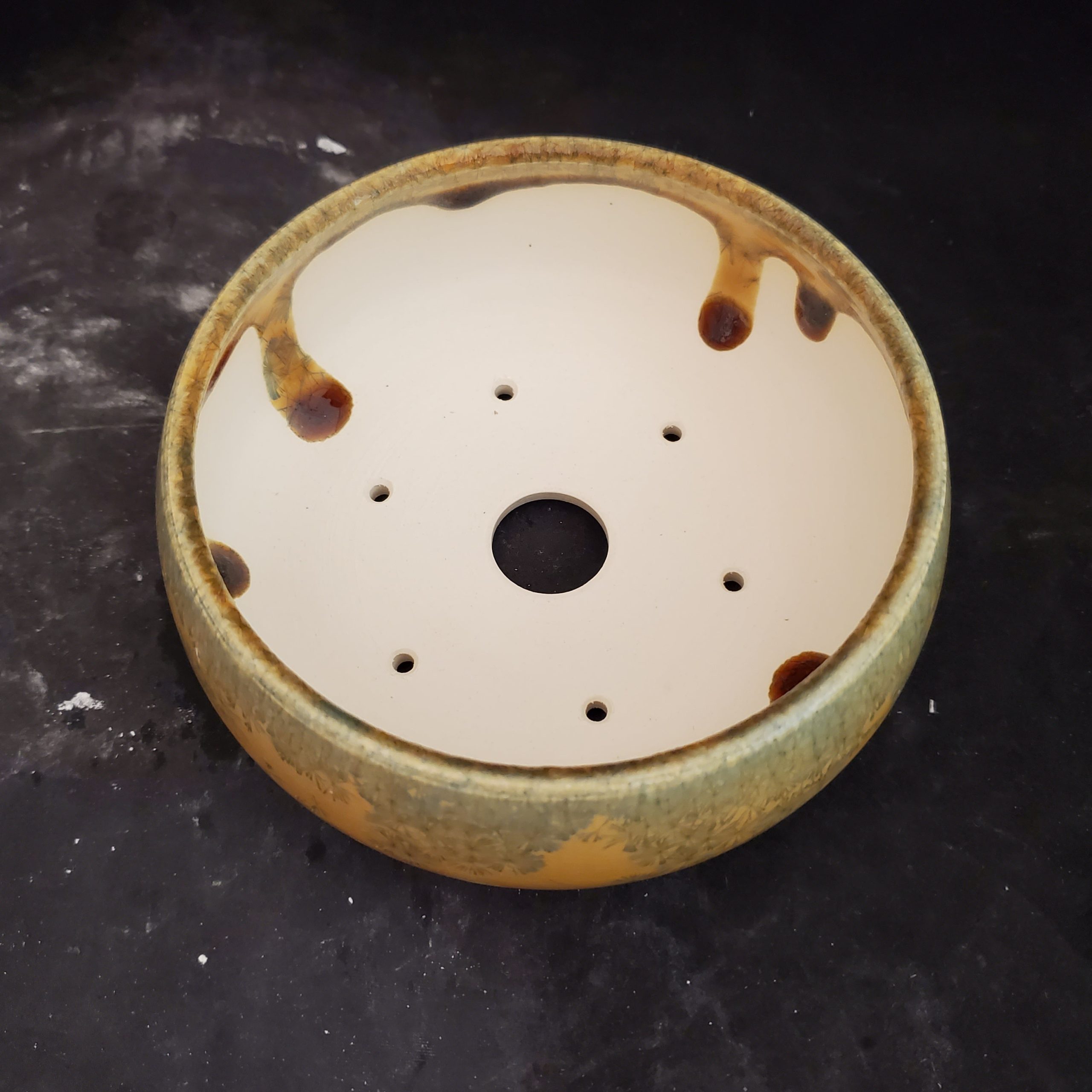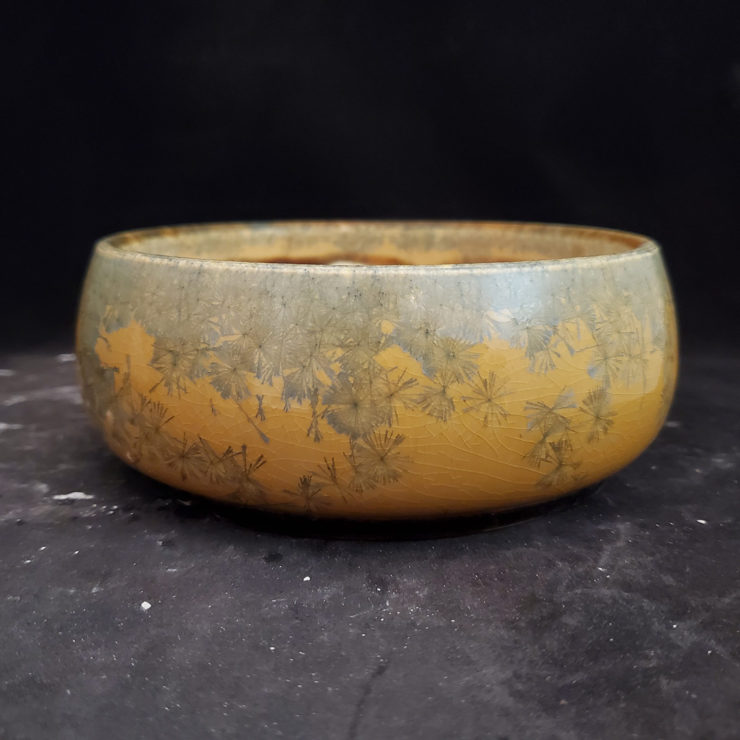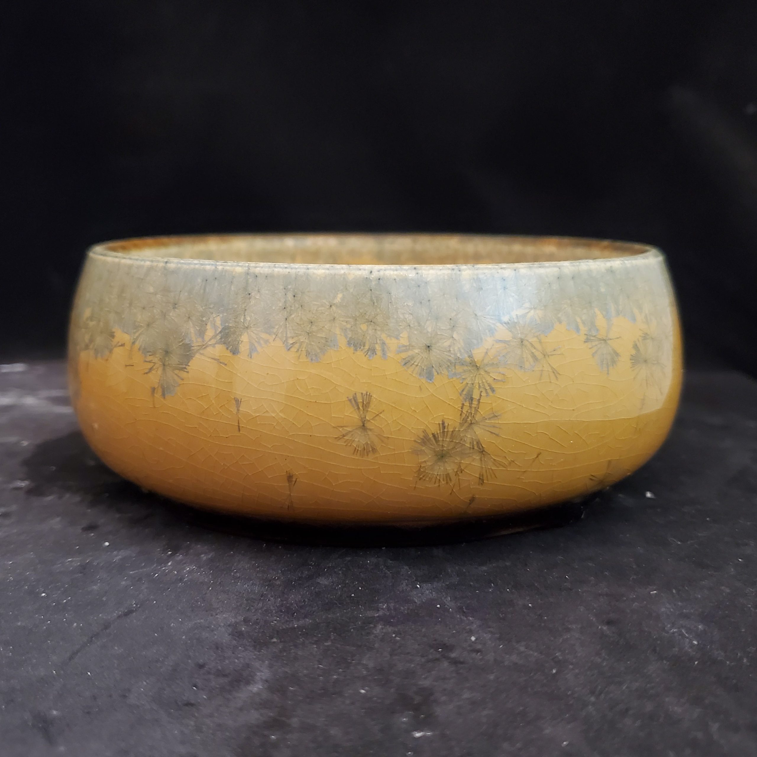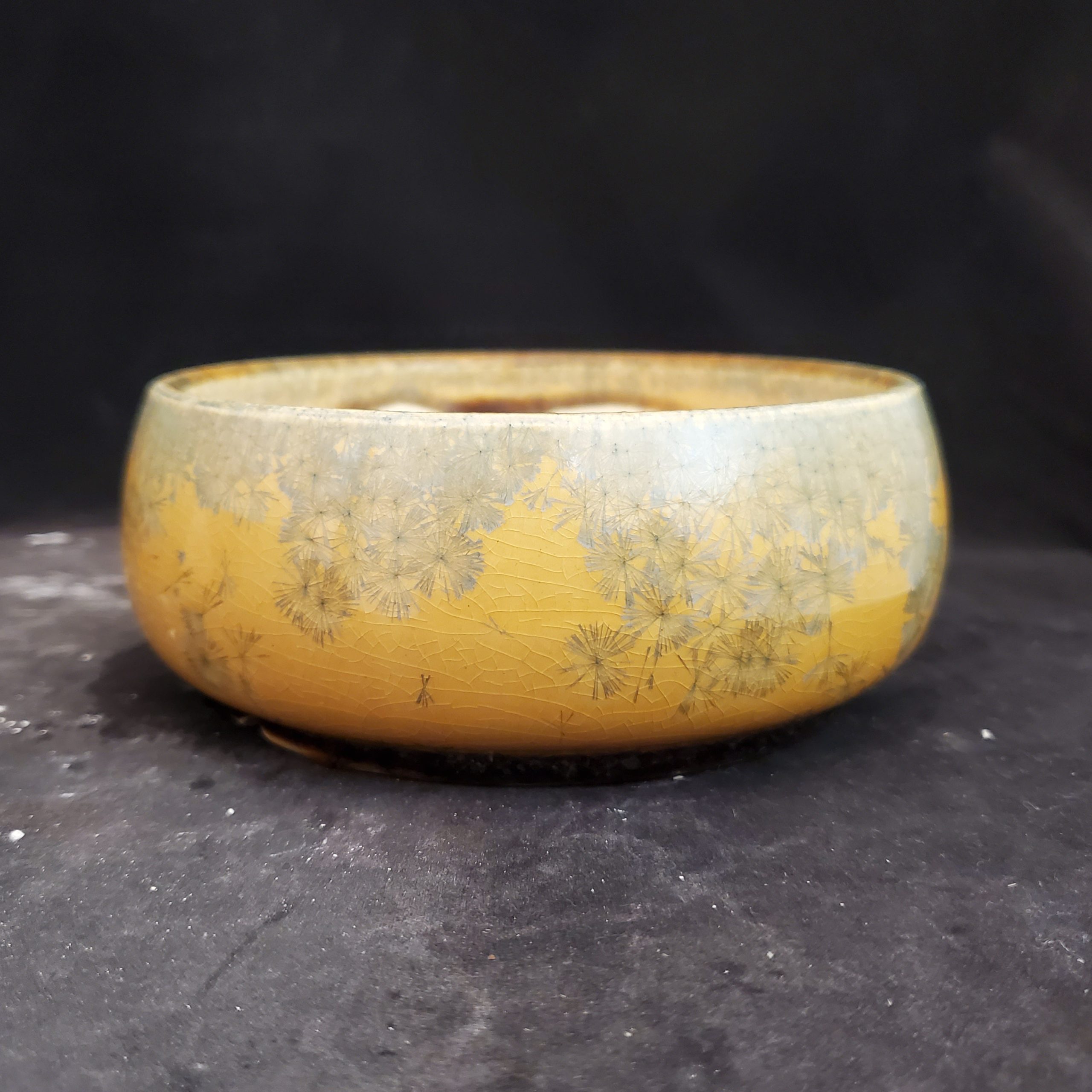 This charming product is a ceramic bonsai pot that’s both decorative and functional. It features a warm golden – yellow base with a crackled glaze and delicate grayish – blue dandelion – like patterns. Handmade in the US, it has multiple drainage holes at the bottom, making it perfect for growing small plants.