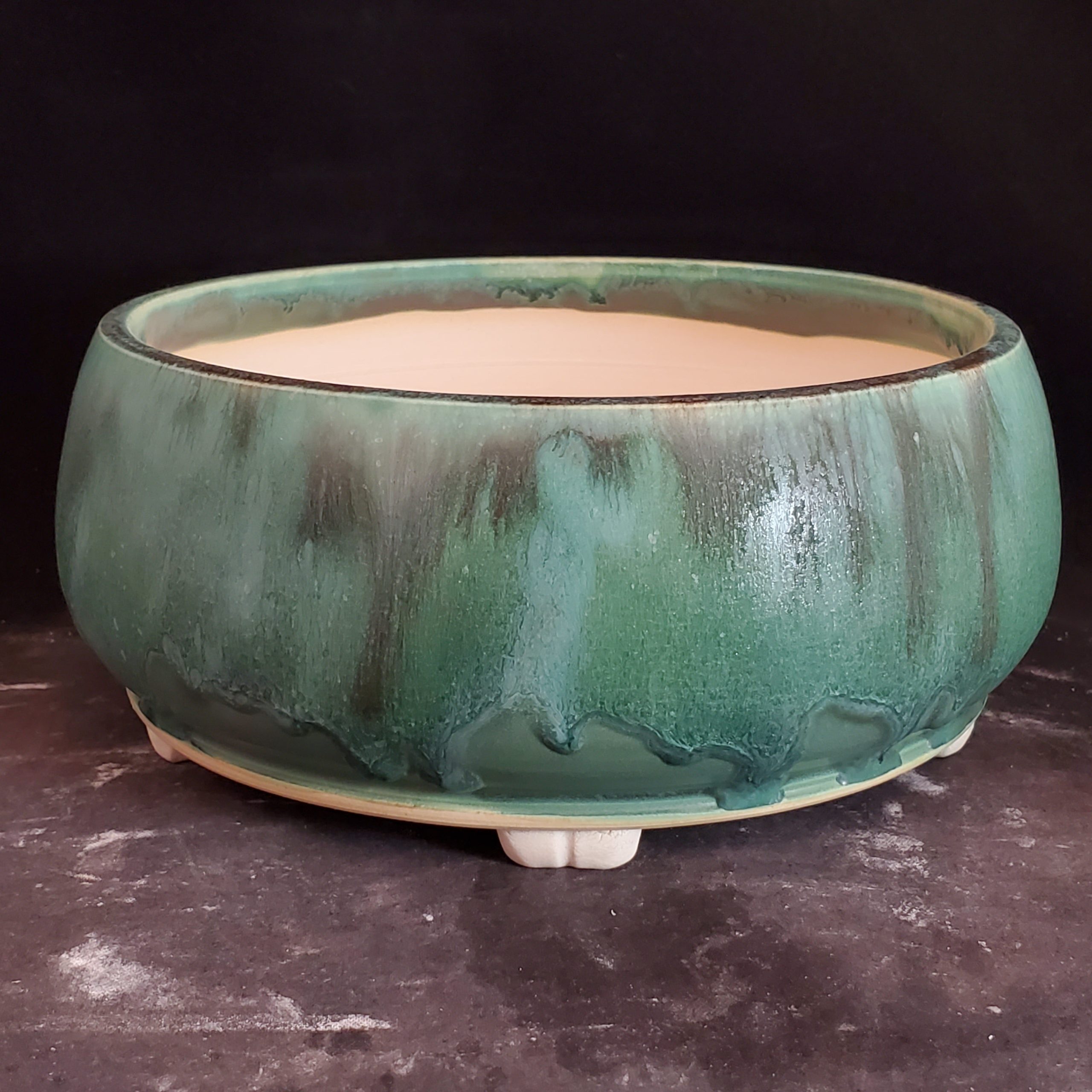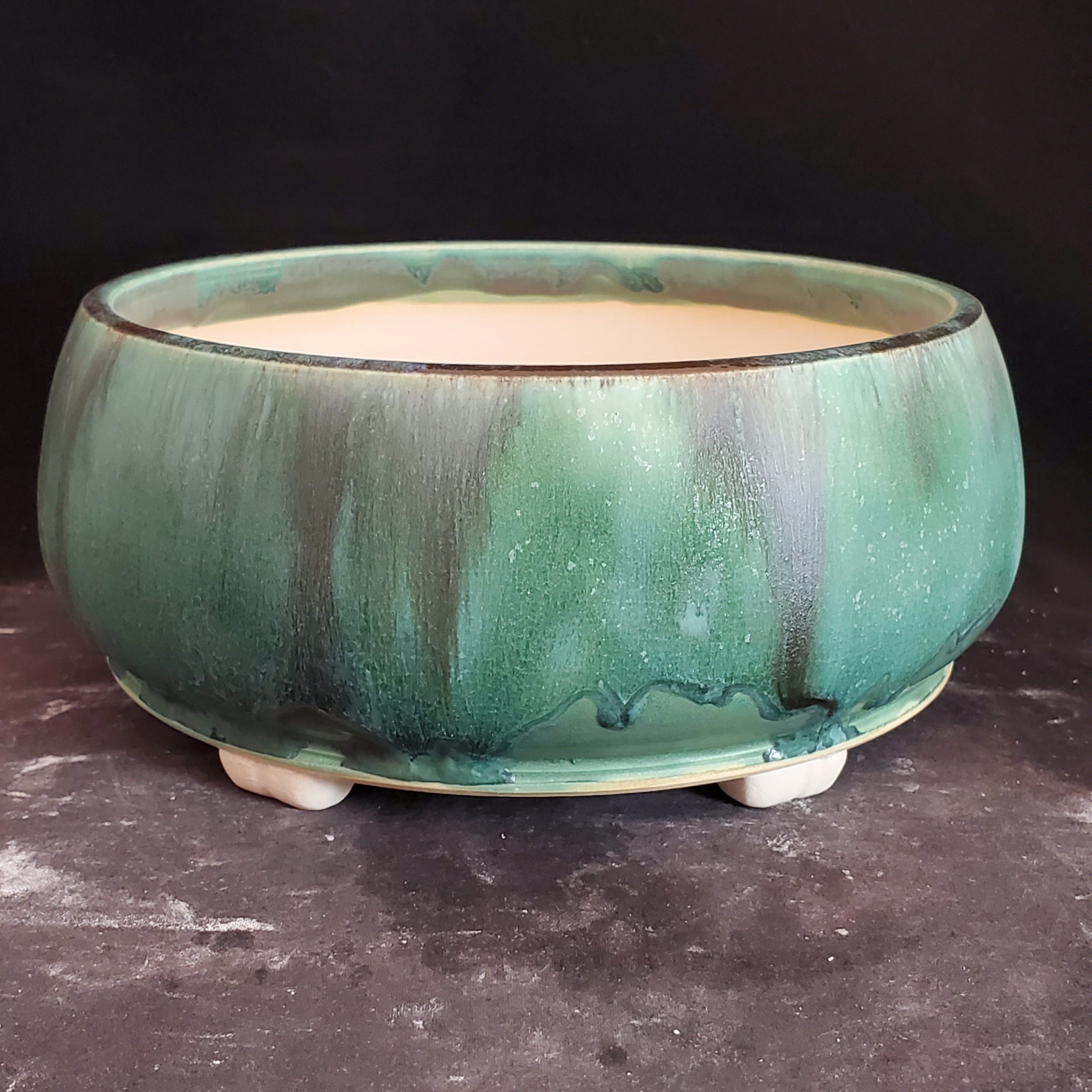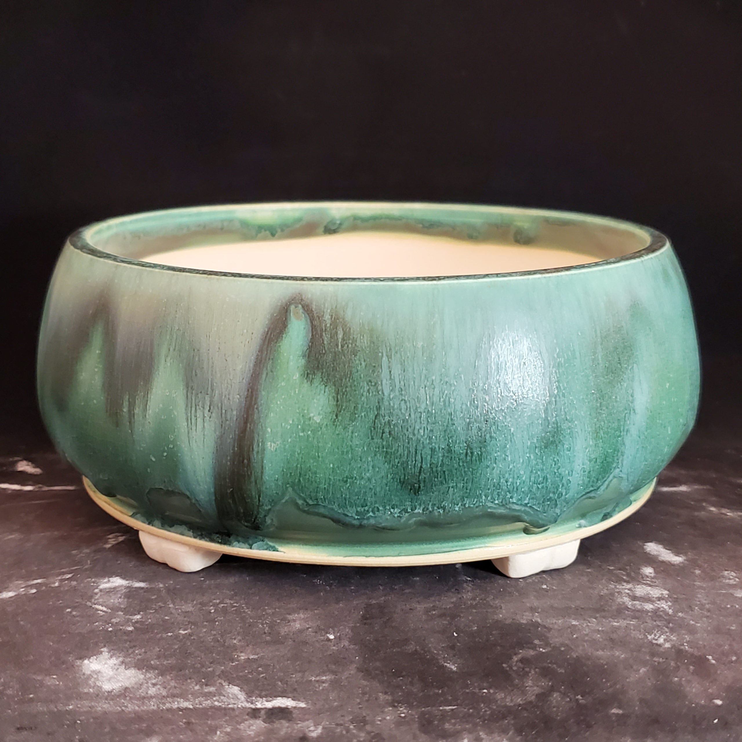 This is a beautifully crafted ceramic planter. It features a marbled glaze with green and dark streaks on the exterior and a light cream interior, creating an eye – catching contrast. The footed design and drainage holes make it perfect for indoor plants, ensuring their healthy growth.