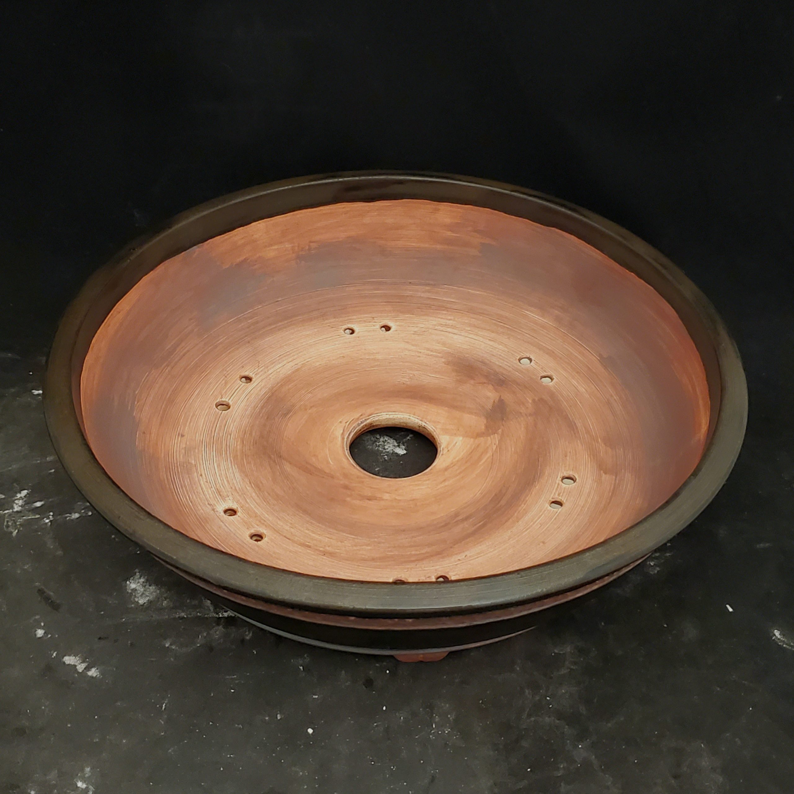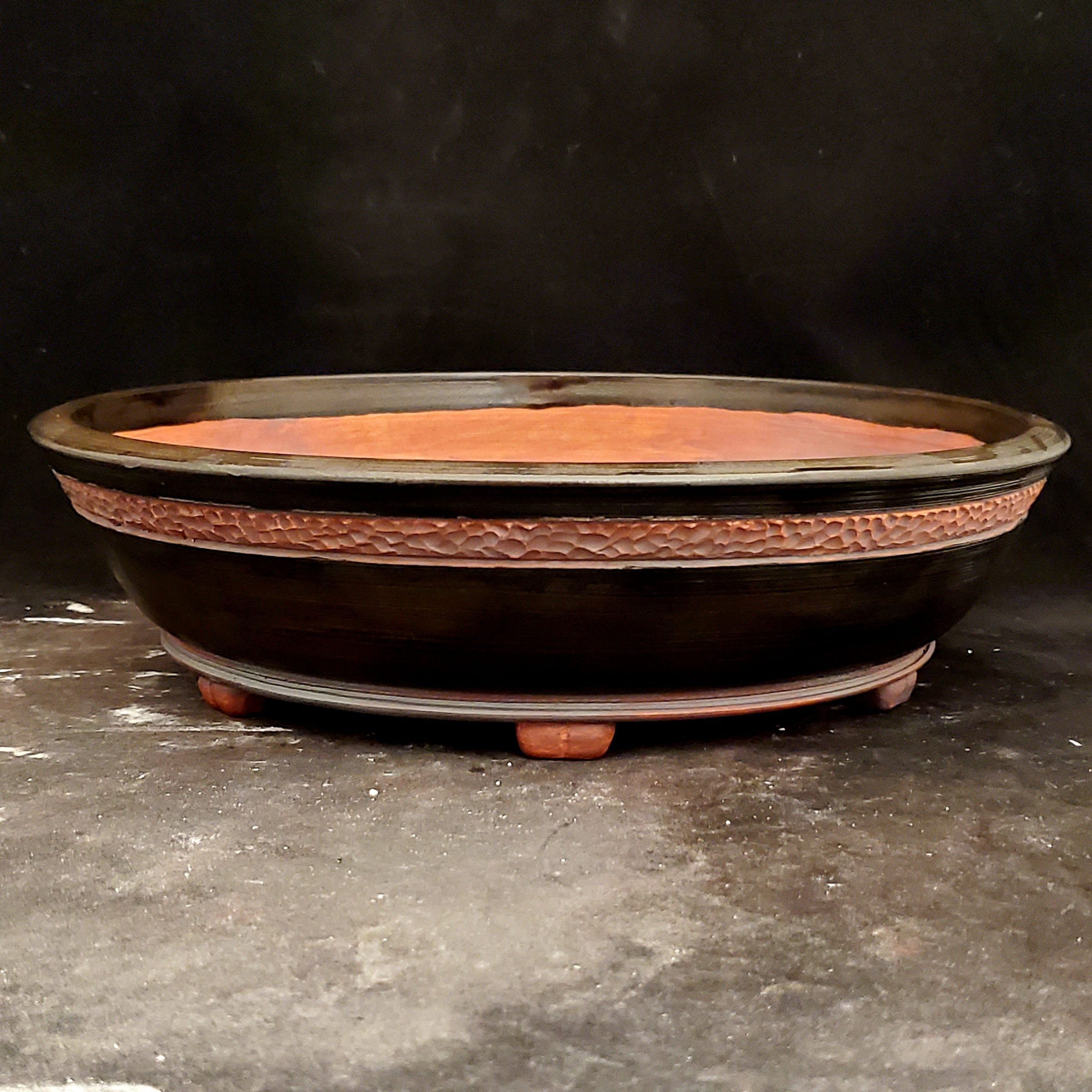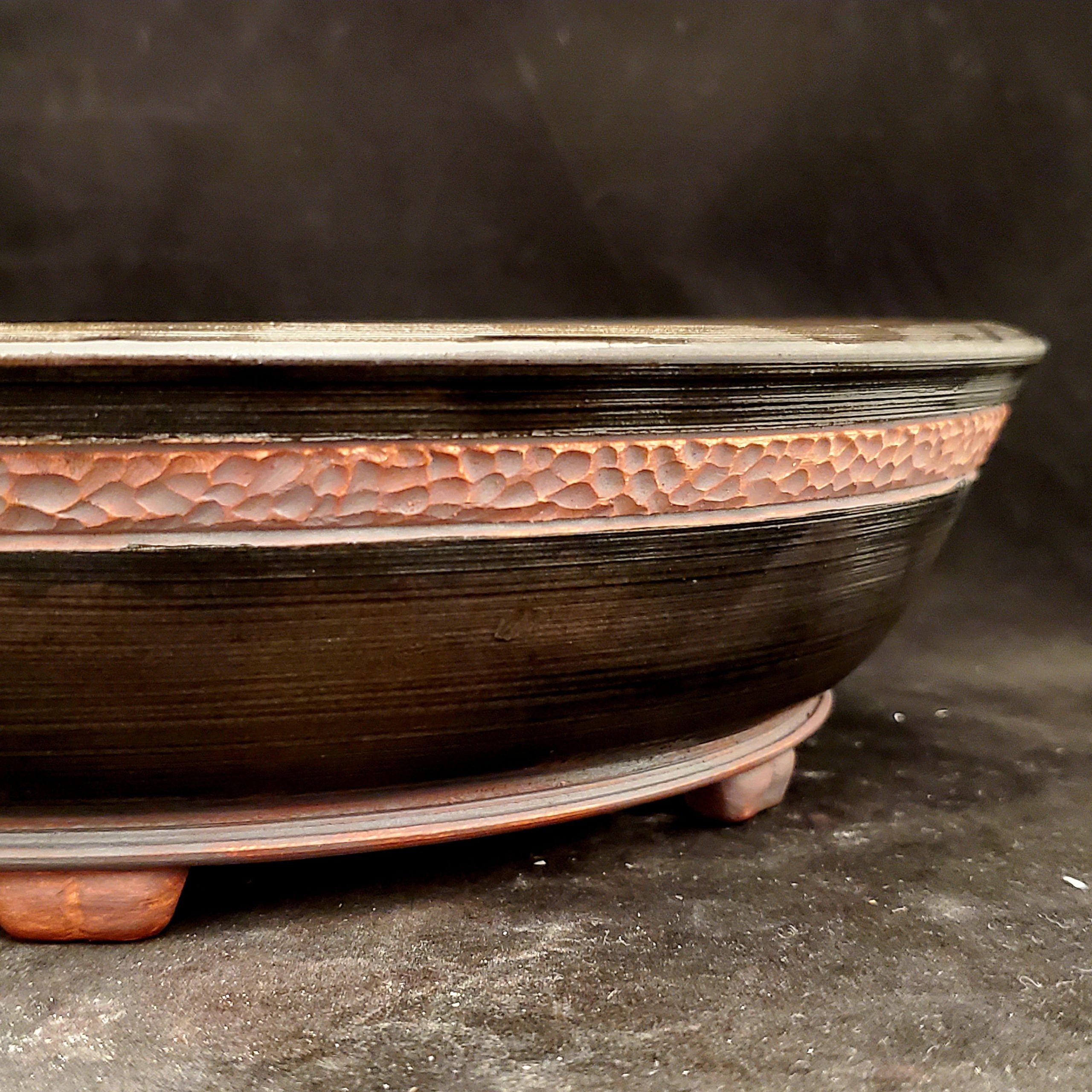 This bonsai pot is a hand – crafted piece made from clay. The interior showcases a natural reddish – brown clay texture, while the exterior is adorned with a dark, glossy glaze. It features a pebbled – textured band, adding a unique decorative touch. With multiple drainage holes and small feet, it’s both functional and aesthetically pleasing.