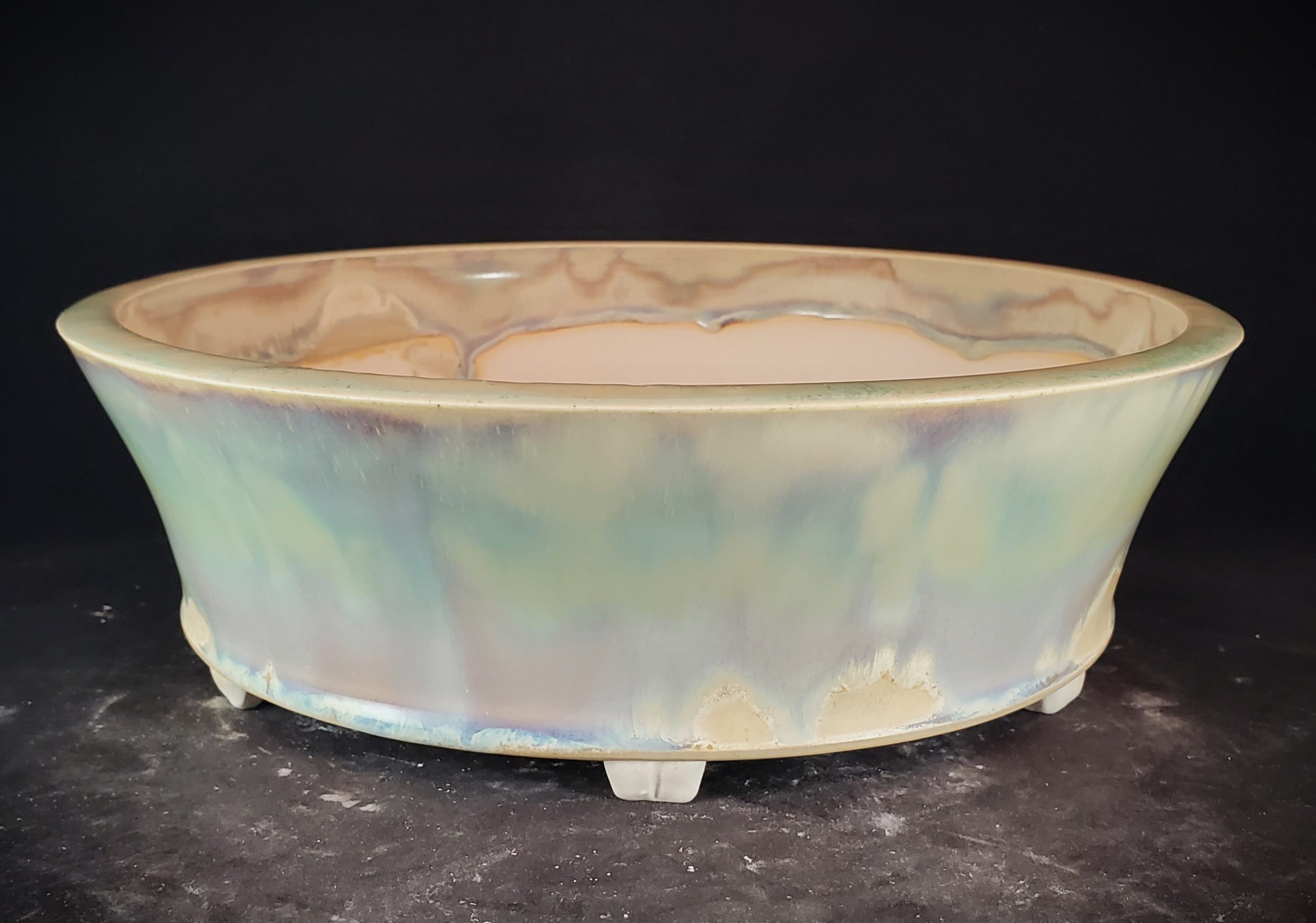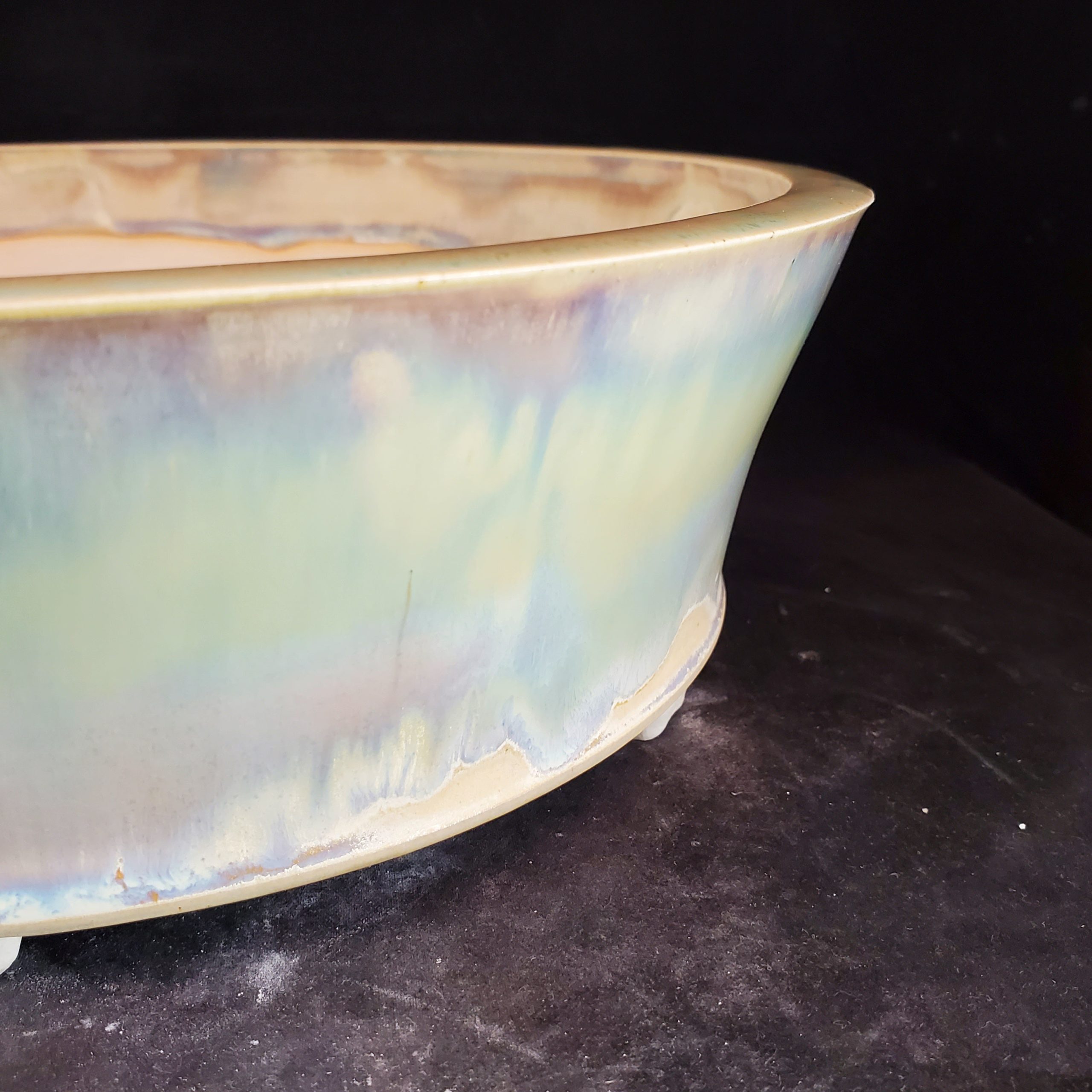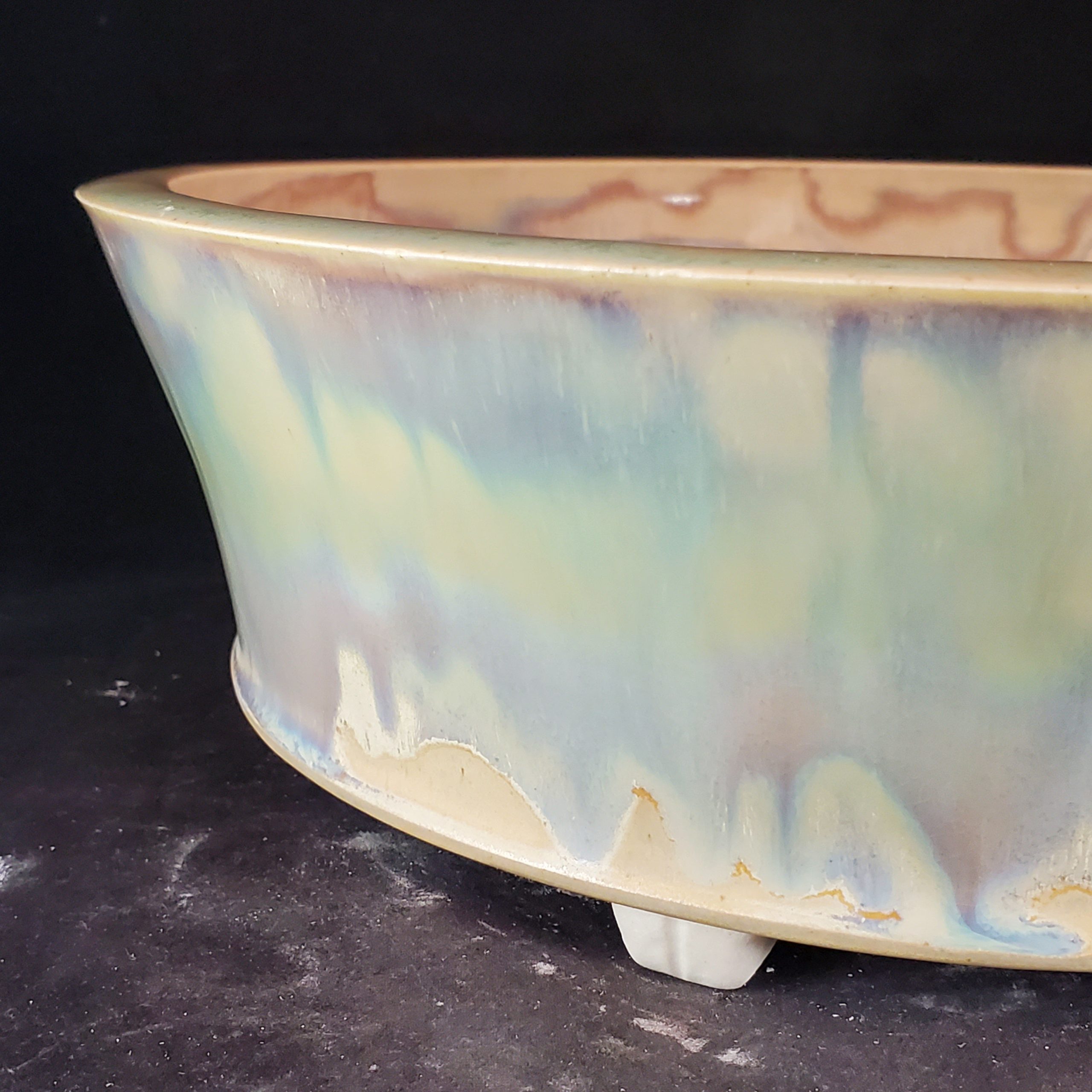 This is a ceramic planter, perfect for bonsai cultivation or decorative plant display. It features a marbled, iridescent exterior glaze with pastel hues and a muted, earthy interior glaze. The pot is elevated on unglazed white feet, and it has multiple drainage holes at the base.