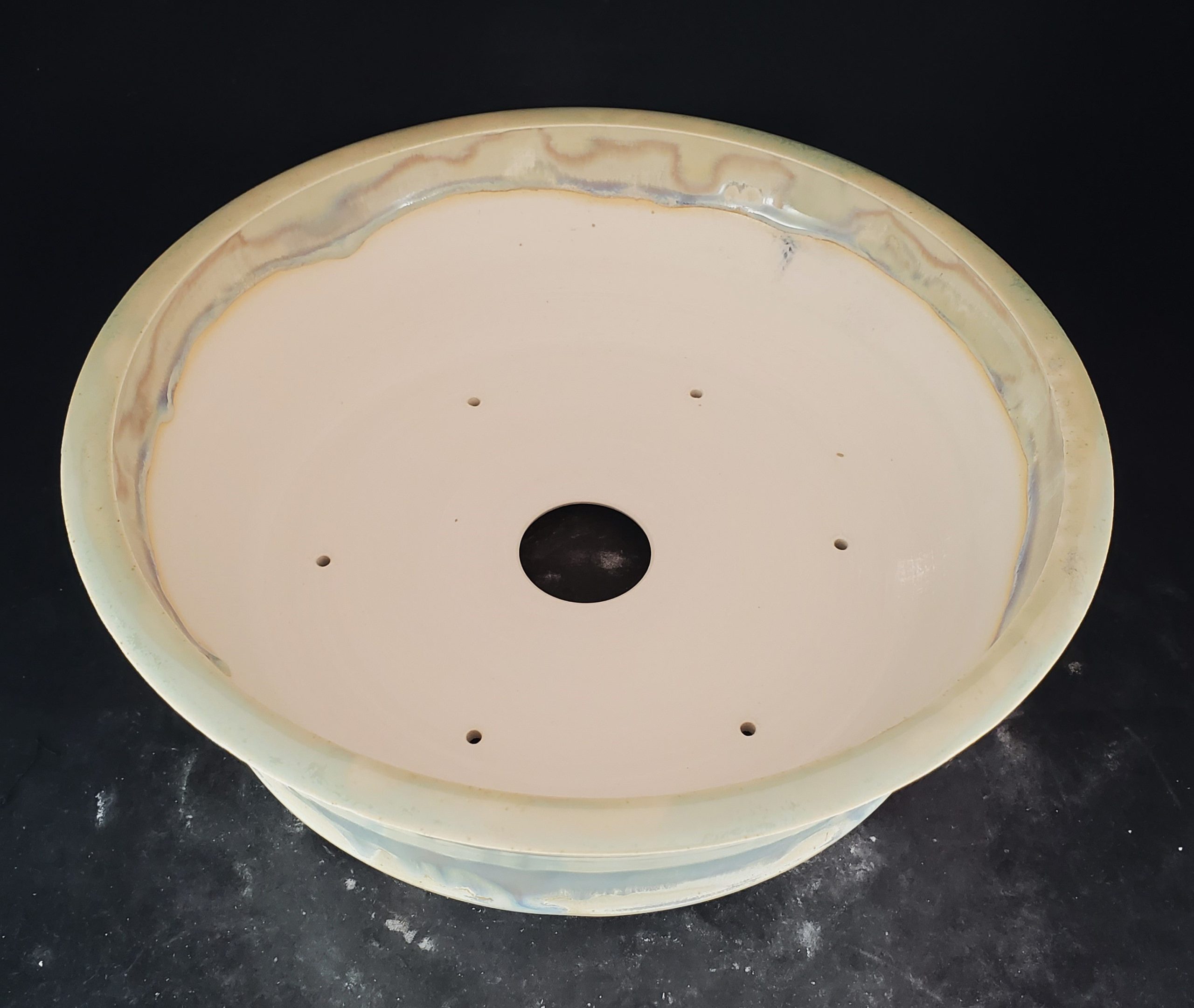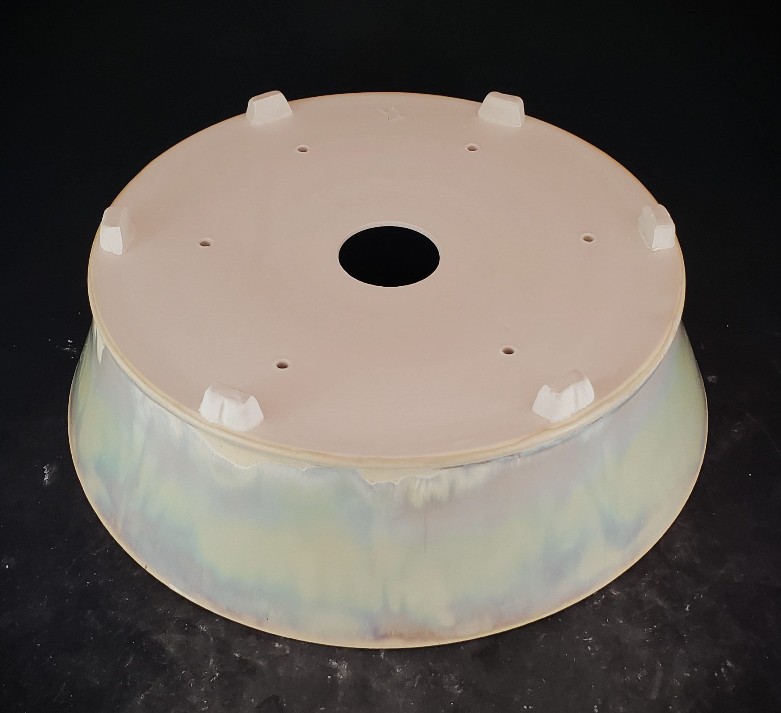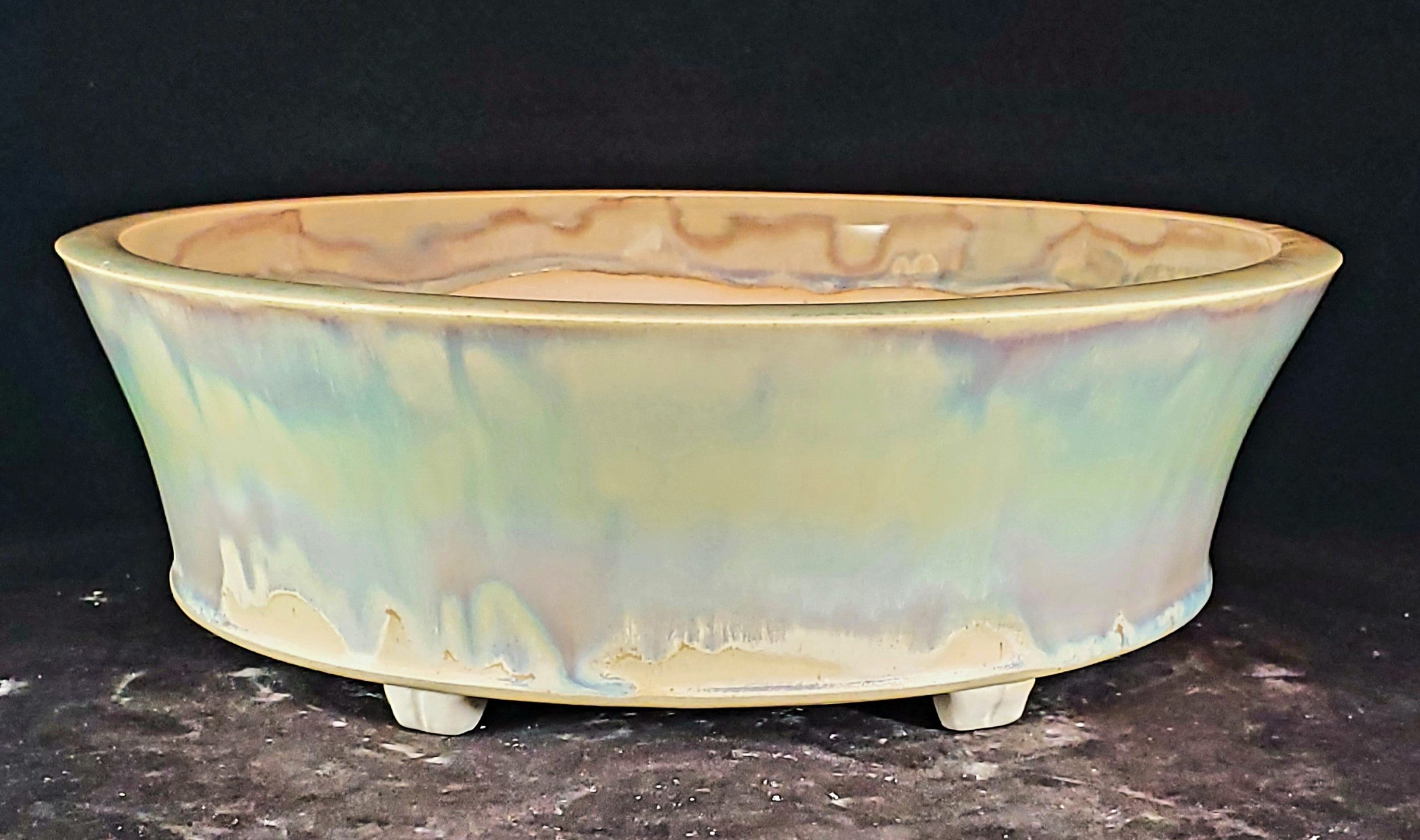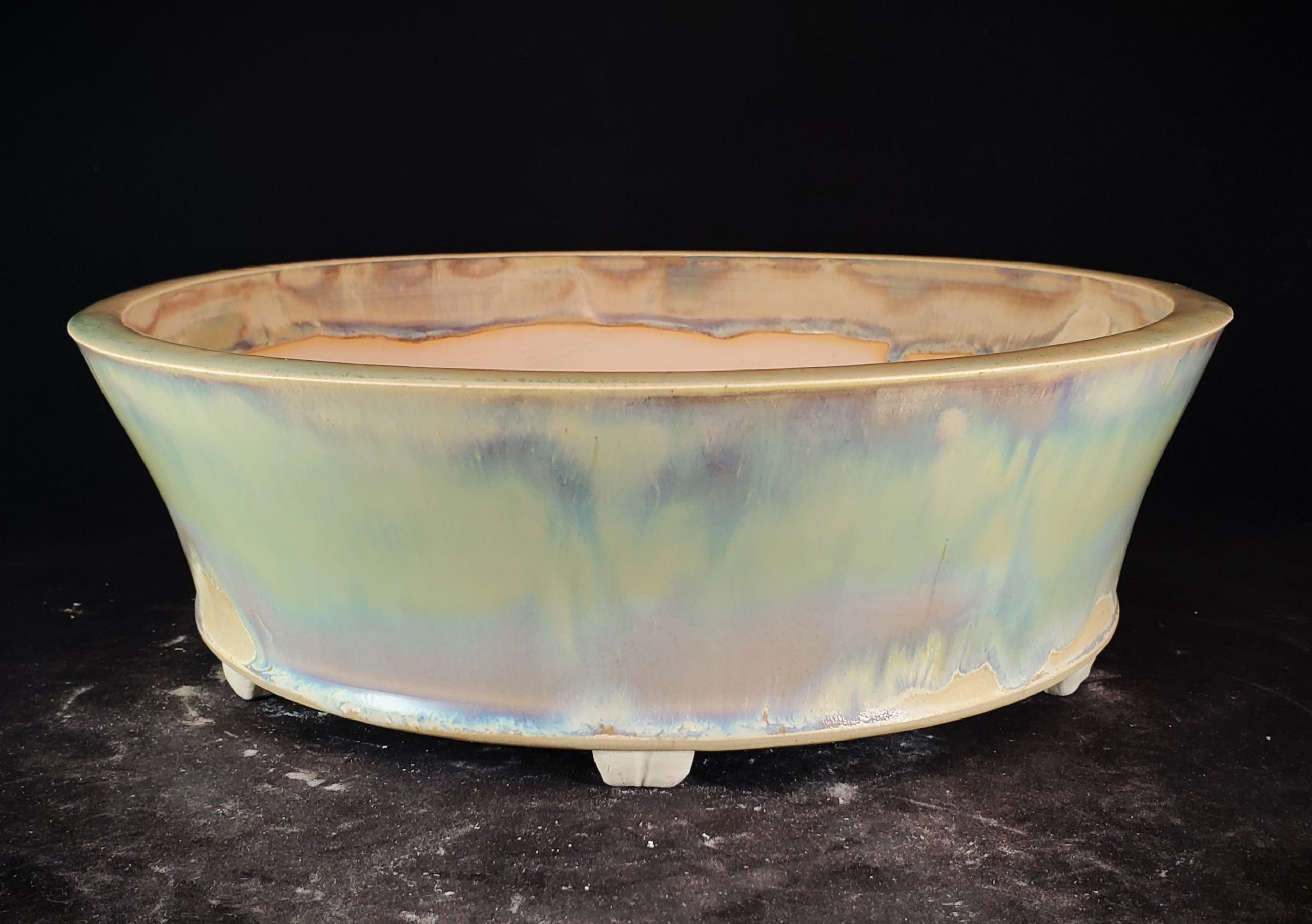 This is a ceramic planter, perfect for bonsai cultivation or decorative plant display. It features a marbled, iridescent exterior glaze with pastel hues and a muted, earthy interior glaze. The pot is elevated on unglazed white feet, and it has multiple drainage holes at the base.