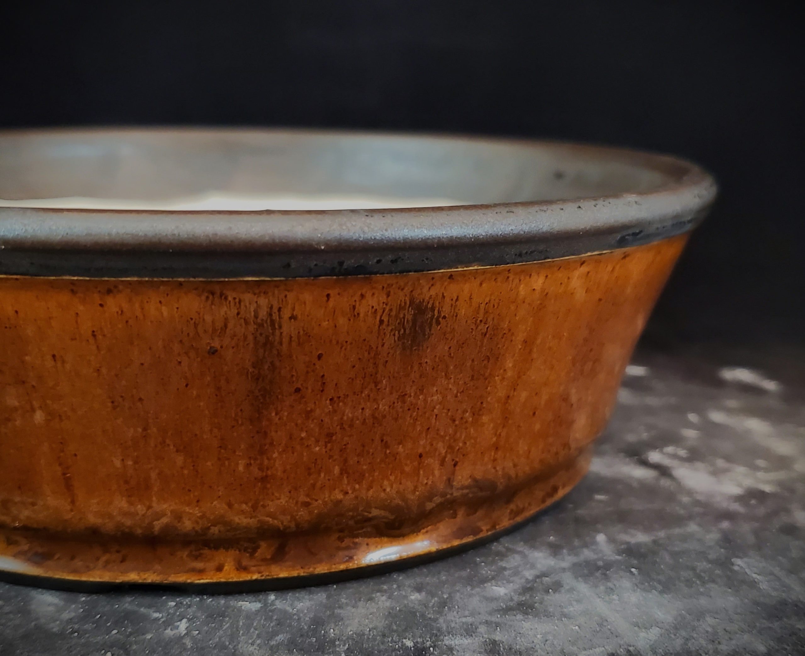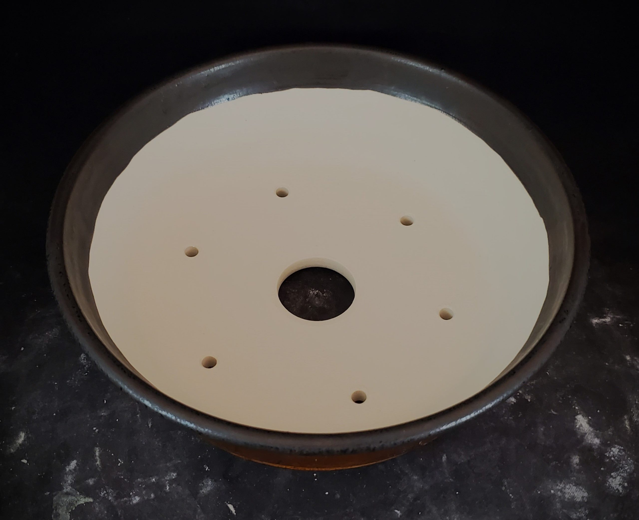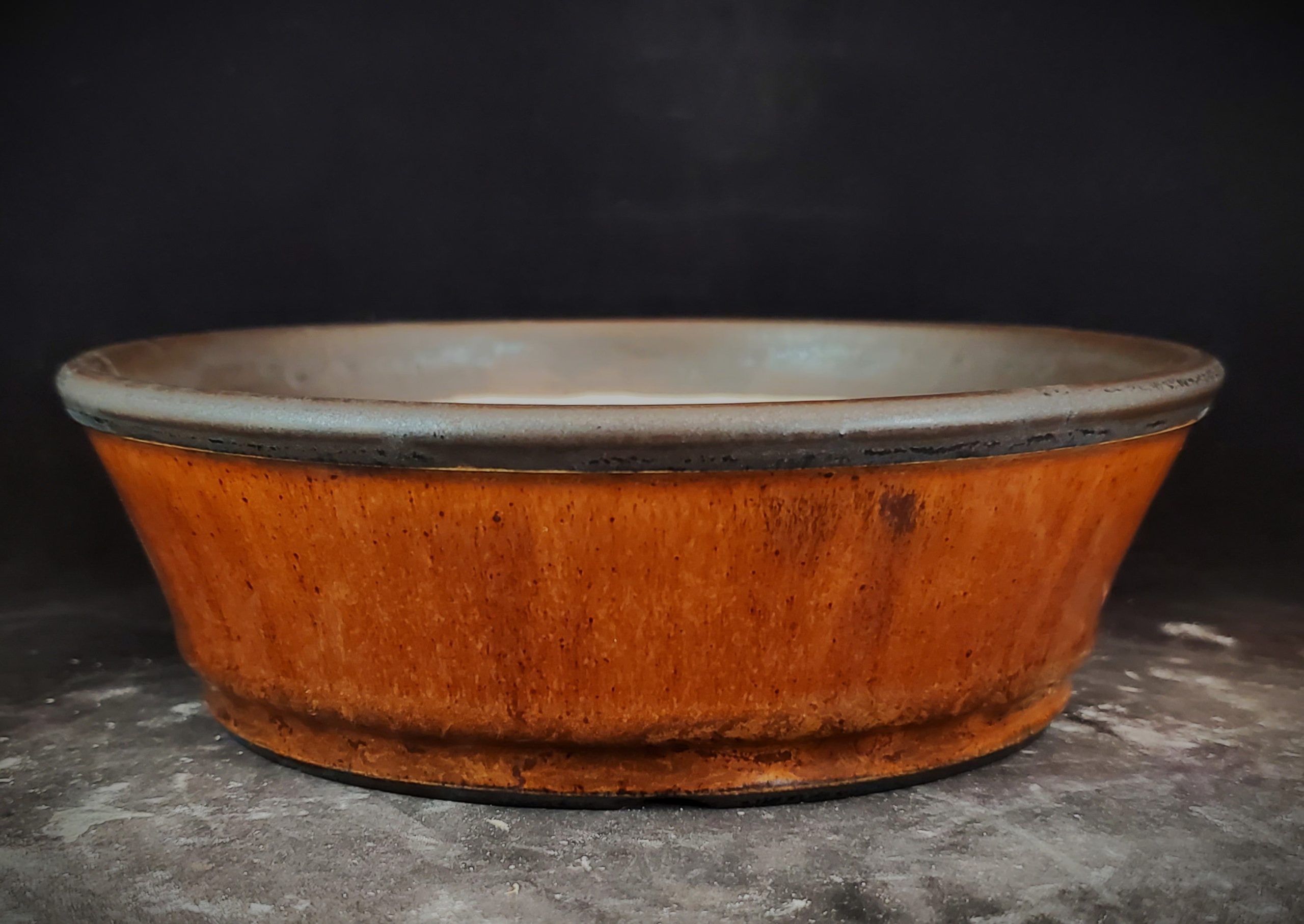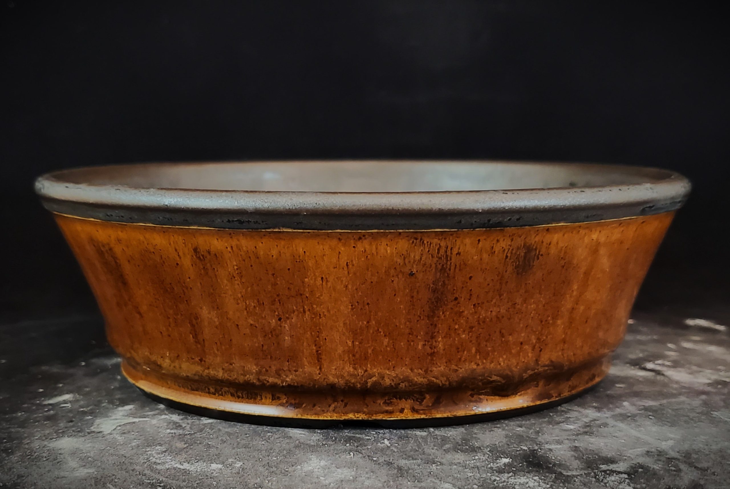 This bonsai pot is a beautifully crafted ceramic piece. It features a two – tone glaze, with a rich brown exterior and a dark gray rim that contrasts with the light cream interior. The pot has multiple small drainage holes in the base, which is perfect for growing bonsai or small potted plants.