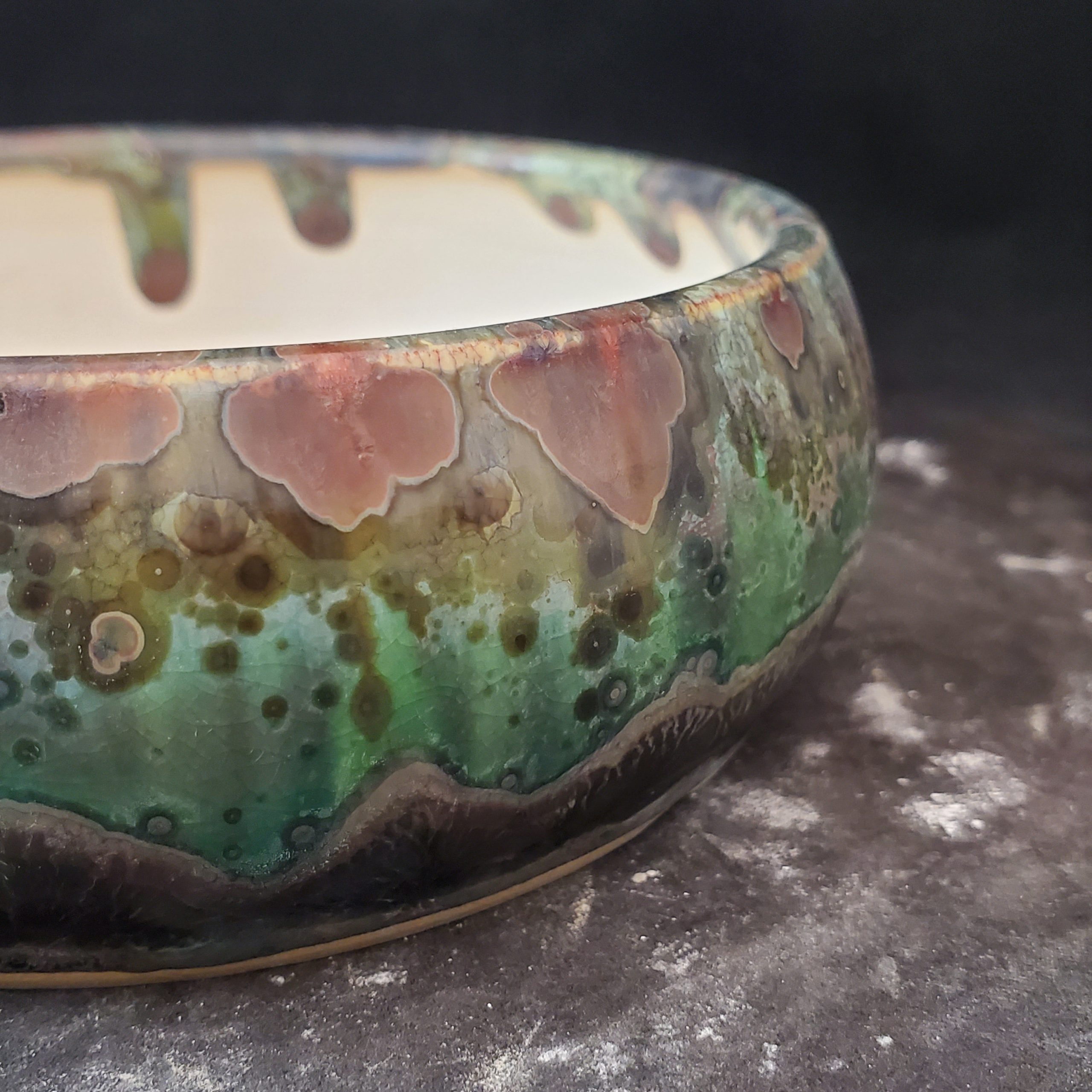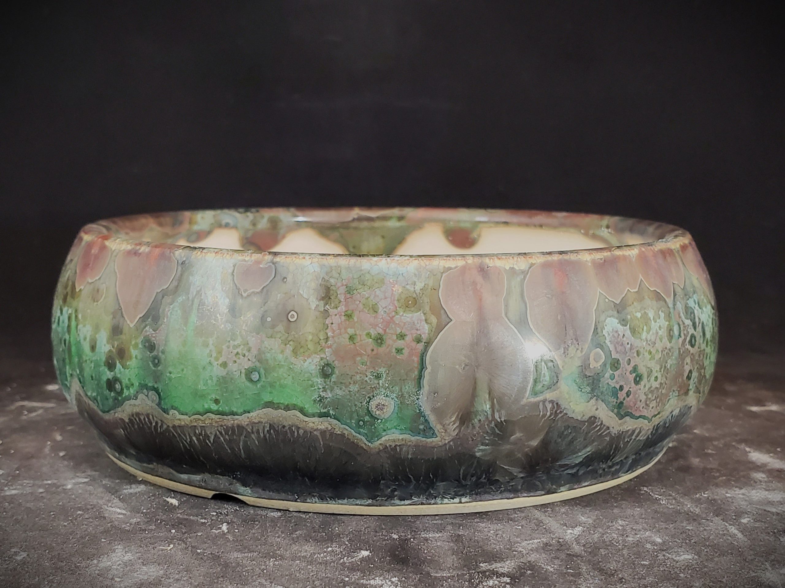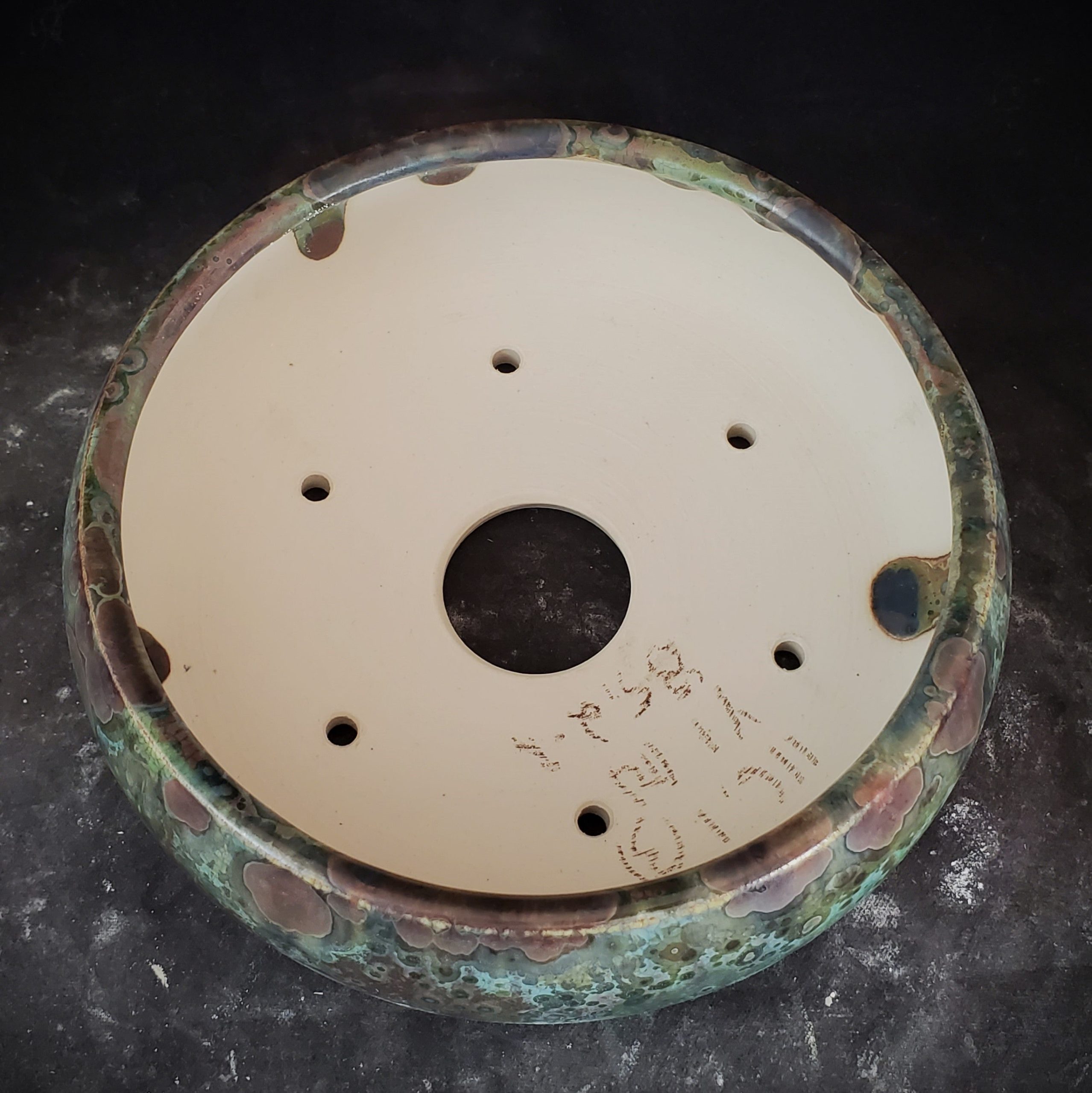 This is a shallow, circular ceramic bonsai pot that offers both functionality and decorative value. It features a beautiful marbled glaze in a mix of green, pink, and brown tones with a crackled texture, creating a natural and aged aesthetic. The presence of drainage holes in the base makes it suitable for plant cultivation.