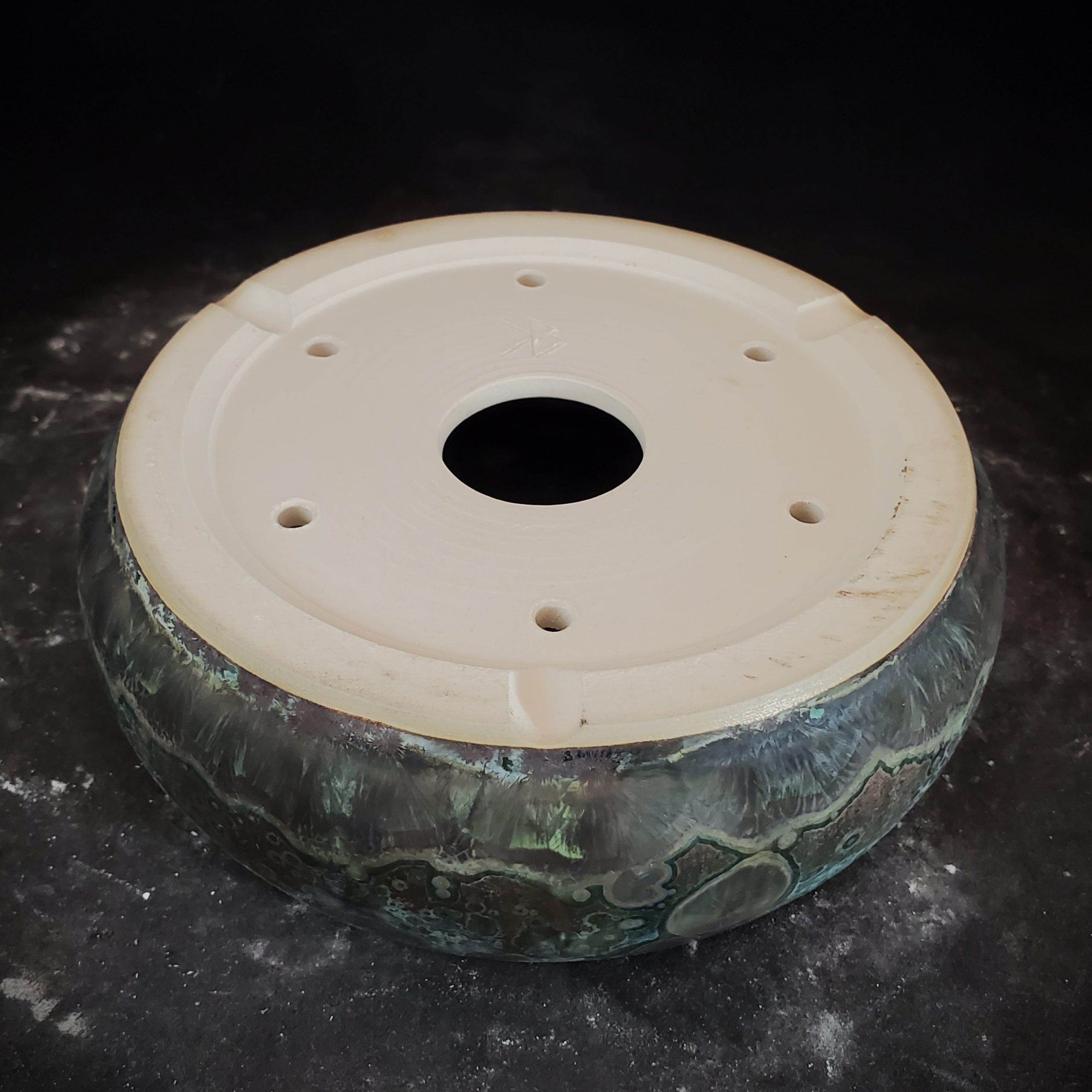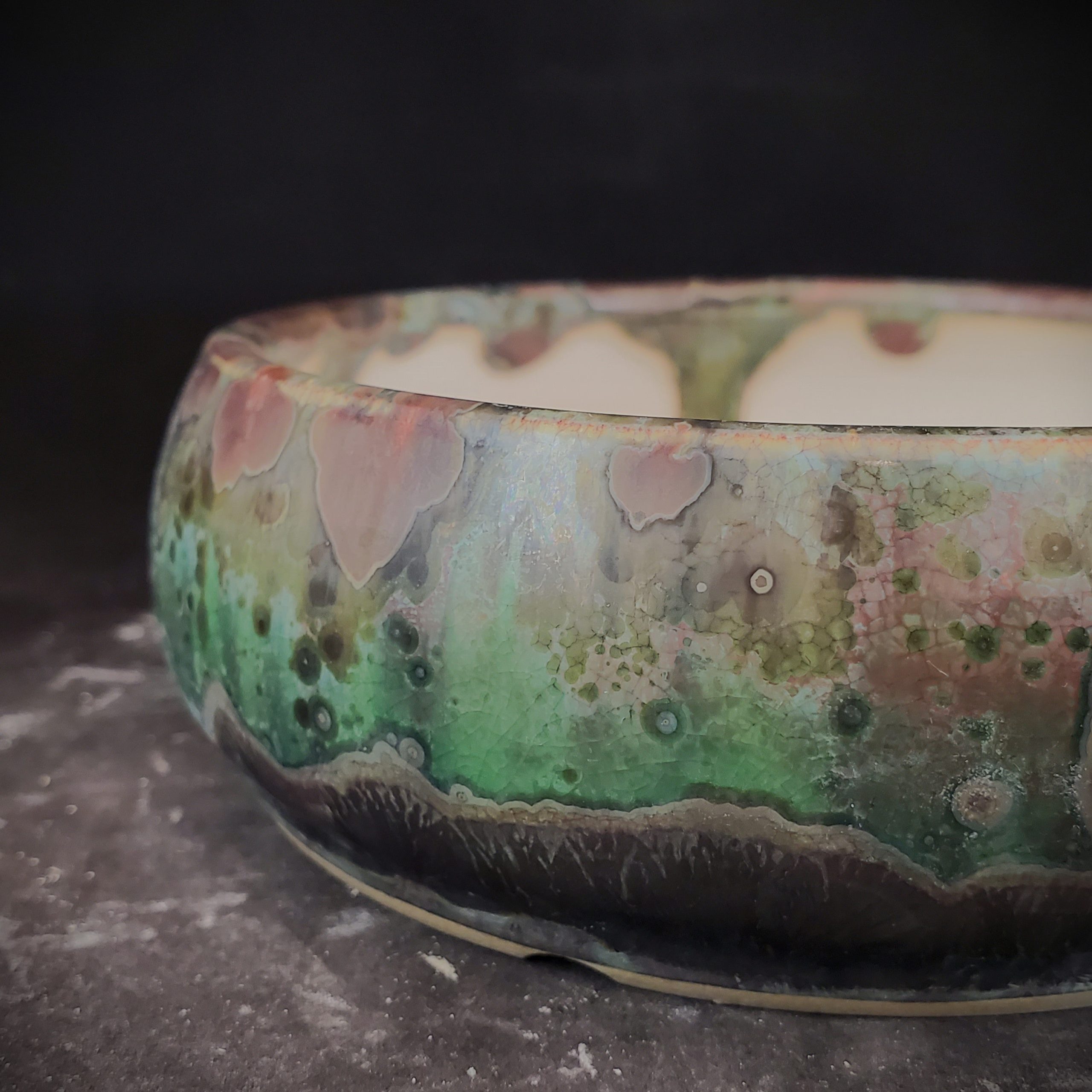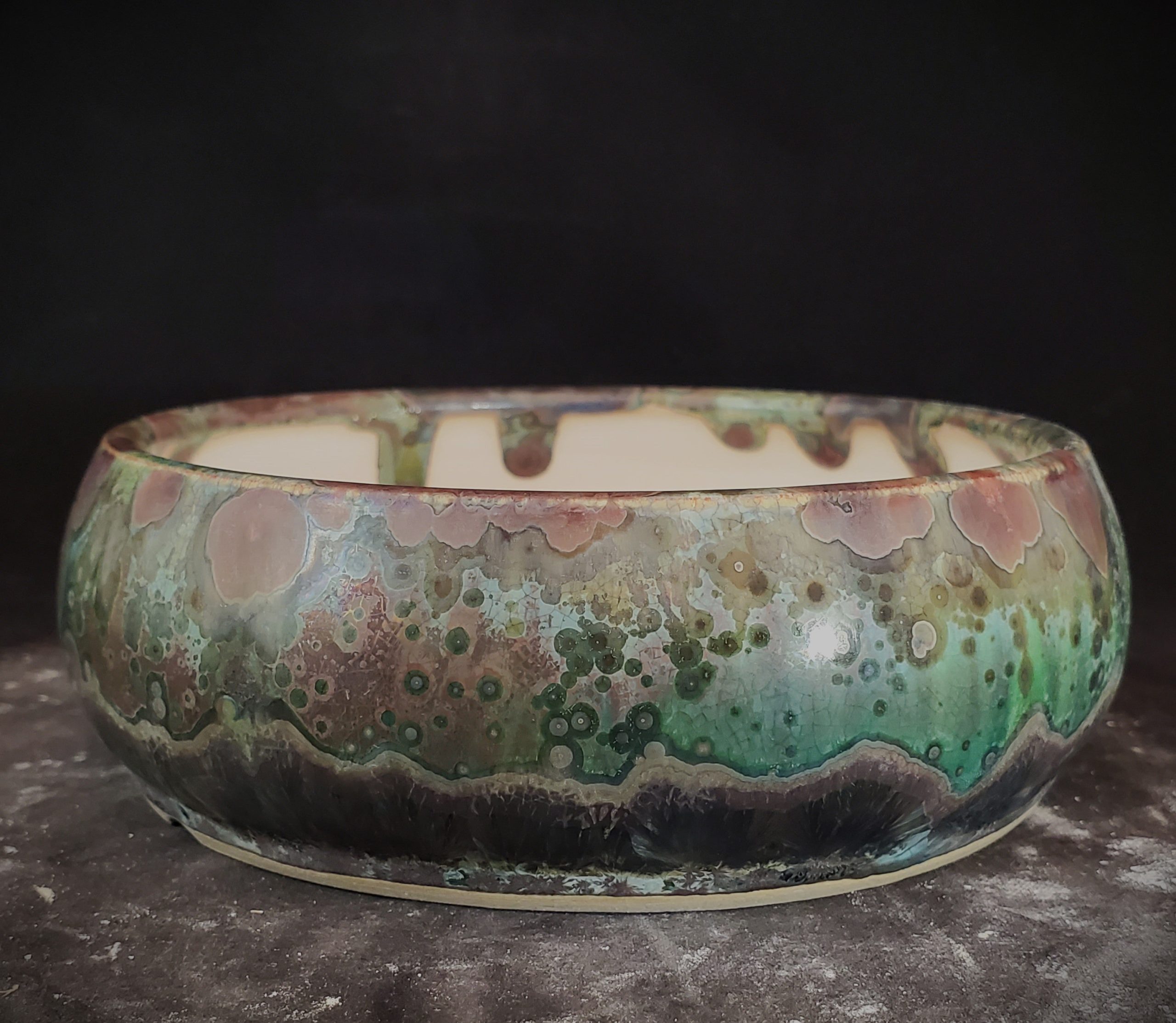 This is a shallow, circular ceramic bonsai pot that offers both functionality and decorative value. It features a beautiful marbled glaze in a mix of green, pink, and brown tones with a crackled texture, creating a natural and aged aesthetic. The presence of drainage holes in the base makes it suitable for plant cultivation.