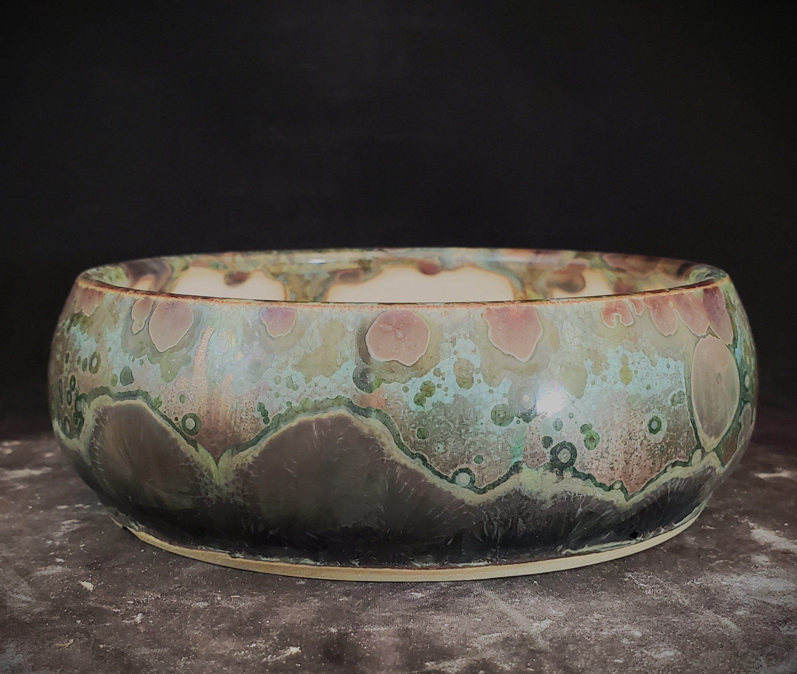 | Patterns | Organic, marbled glaze with crackled texture (crazing), circular spots and bubbles |