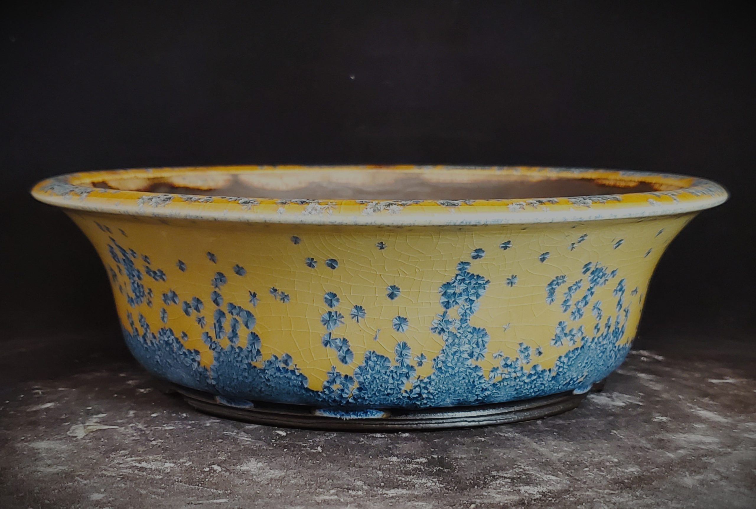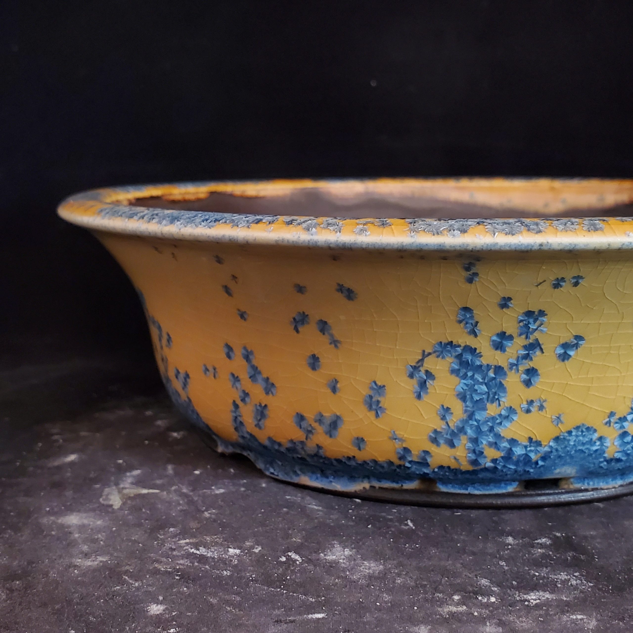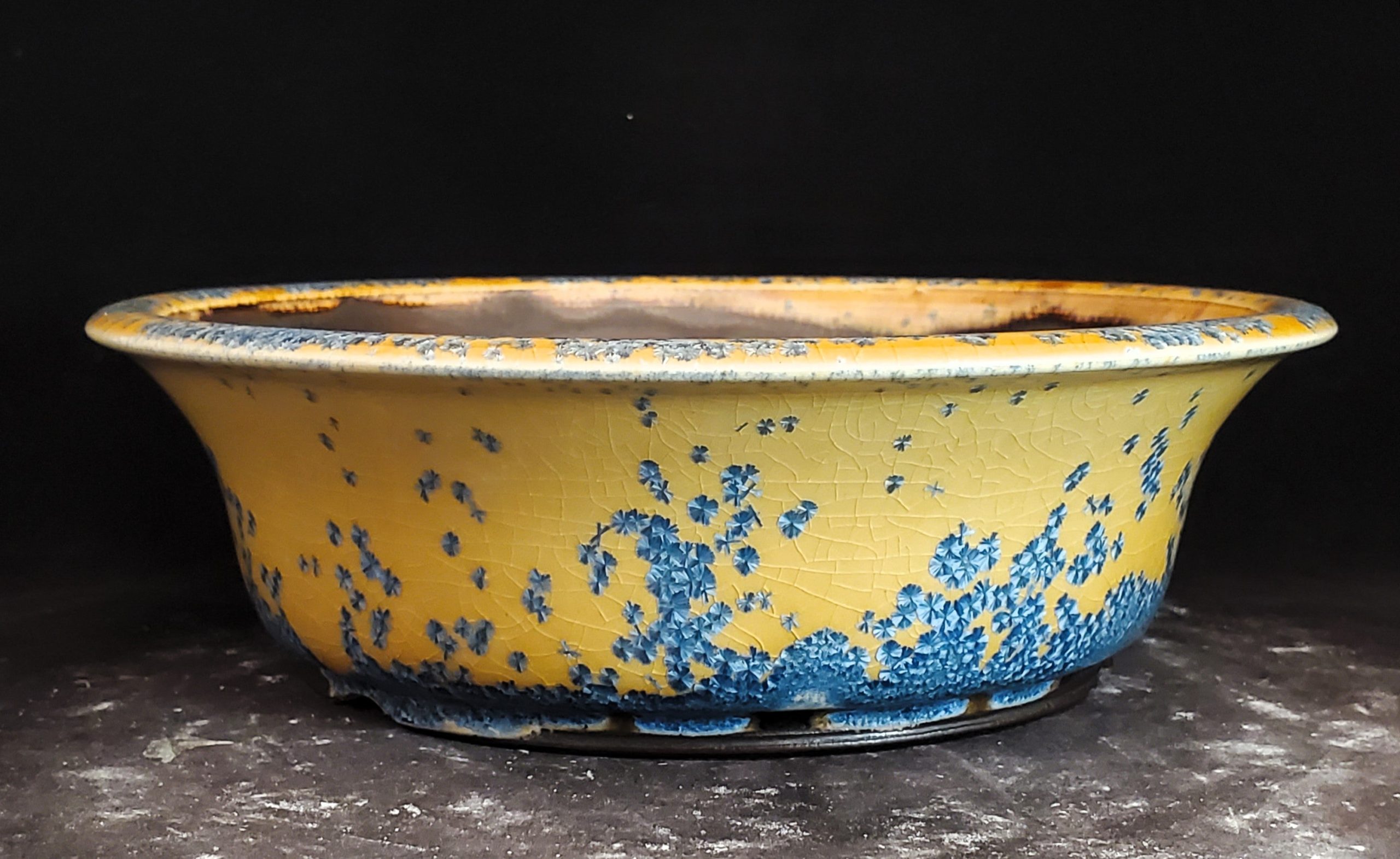 This ceramic bonsai pot is a beautiful and functional piece. It features a bright yellow exterior with blue floral – like patterns and a crackle glaze effect, adding texture and visual appeal. The pot has a wide, shallow shape and multiple drainage holes, making it perfect for growing bonsai trees or other plants.