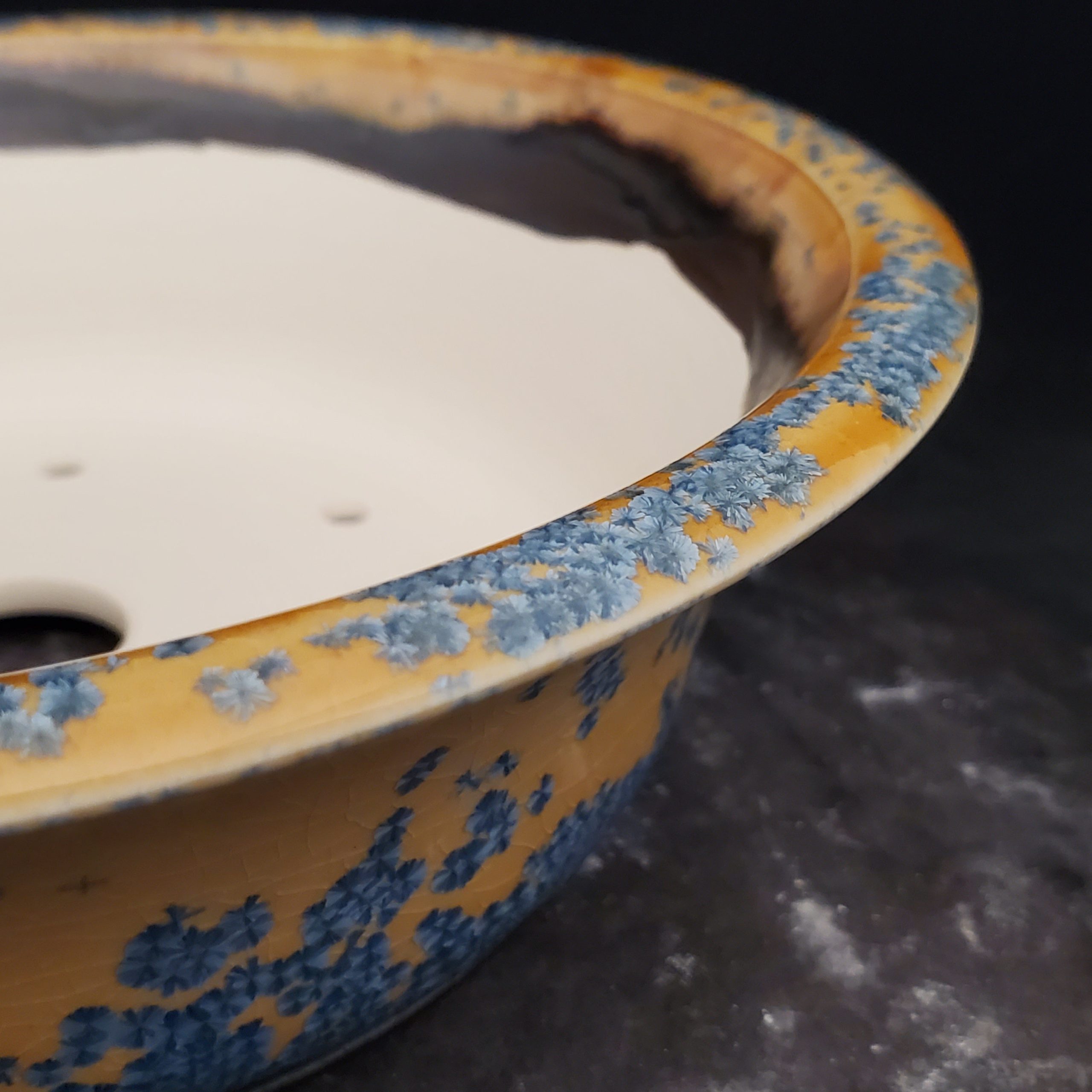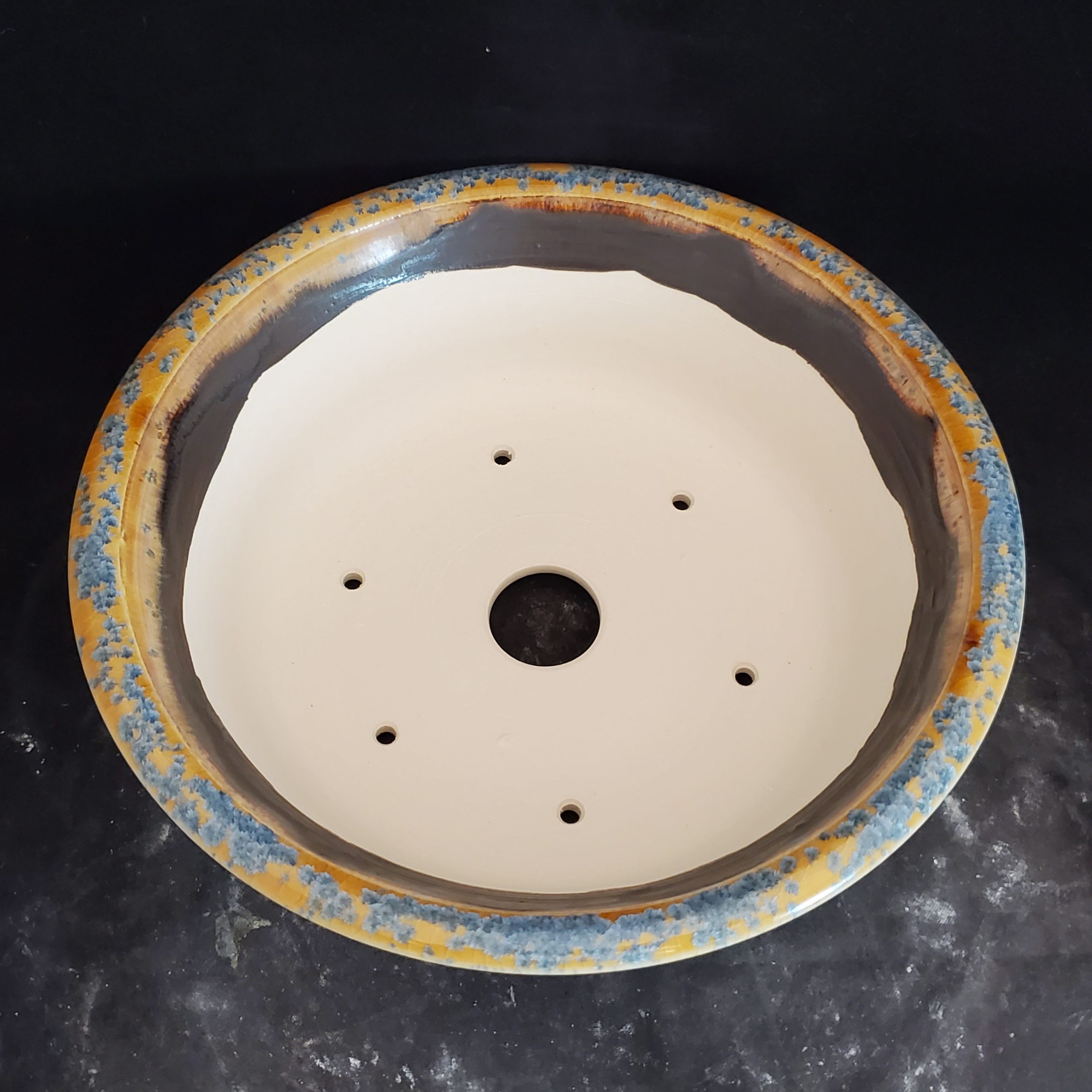 | Accents | Mix of blue and yellow on the rim with white/light gray patterning on the outer edge, darker unglazed brownish area inside, smooth off – white base with drainage holes |