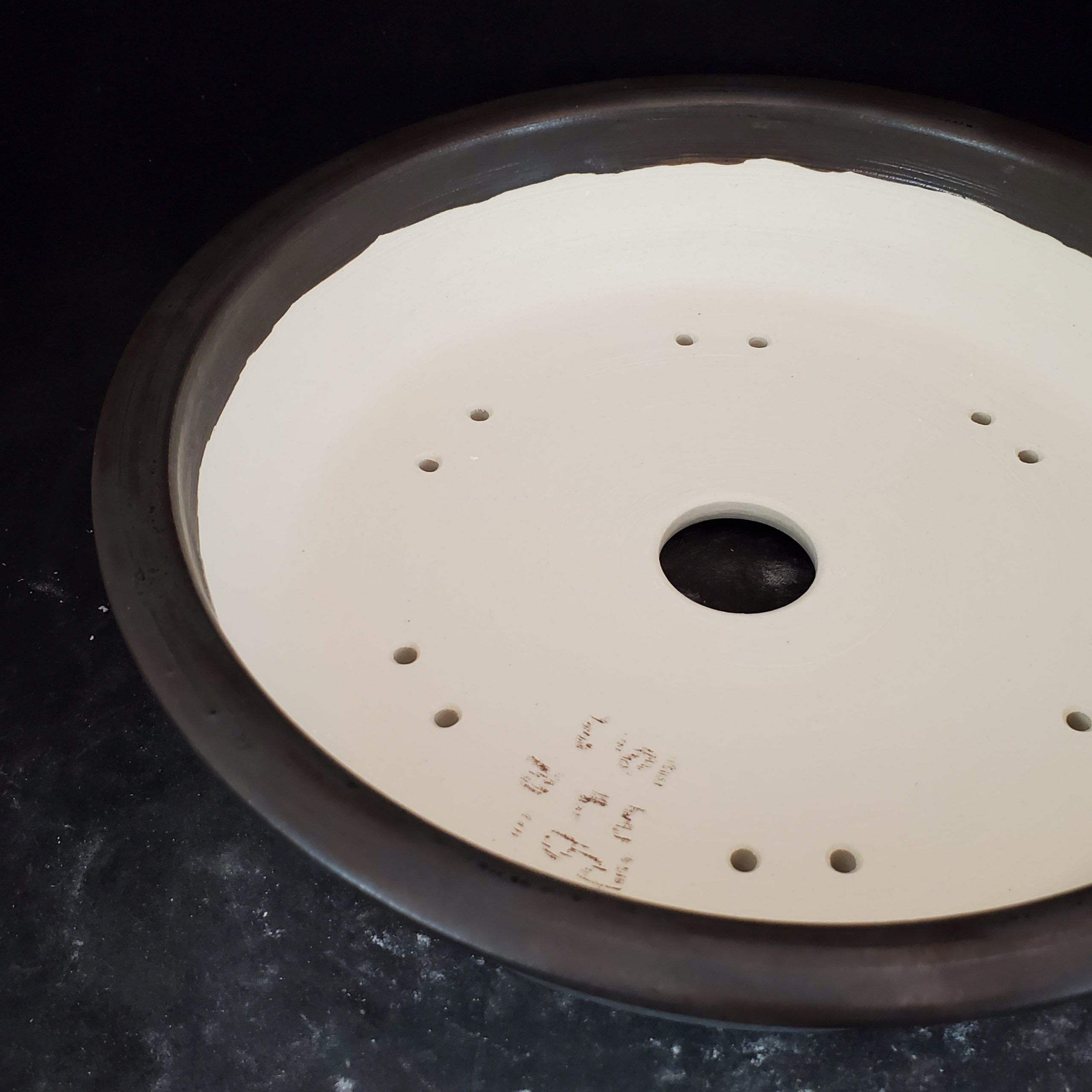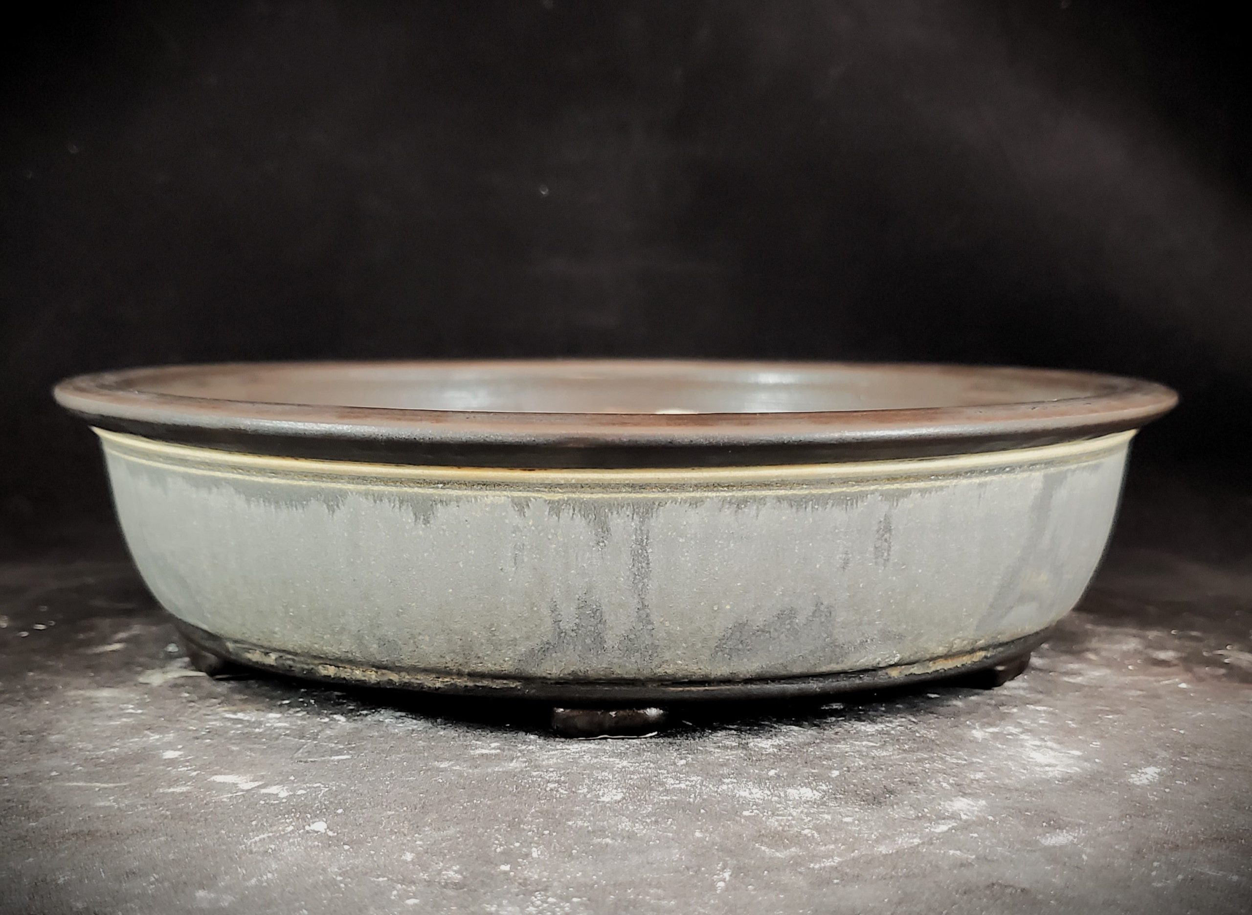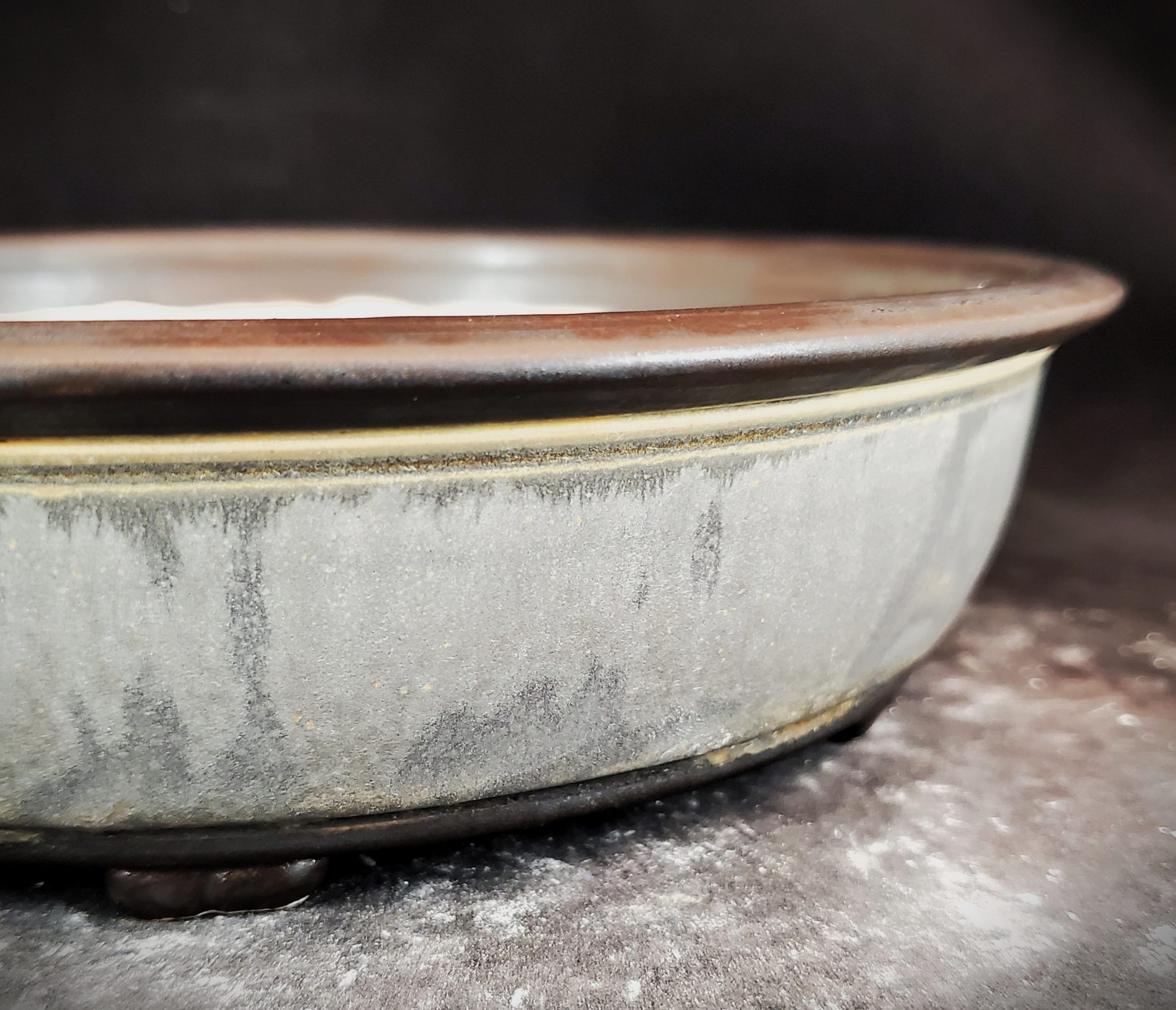 This is a shallow, round bonsai pot crafted from ceramic or stoneware. It features a light gray/white base with darker gray/blueish streaks and drips on the main body, separated by a thin yellowish – brown line from the dark brown/blackish – brown outer rim. With multiple drainage holes and a footed base, it’s perfect for growing and displaying small plants.