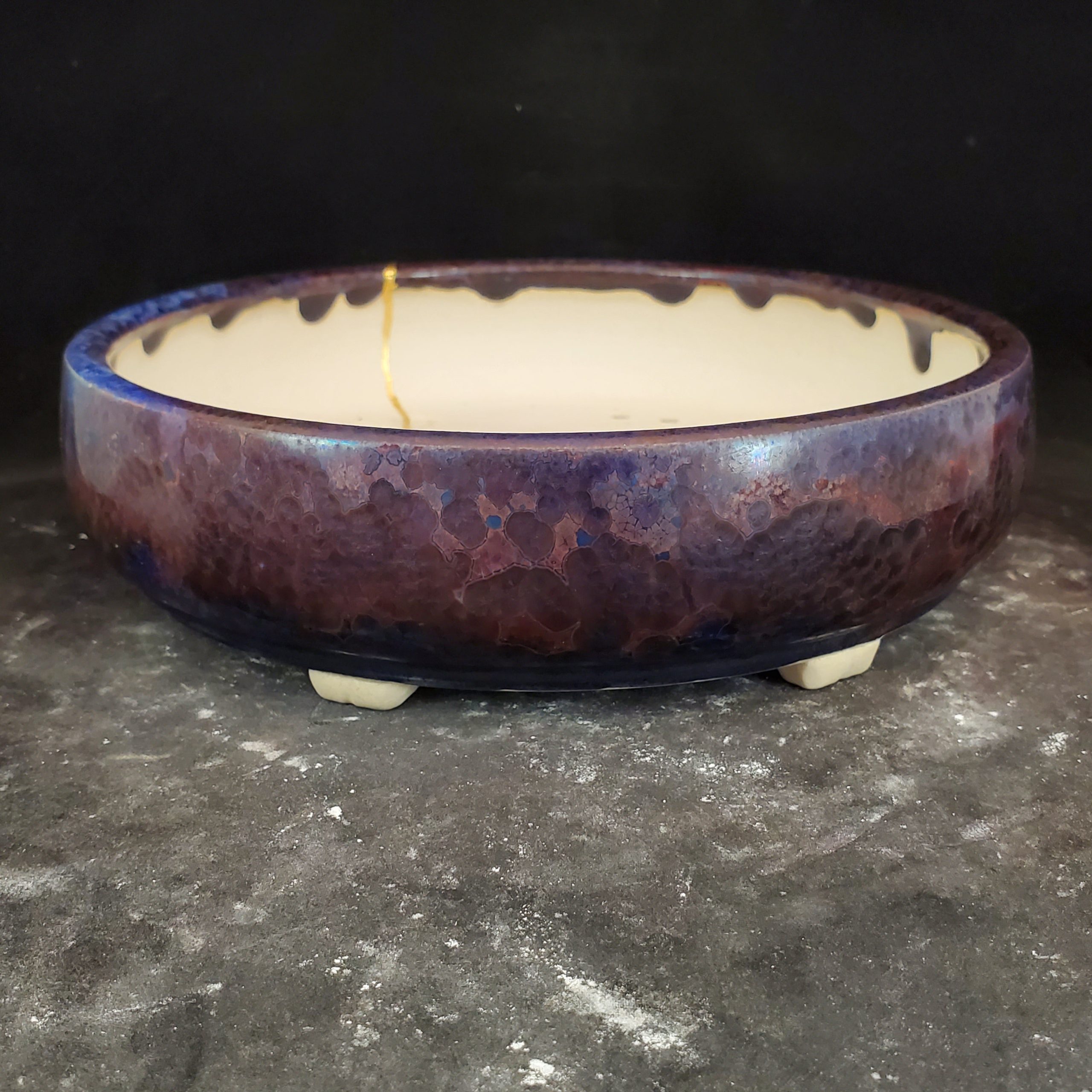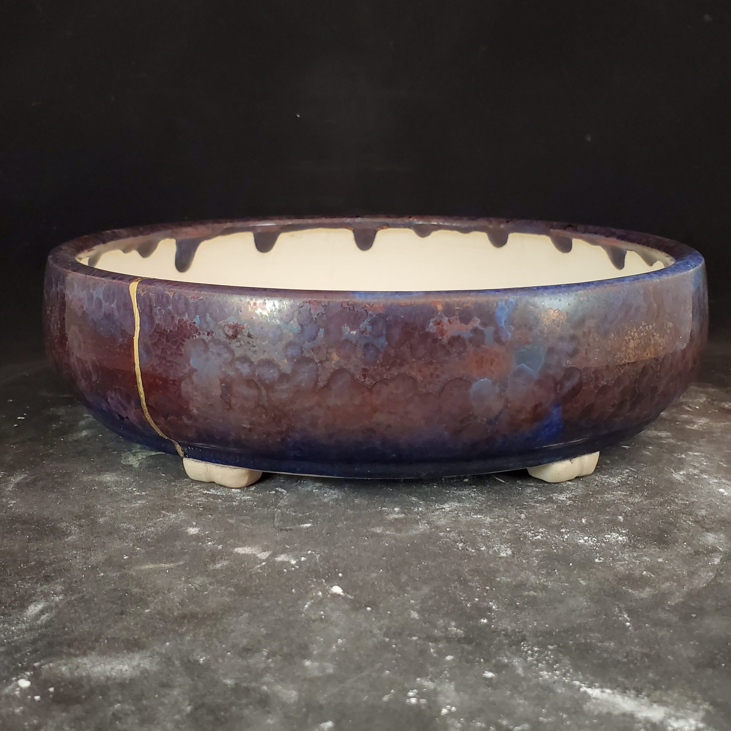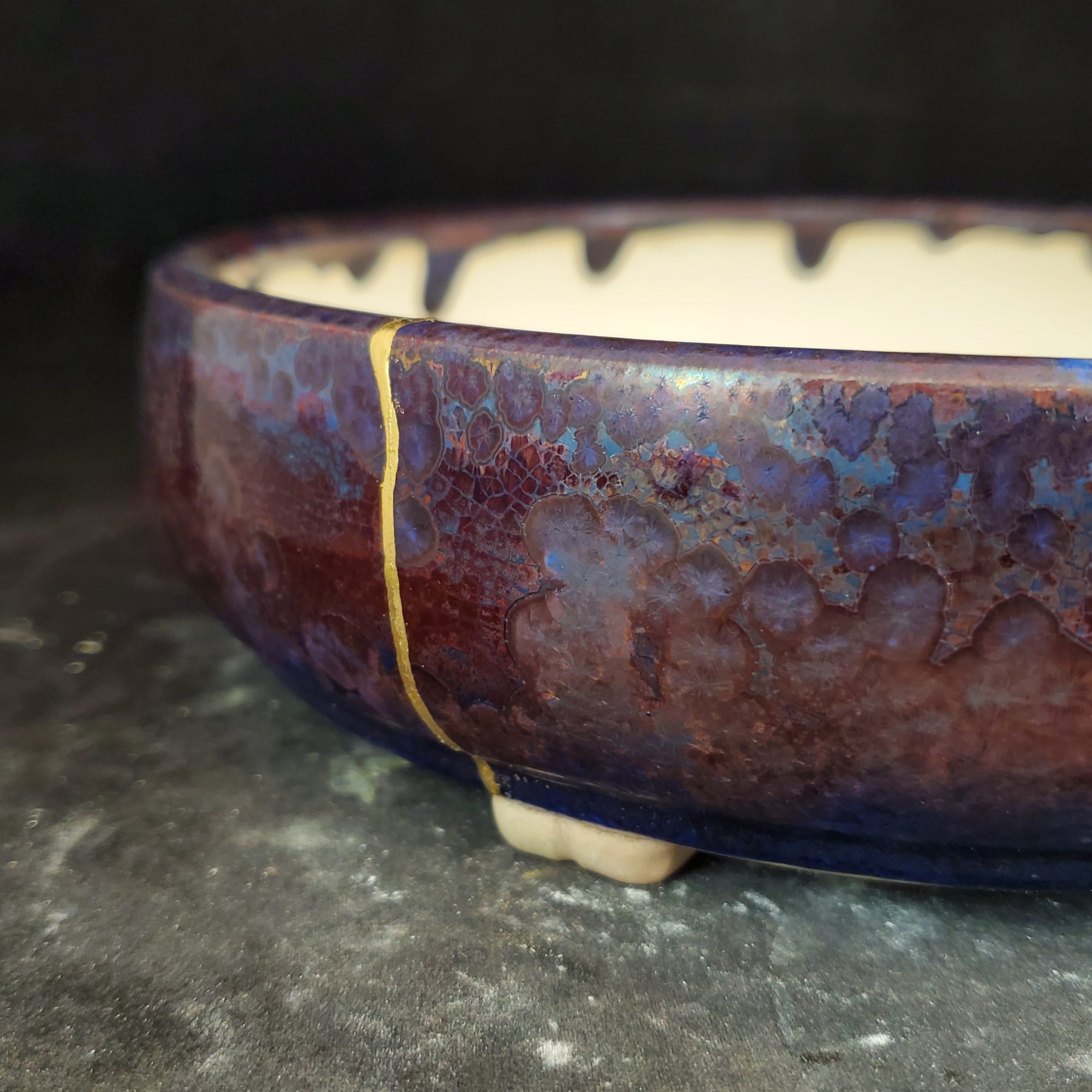 This is a small to medium-sized, circular bonsai pot crafted from glazed ceramic. The exterior showcases a crackled glaze with iridescent patterns in deep blue, purple, and brownish – red hues, while the interior is light with dark glaze drips. A kintsugi repair with a gold line adds an artistic touch, and the pot is handmade in the US.