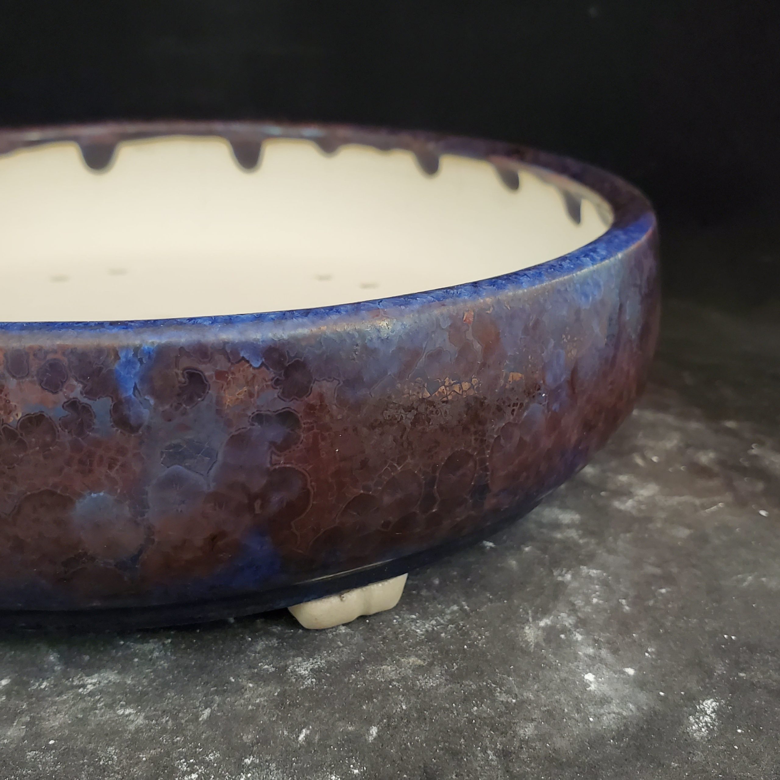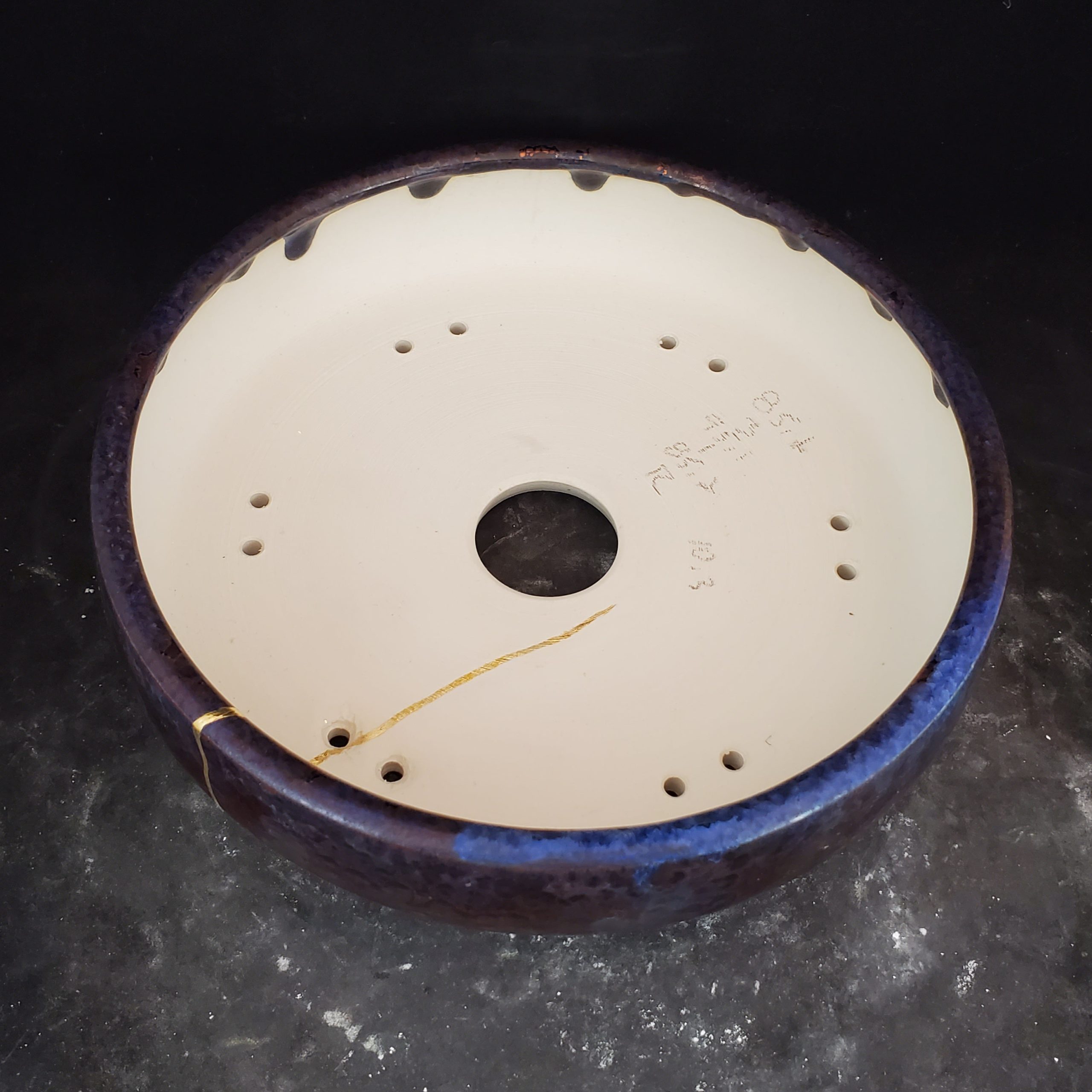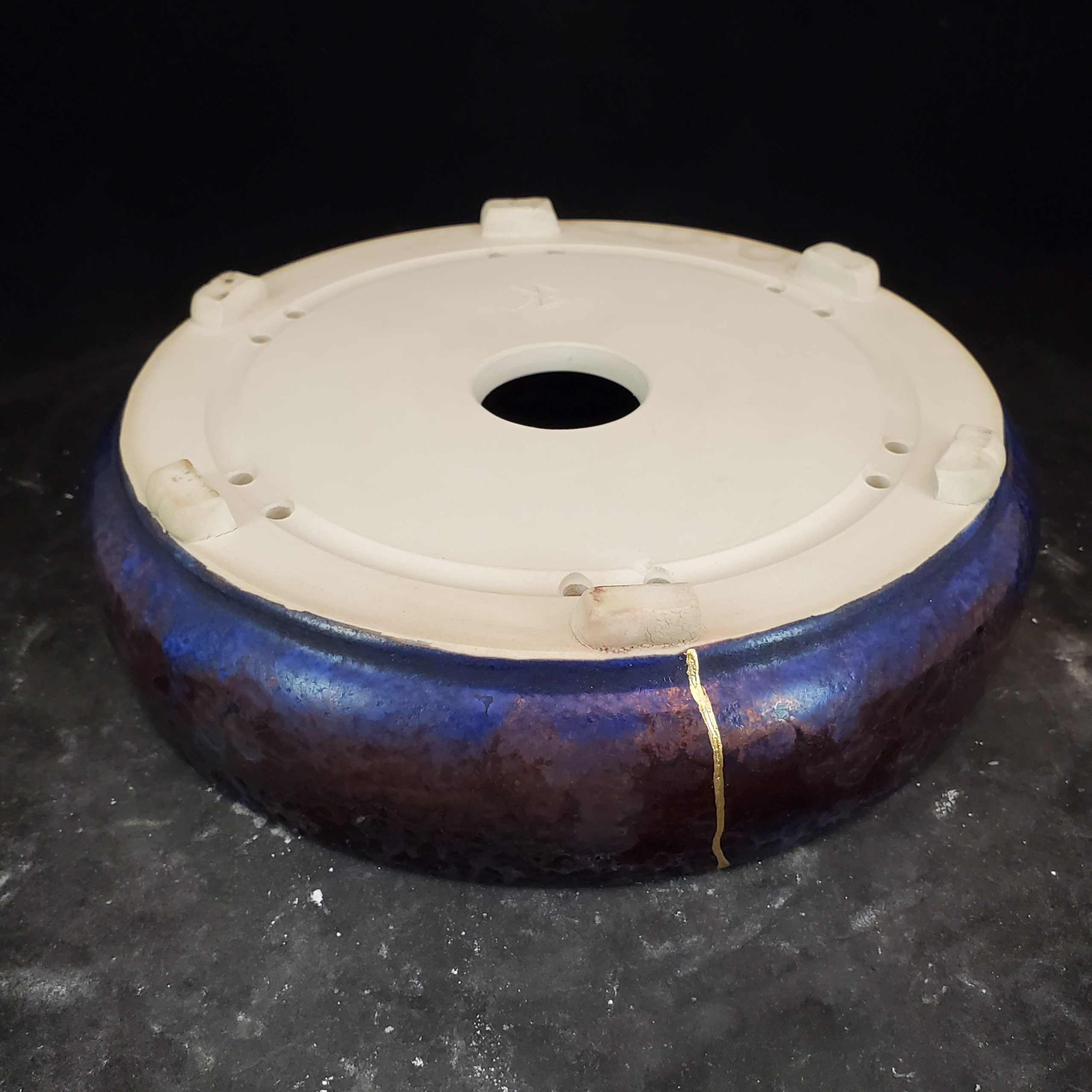 This is a small to medium-sized, circular bonsai pot crafted from glazed ceramic. The exterior showcases a crackled glaze with iridescent patterns in deep blue, purple, and brownish – red hues, while the interior is light with dark glaze drips. A kintsugi repair with a gold line adds an artistic touch, and the pot is handmade in the US.