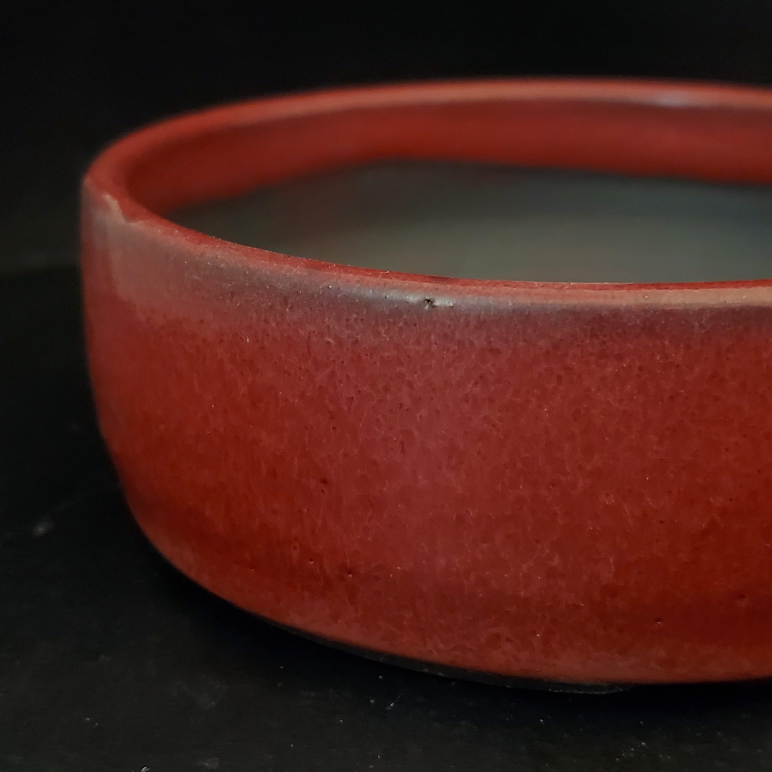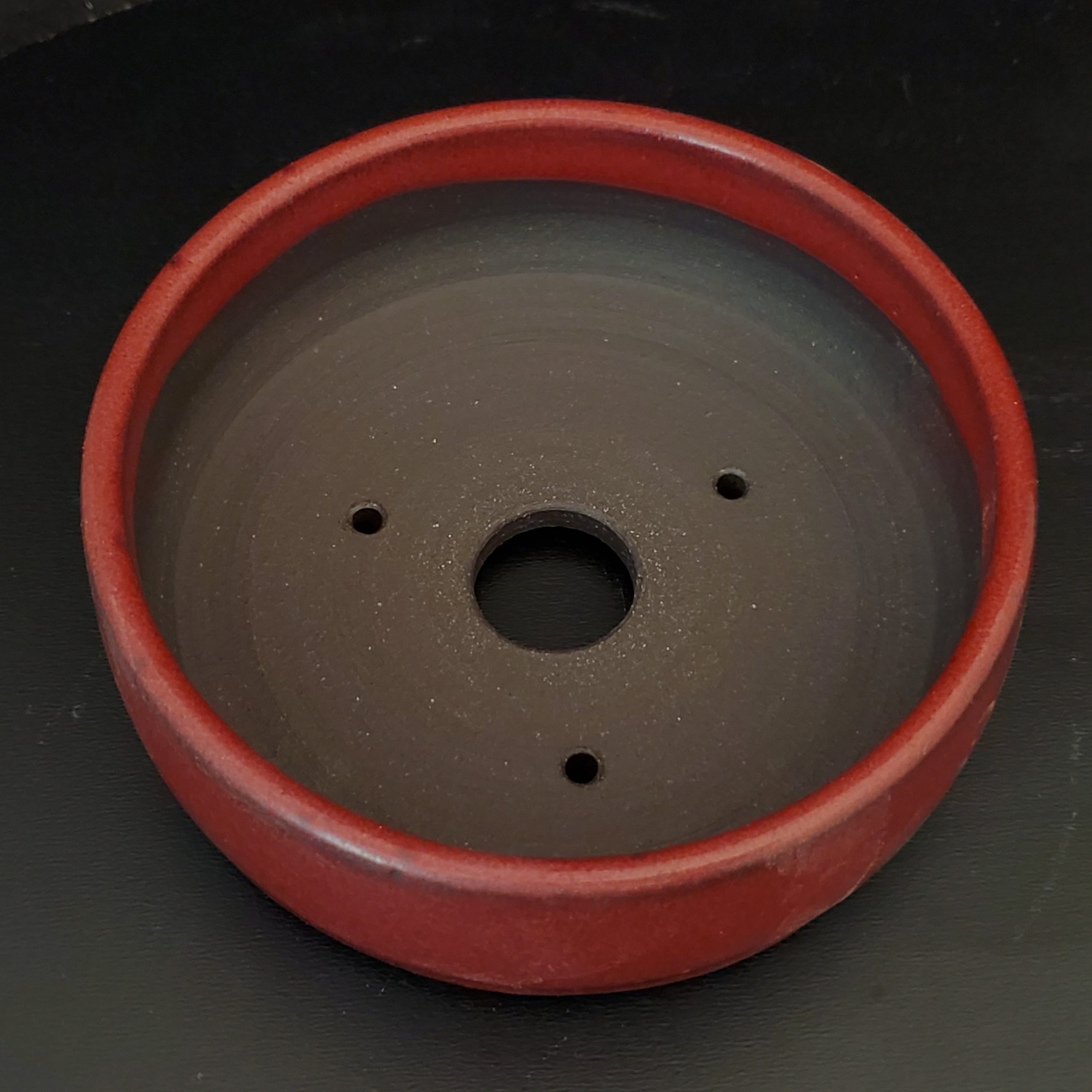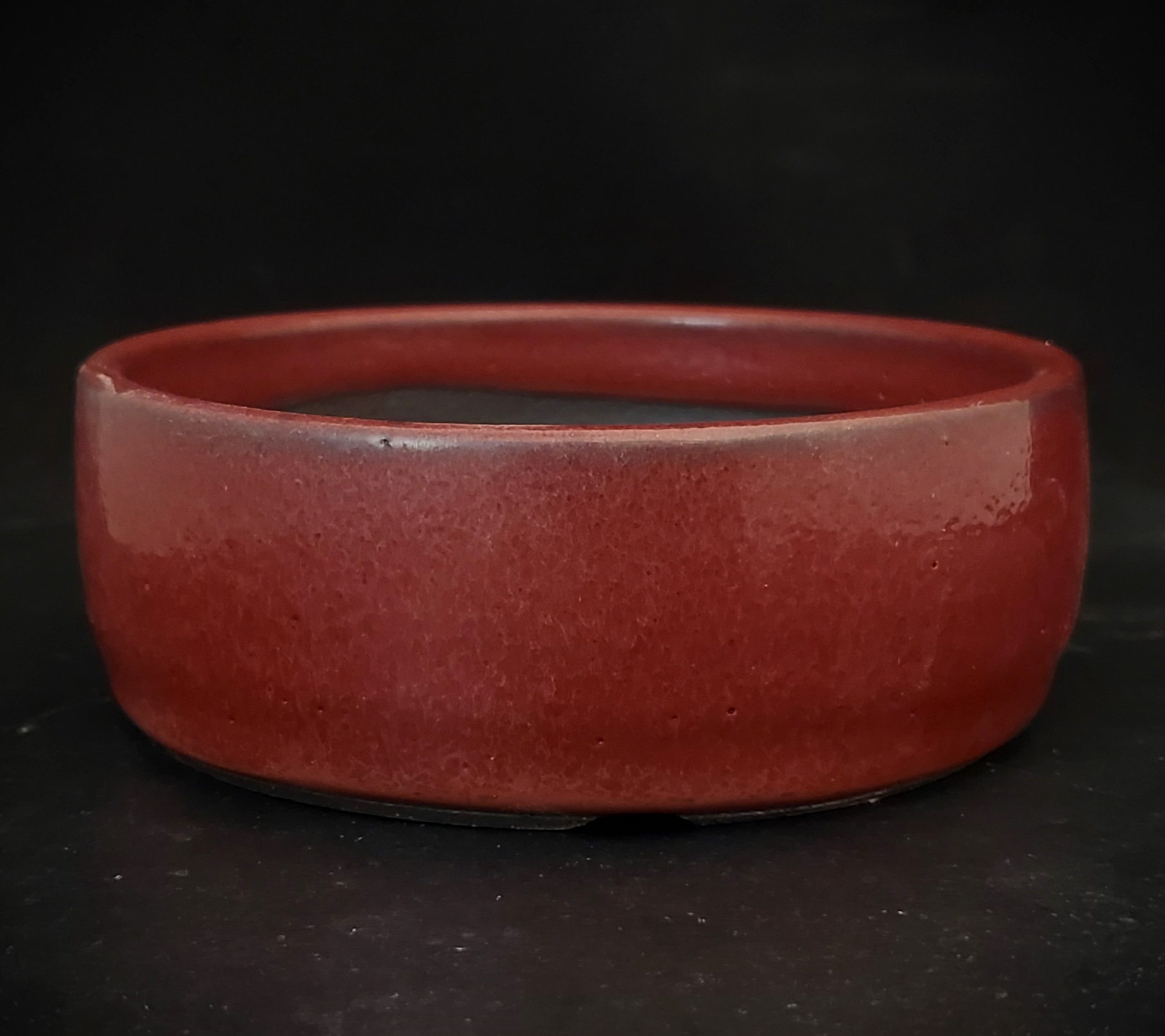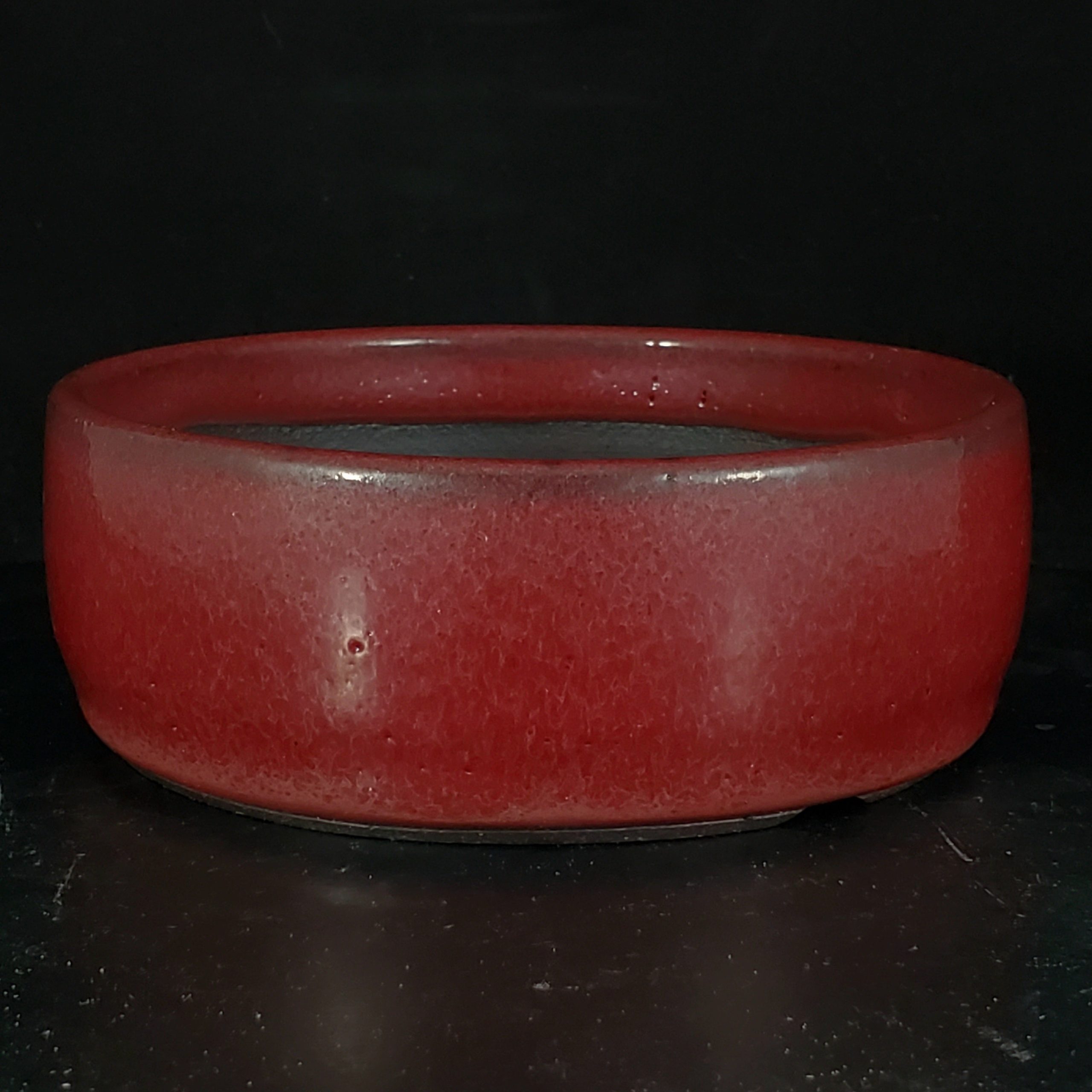 This is a small to medium-sized bonsai pot crafted from ceramic. It features a beautiful red glazed exterior with subtle variations and an unglazed dark brown/black interior. The pot has drainage holes at the base and a flat bottom, making it perfect for growing small plants or as a decorative display.