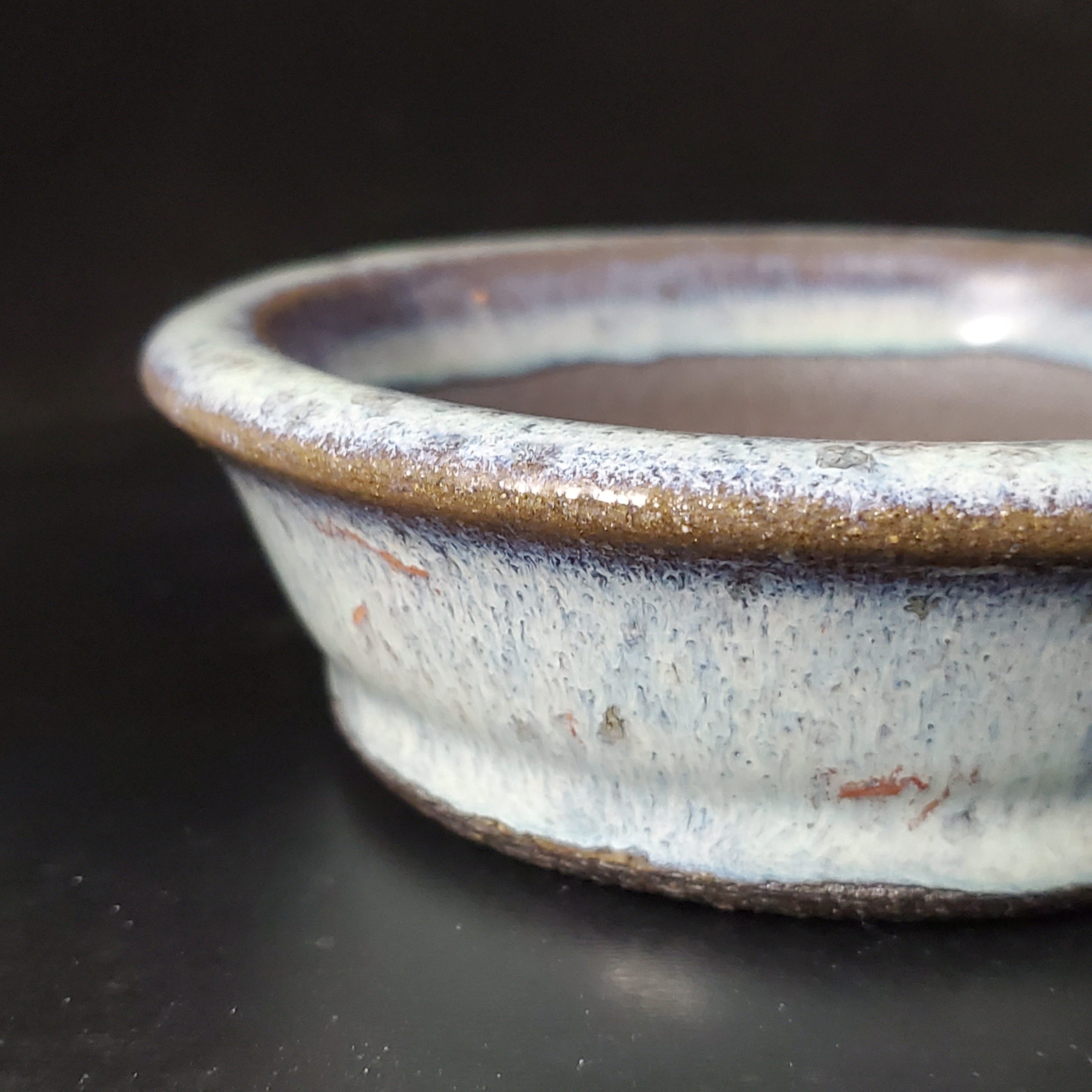 This is a charming small-to-medium bonsai pot crafted from ceramic. The exterior showcases a textured, speckled glazed finish, while the interior and bottom are made of unglazed or partially glazed brown clay. With four drainage holes and a flared rim, it is both functional for plant growth and visually appealing for display.