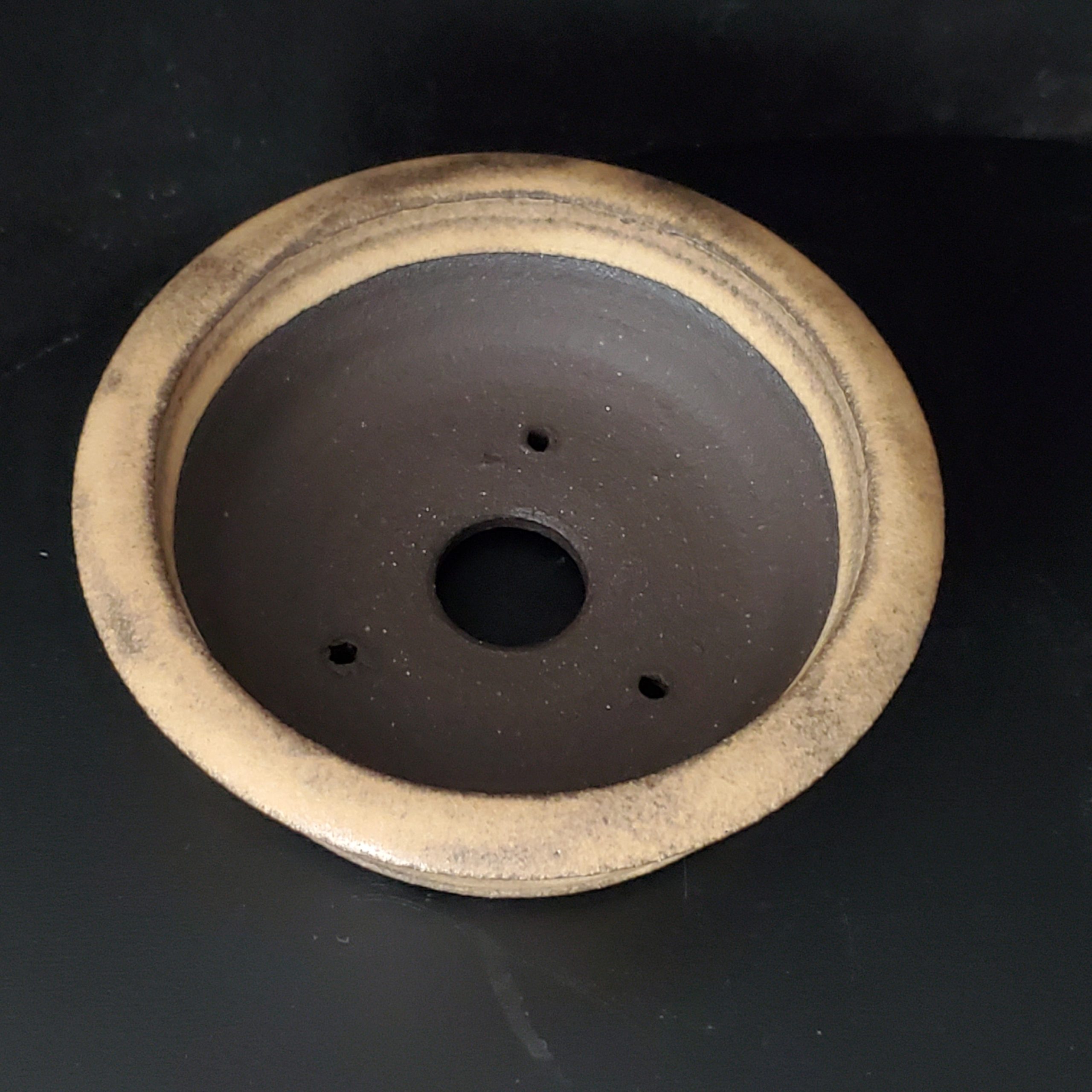 This is a shallow, low – profile ceramic pot with a rustic and traditional design. It has a flared rim and drainage holes, making it suitable for small plants. The exterior has a porous, textured finish in light beige/tan with speckles, while the interior is a solid dark color, creating an appealing contrast.