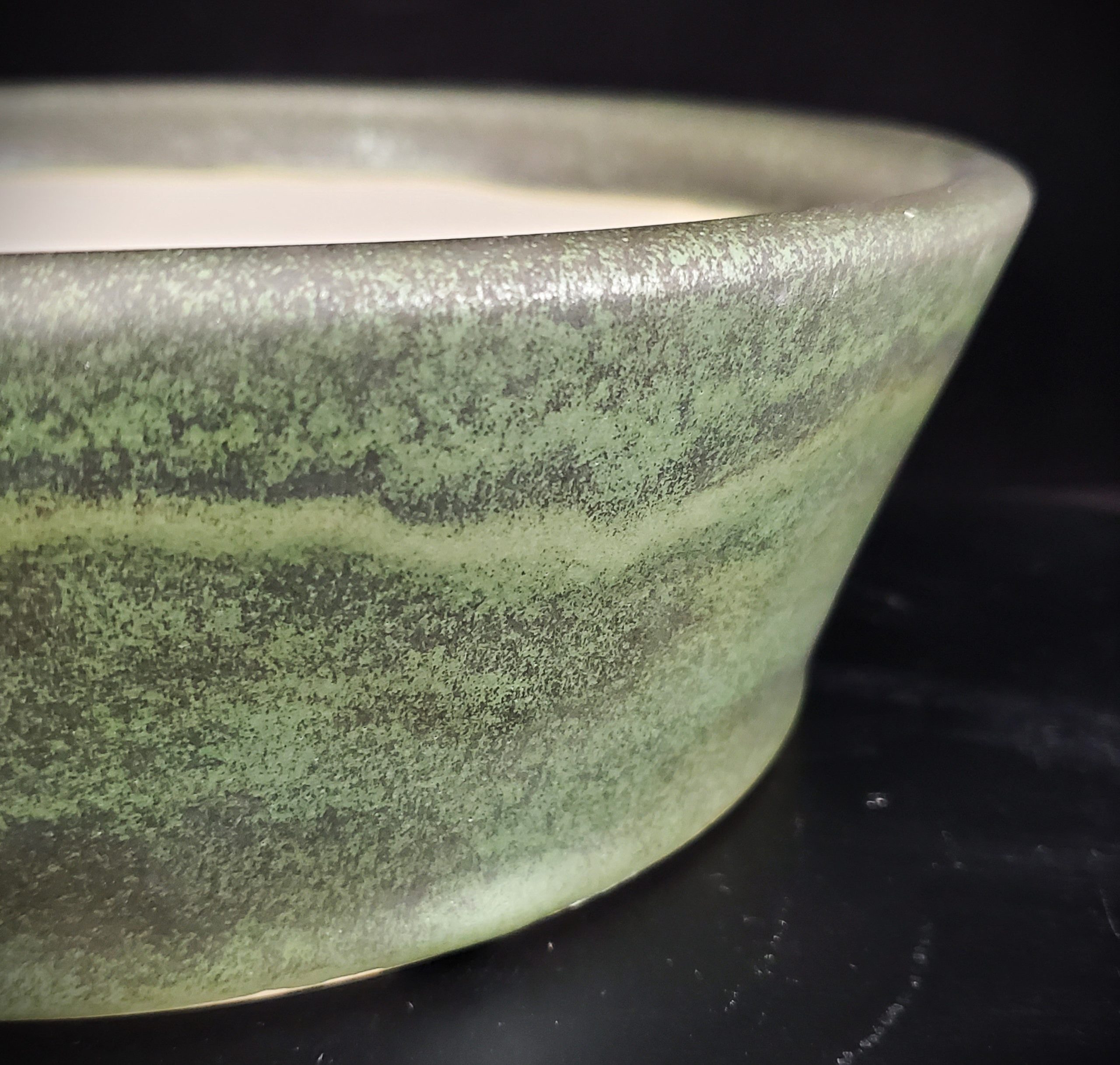 Color & Design Exterior: Marbled or speckled pattern with dominant green hues and wavy lighter green lines; Interior: Smooth, off – white/cream