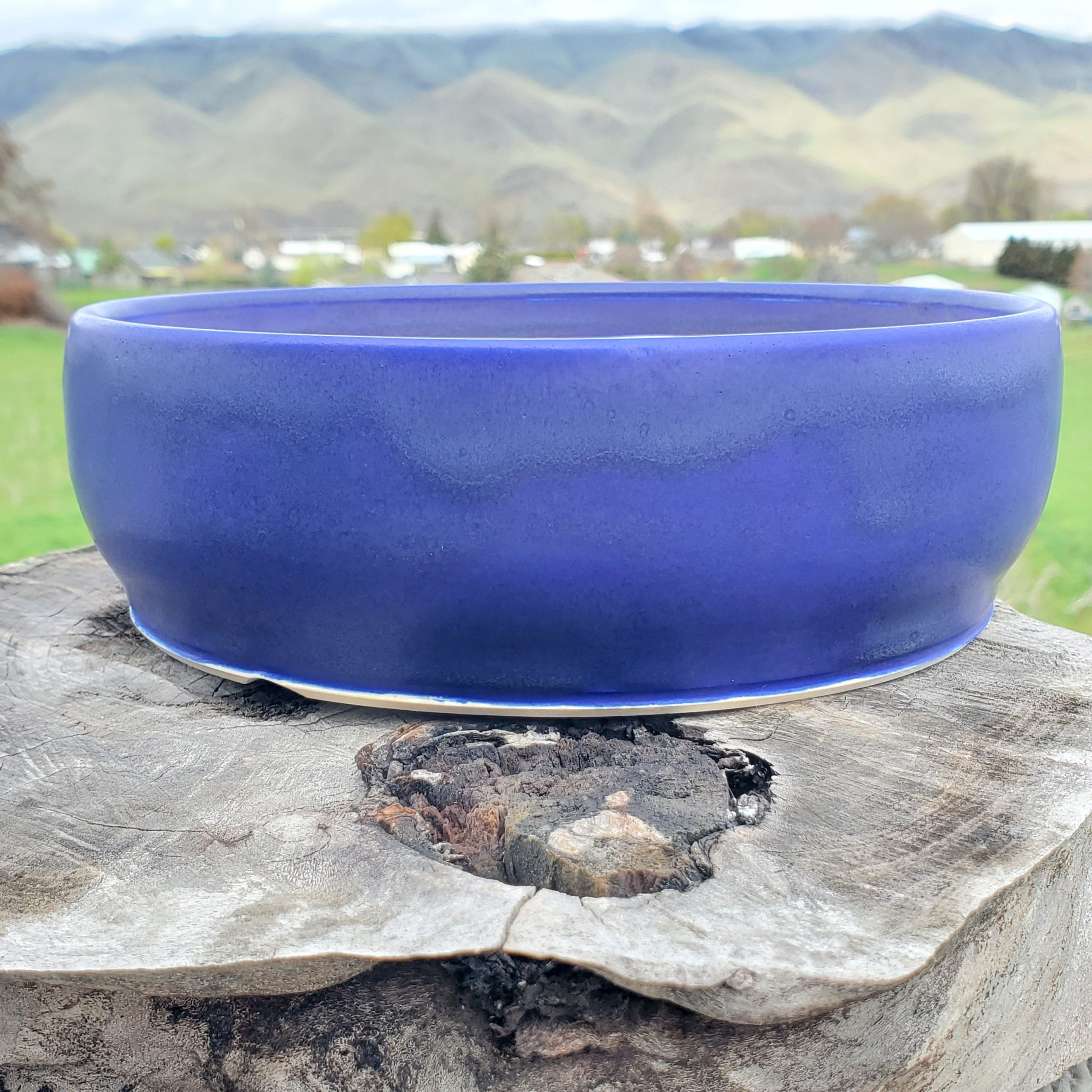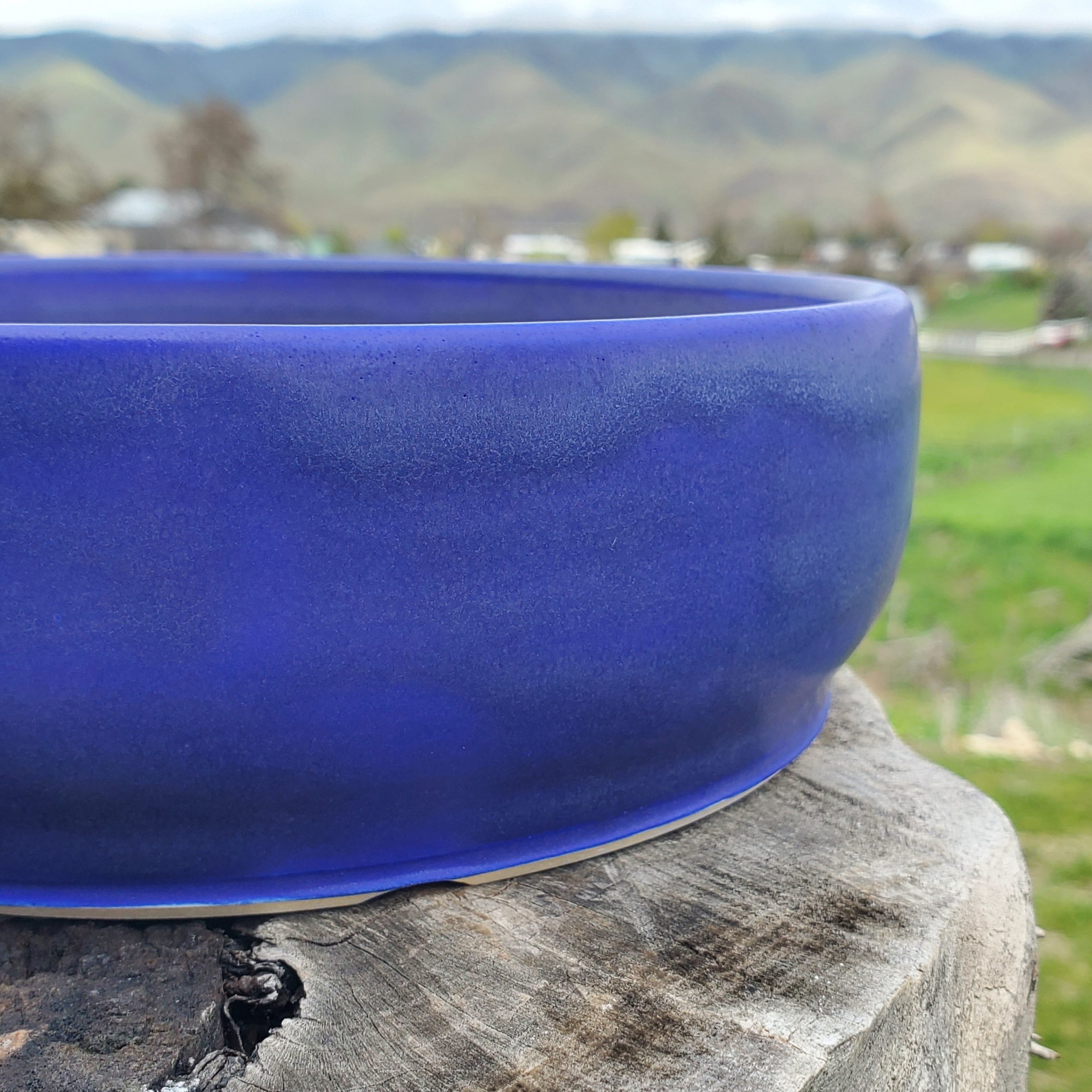 This ceramic pot is a versatile piece, suitable for both growing plants like bonsai trees and for decorative use. It features a smooth-curved, wide, shallow bowl shape with a flared rim, and a vibrant blue glazed exterior that provides an aesthetic appeal. Handmade in the USA with locally sourced porcelain, it is vitrified and freeze – safe.