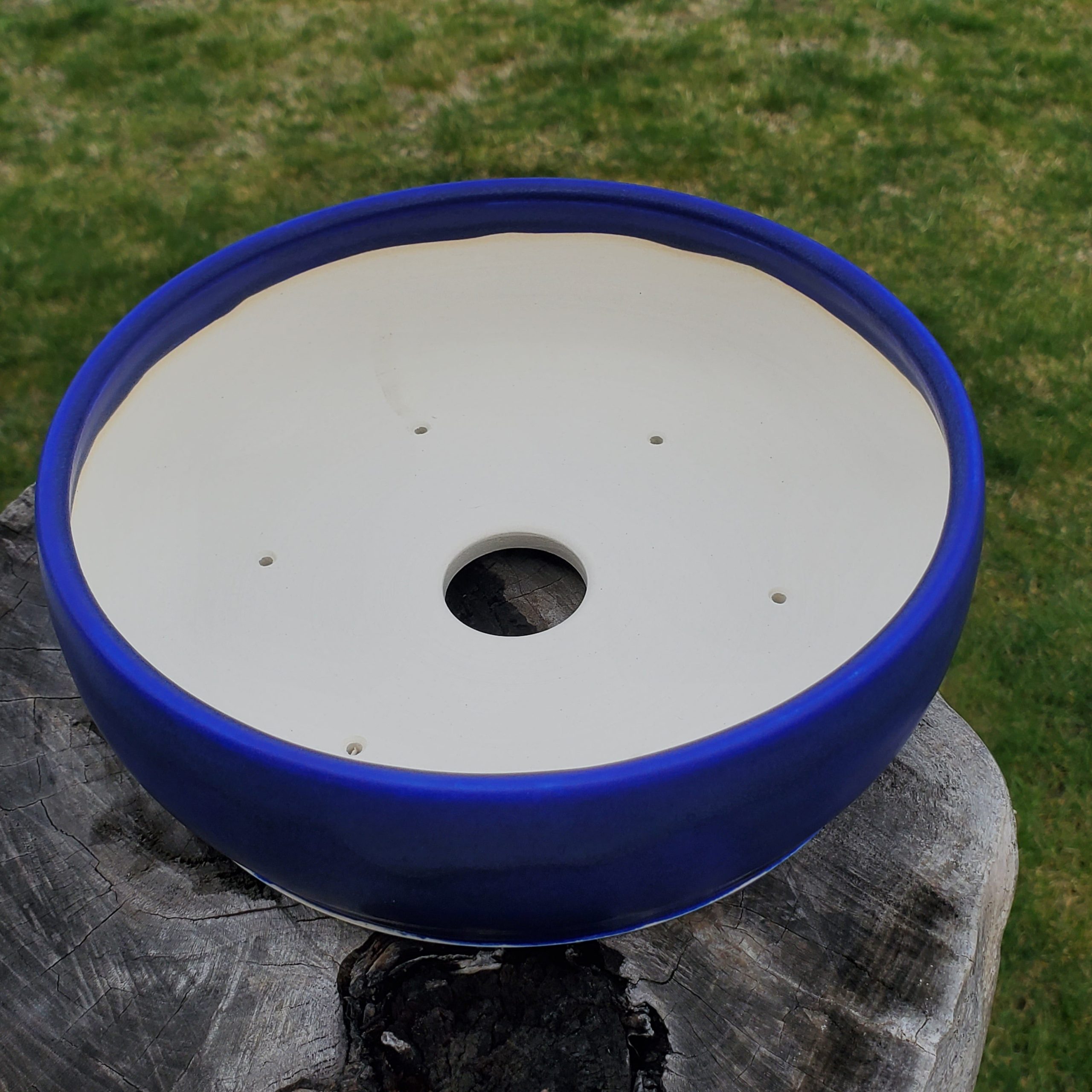 - Has a glossy, uniform blue exterior and a white interior, likely the natural clay body.