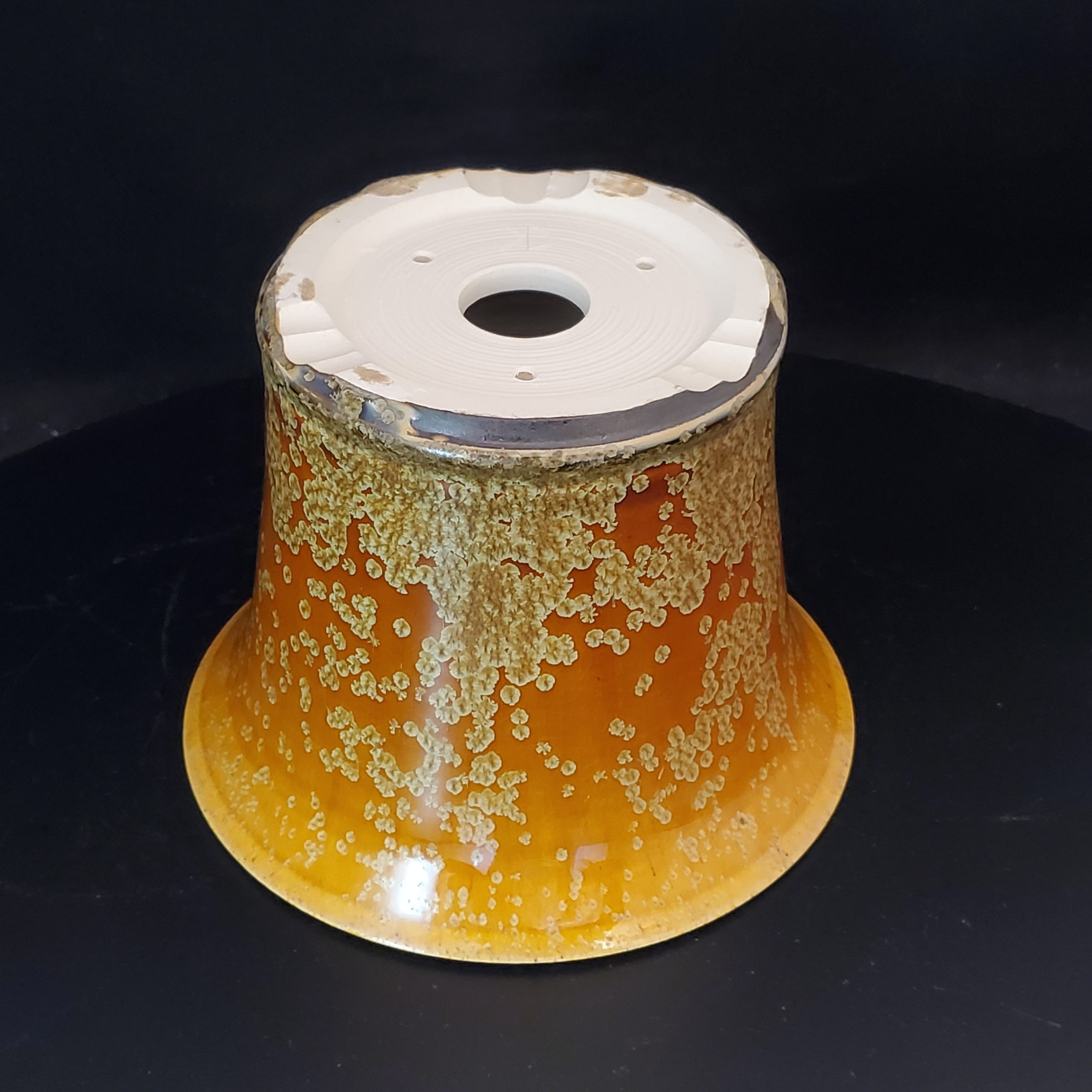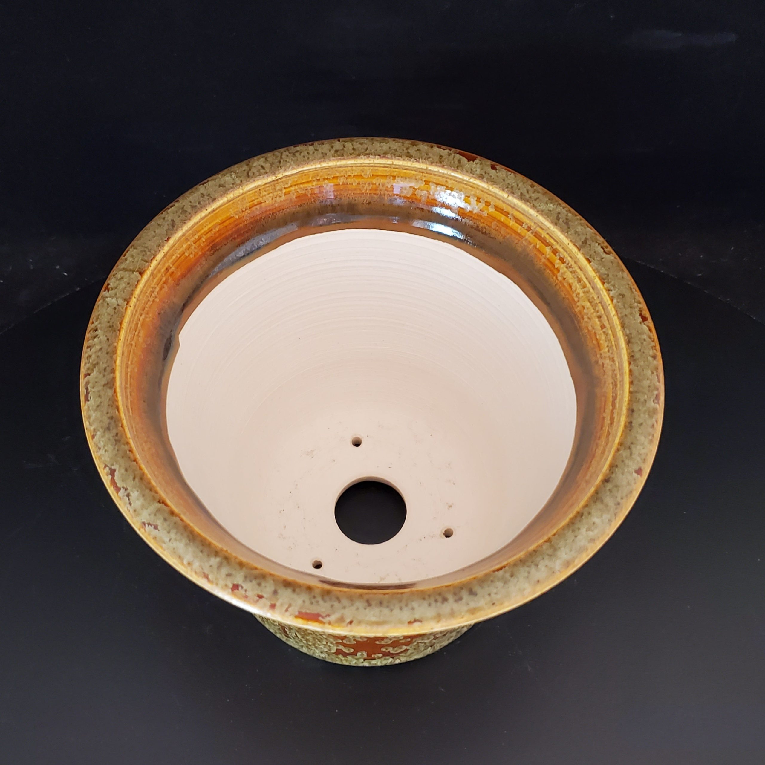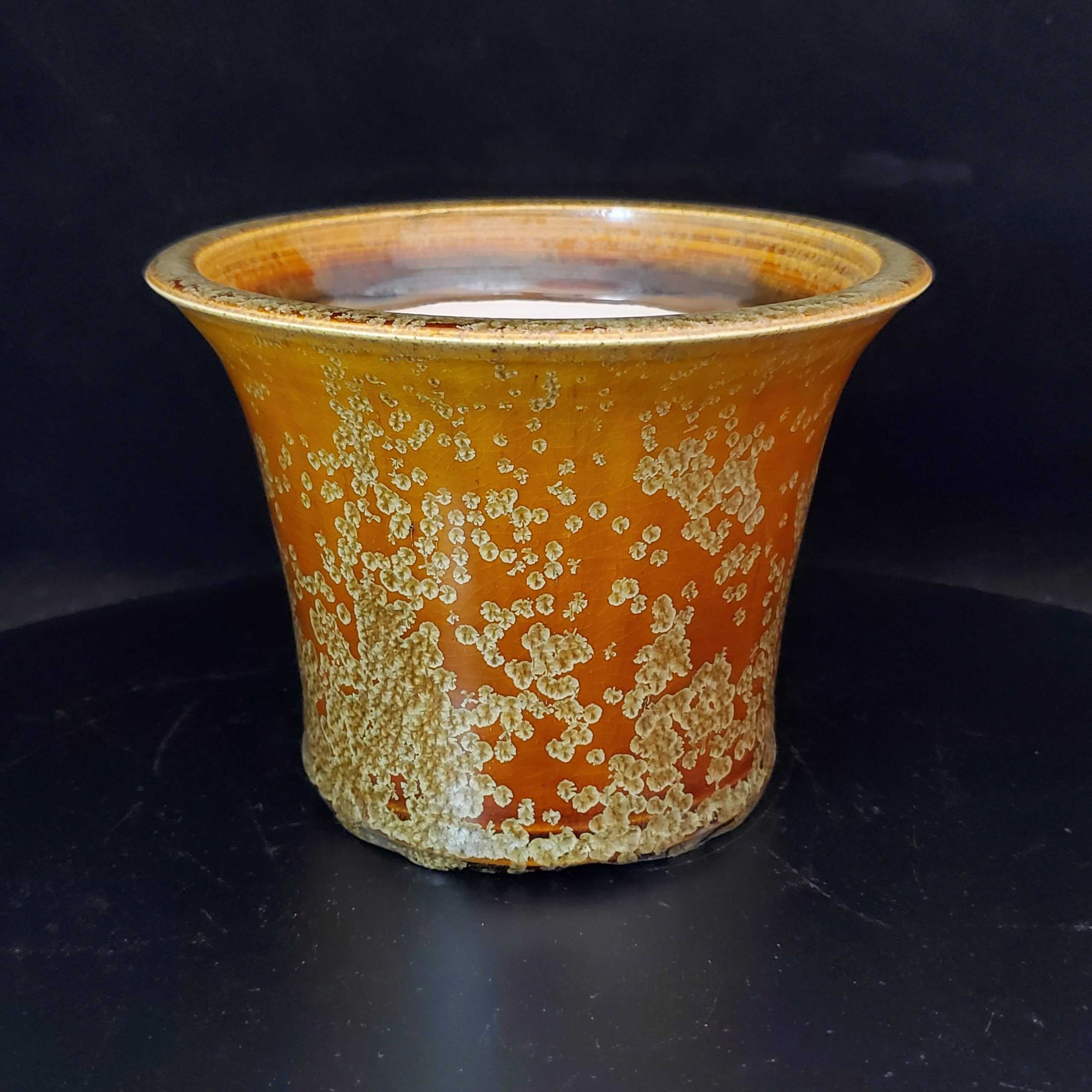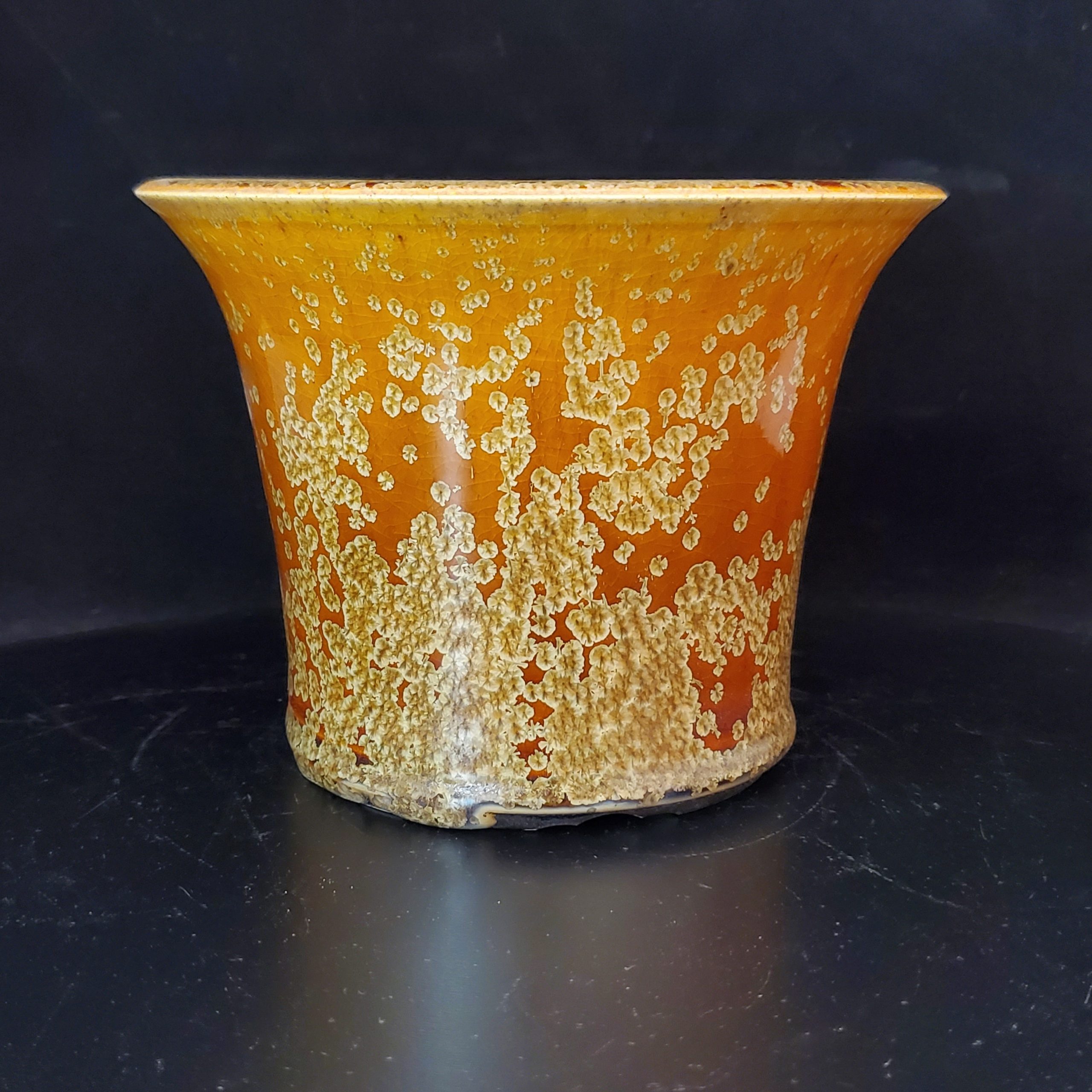 This ceramic bonsai pot is a beautiful and functional addition to any indoor or outdoor space. It features a flared shape with a wide, flared top that enhances visual appeal and provides stability for plant placement. The exterior has a dominant orange base with a glossy finish, overlaid with irregular, beige – to – light – brown speckles and a crackle glaze effect, adding an artisanal, rustic aesthetic. The unglazed white clay interior ensures structural integrity and may improve airflow for plant roots.