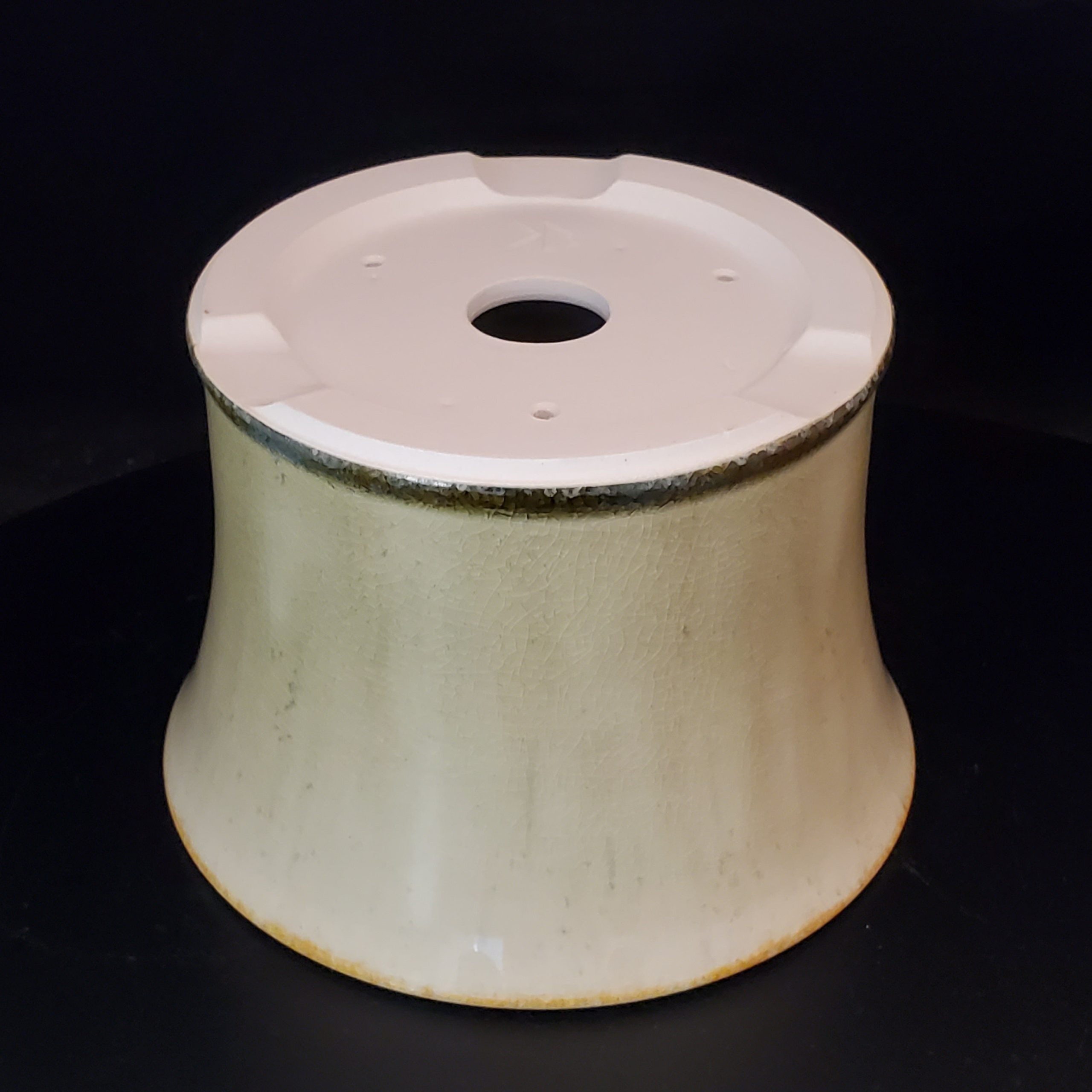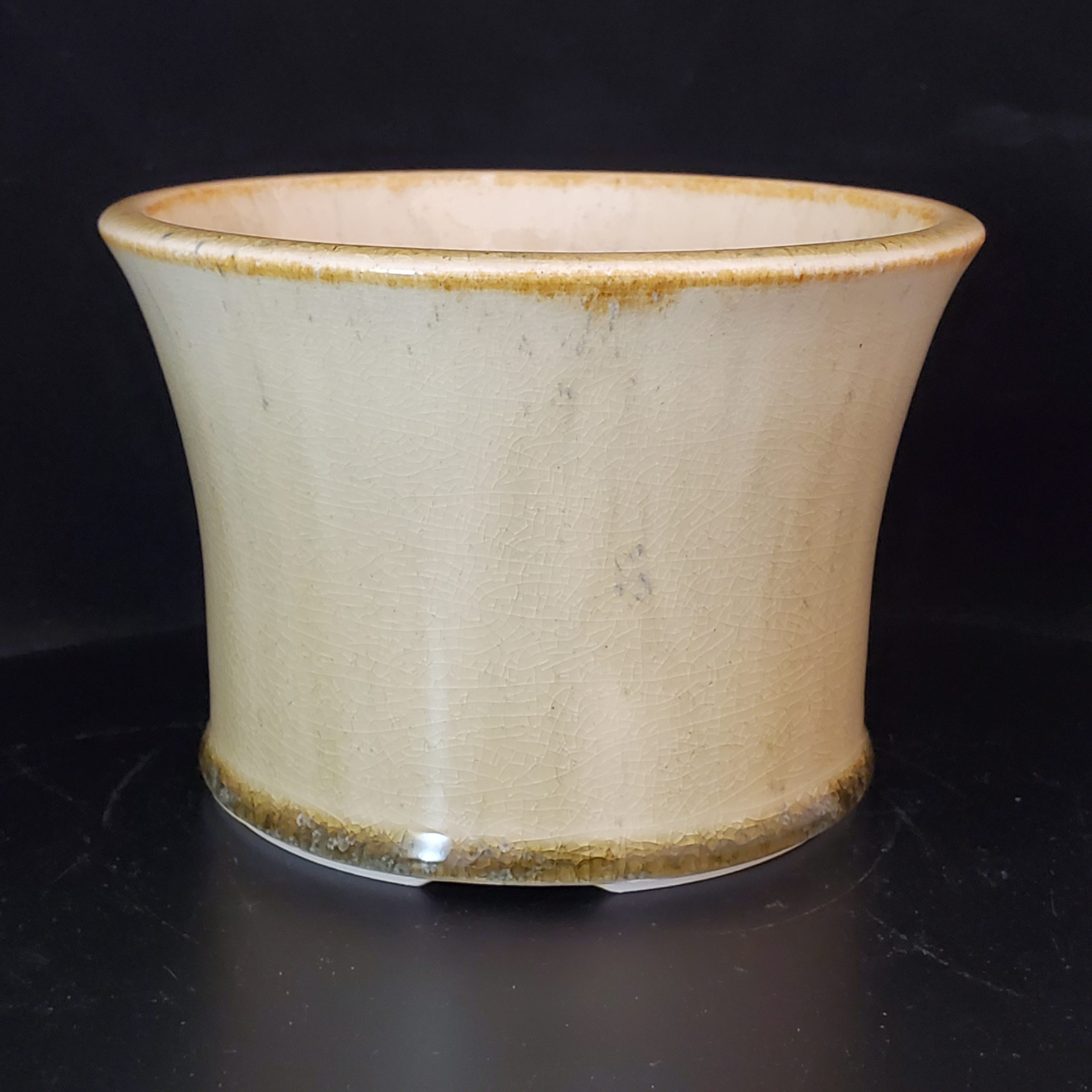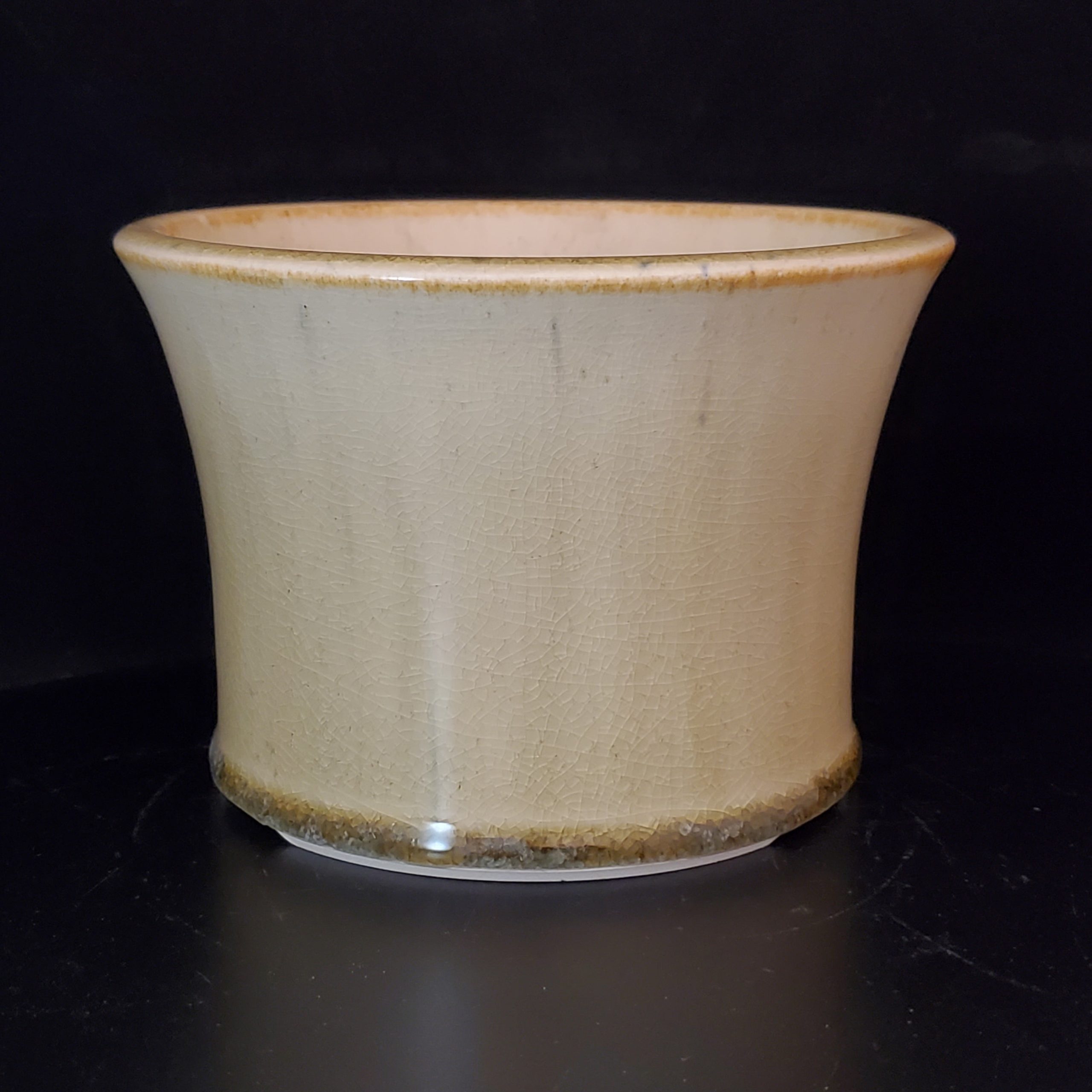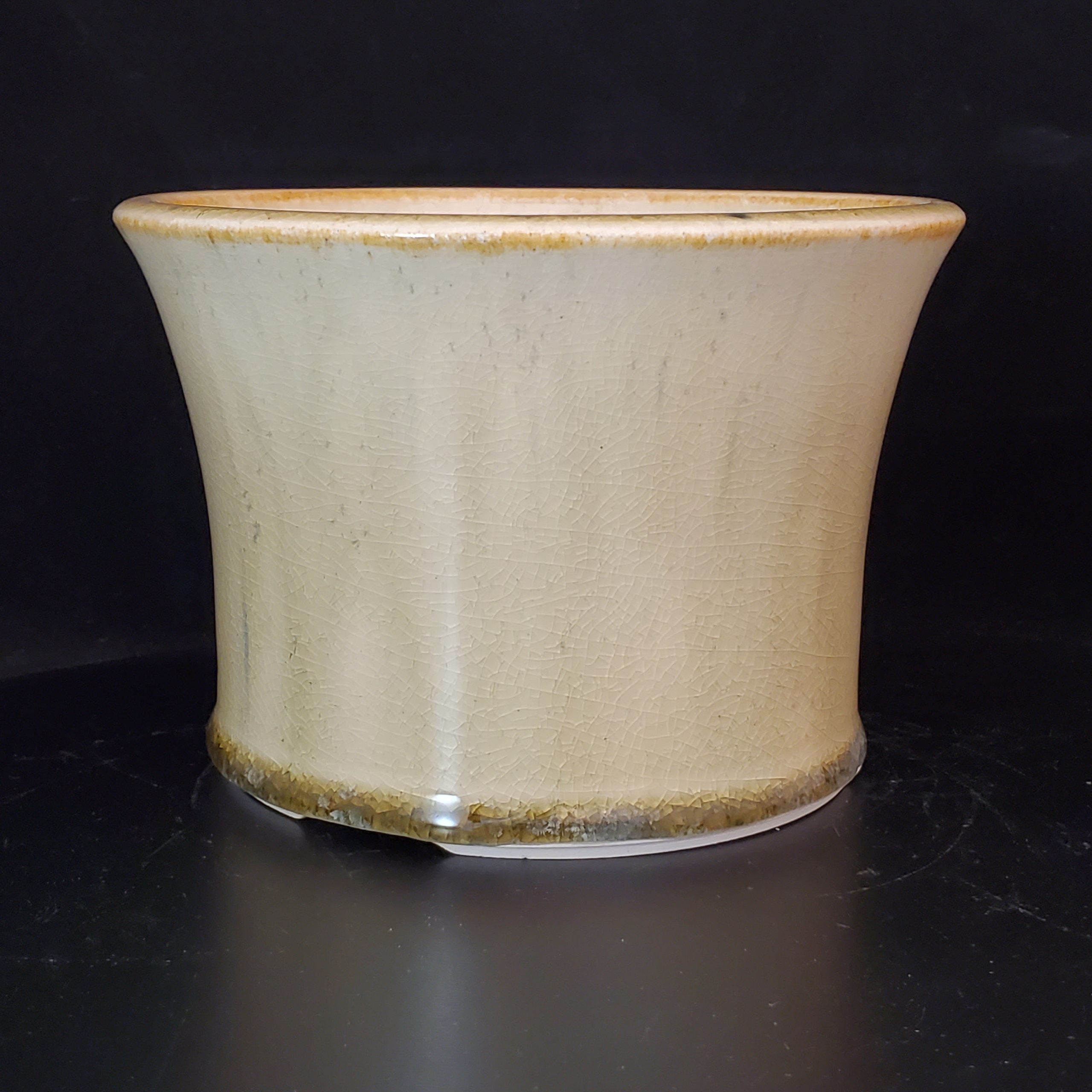 This ceramic bonsai pot is a beautiful addition for indoor plant lovers. It features a creamy white crackled glaze with golden – brown bands on the top and bottom rims, adding an elegant touch. The pot has a flared, cylindrical shape and a central drainage hole, making it perfect for cultivating small – to – medium indoor plants.