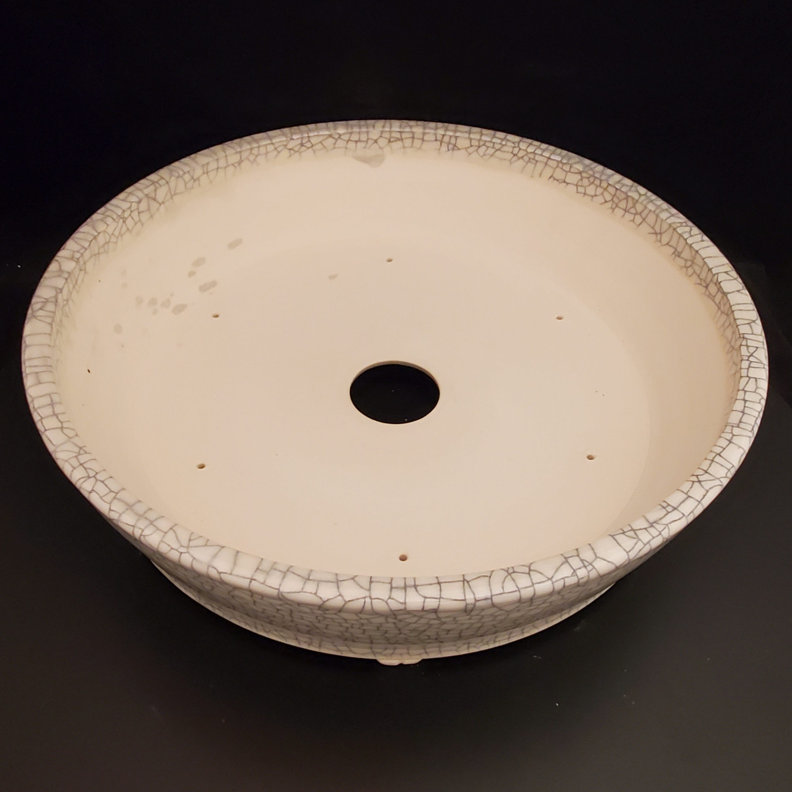 This is a shallow, oval-shaped ceramic pot, crafted from porcelain. It features a crackled glaze pattern in a darker hue over a light cream/off – white base, creating an antique aesthetic. With its drainage holes and rounded feet, it is perfect for growing bonsai trees or as a decorative planter for small plants.