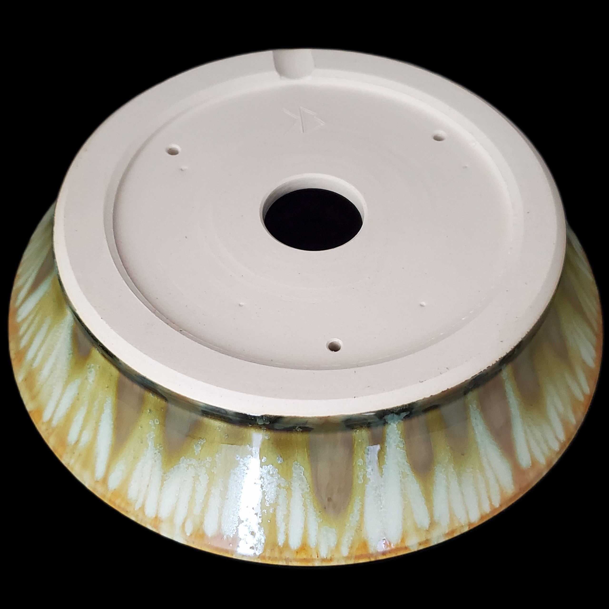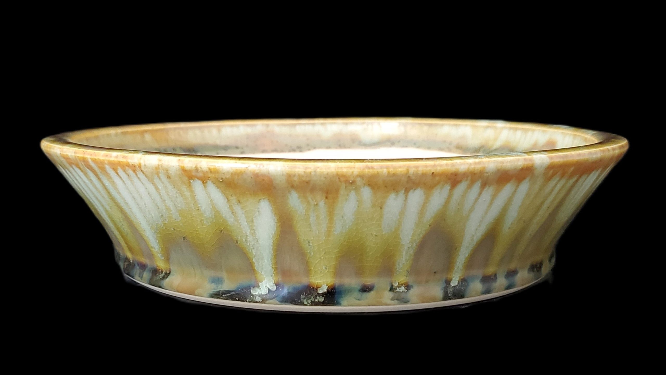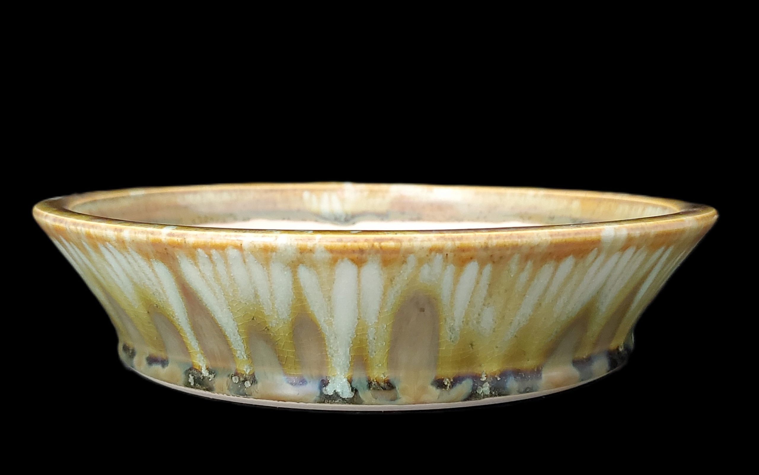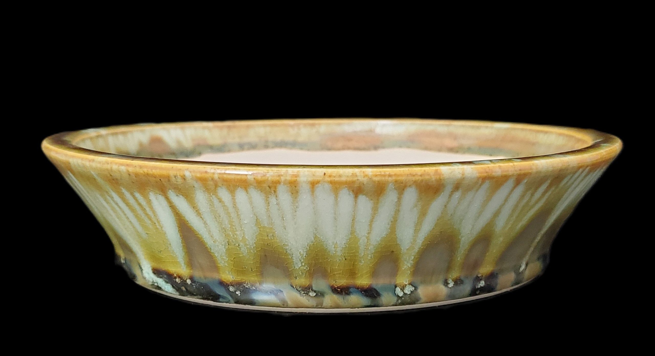 | Features | Central and three surrounding drainage holes, shallow wide round shape with flared rim, smooth exterior glaze with cracked appearance and matte unglazed interior |