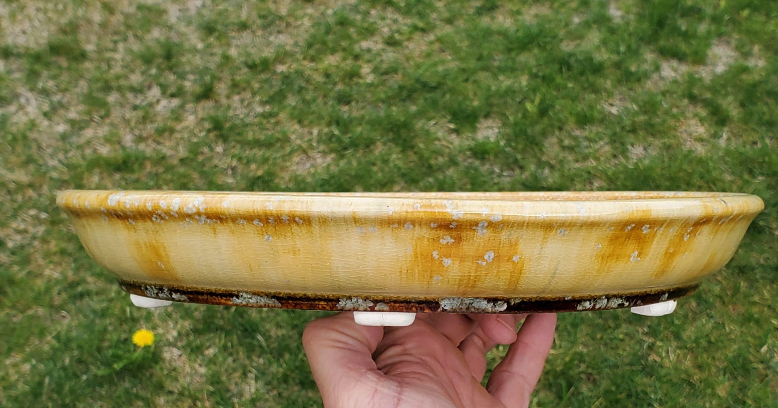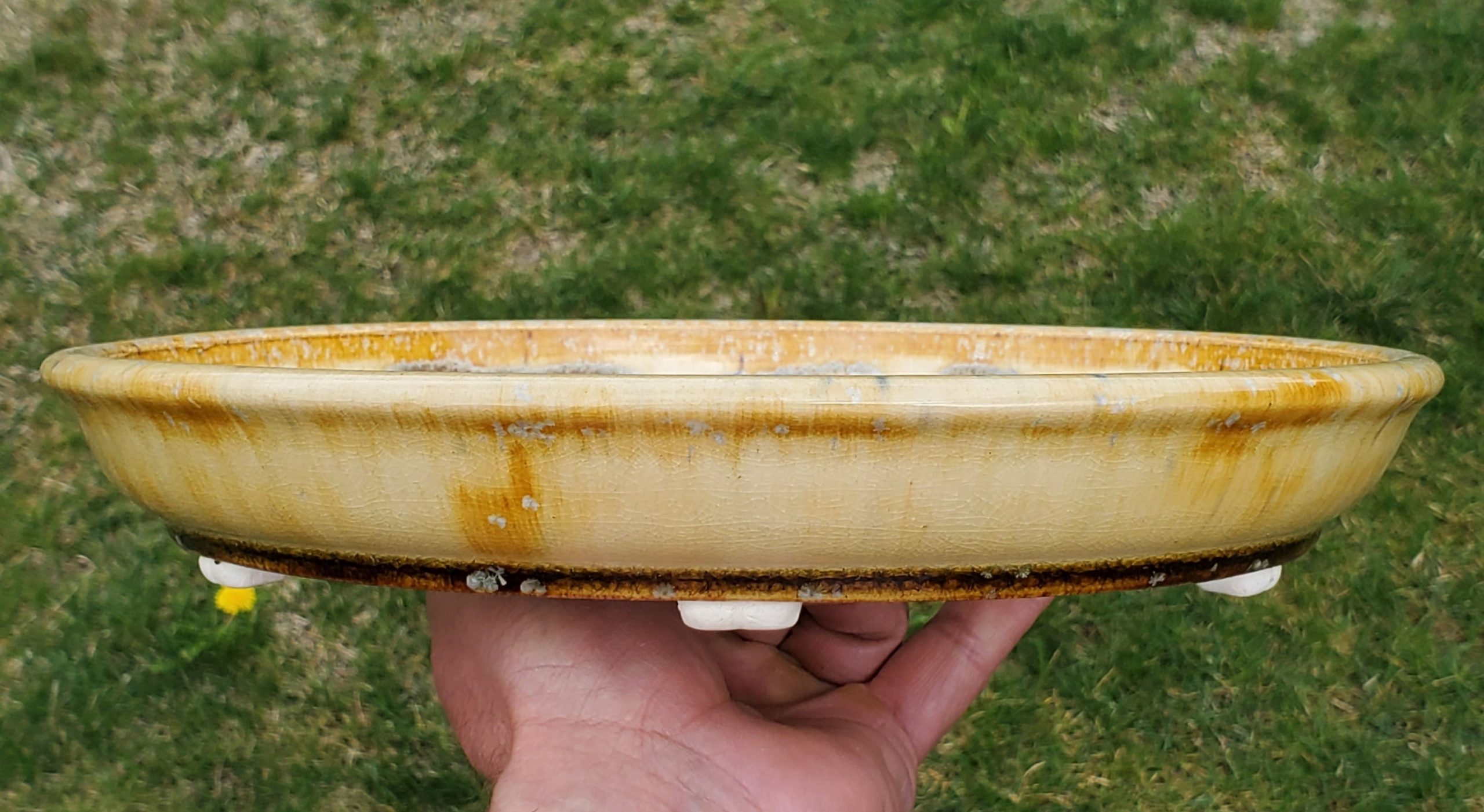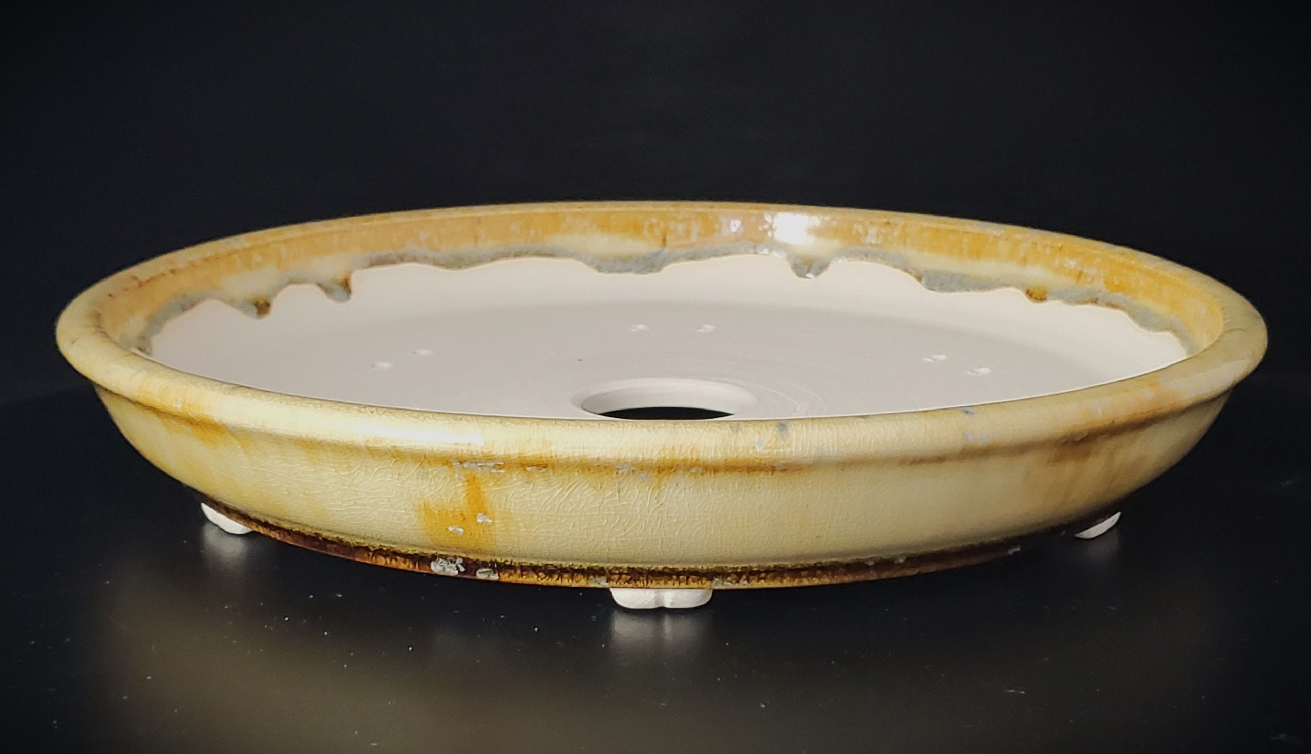This is a beautiful oval-shaped bonsai pot crafted from ceramic. It features a crackled-marbled glaze in golden-yellow or amber on a cream/ivory base, adding an aged and decorative touch. The pot is shallow with drainage holes and small feet, designed to keep the bonsai’s roots healthy.
