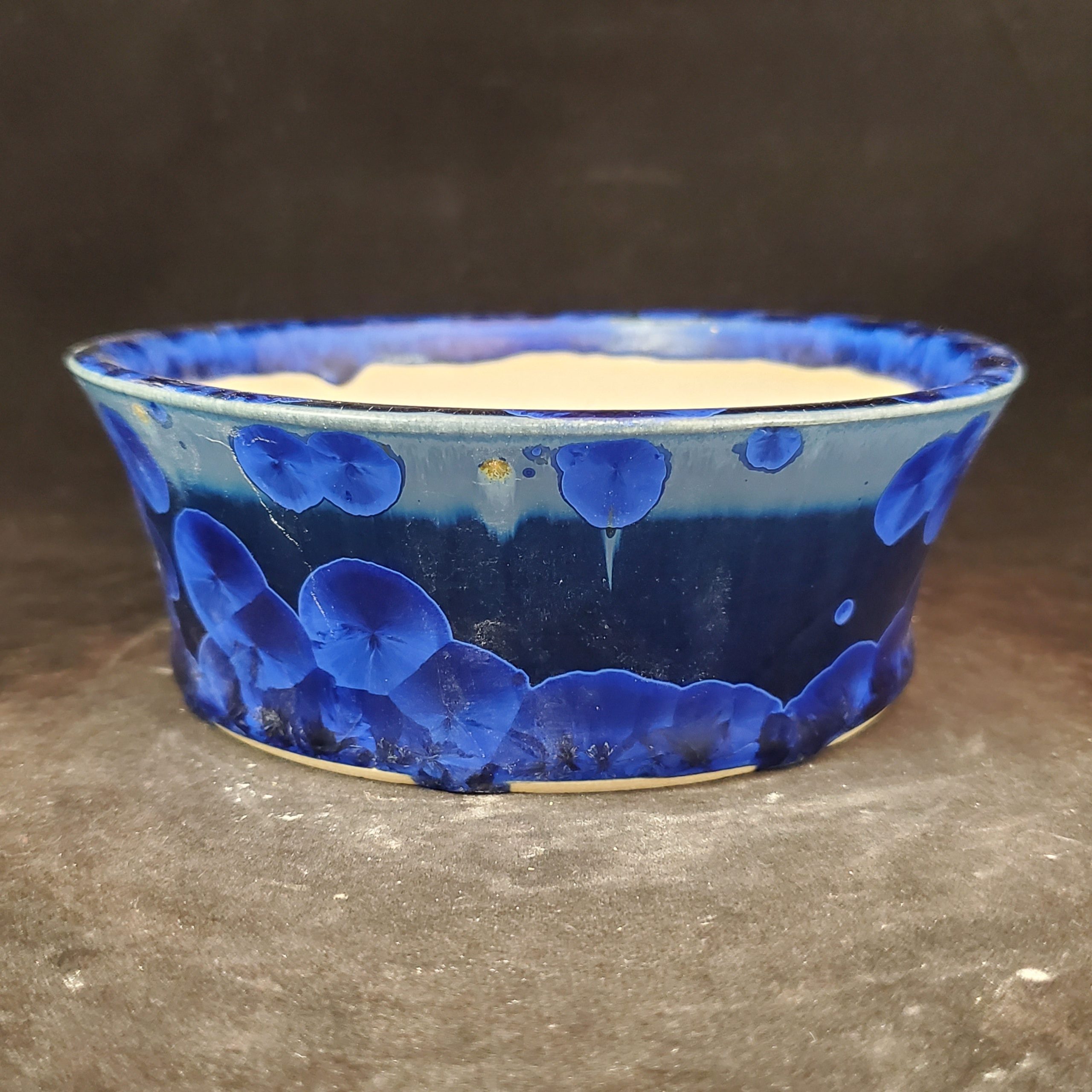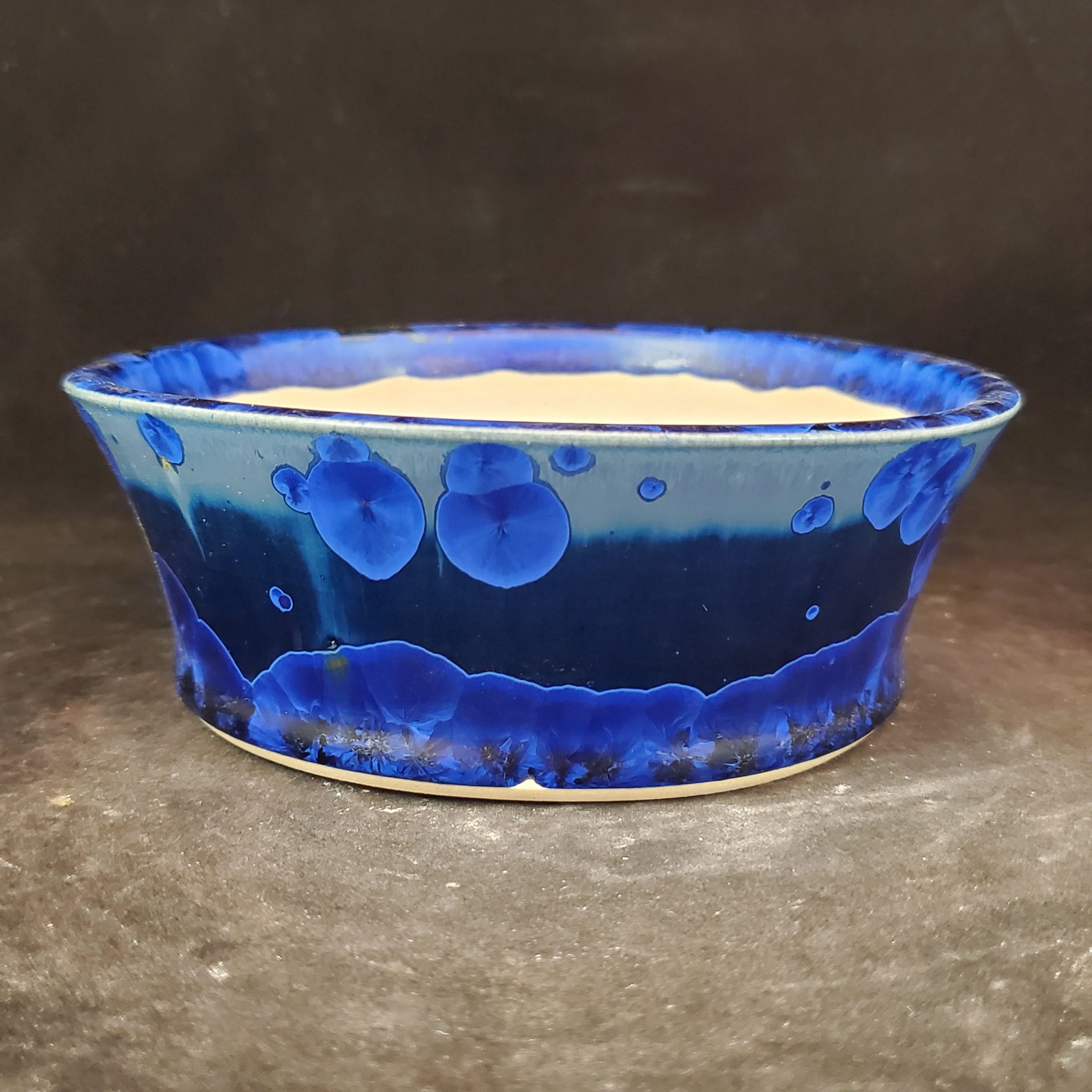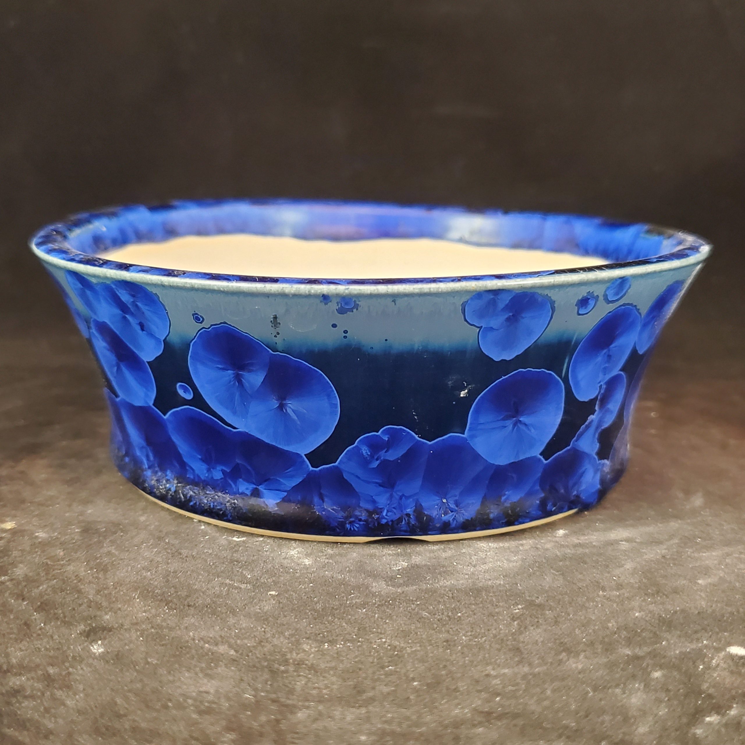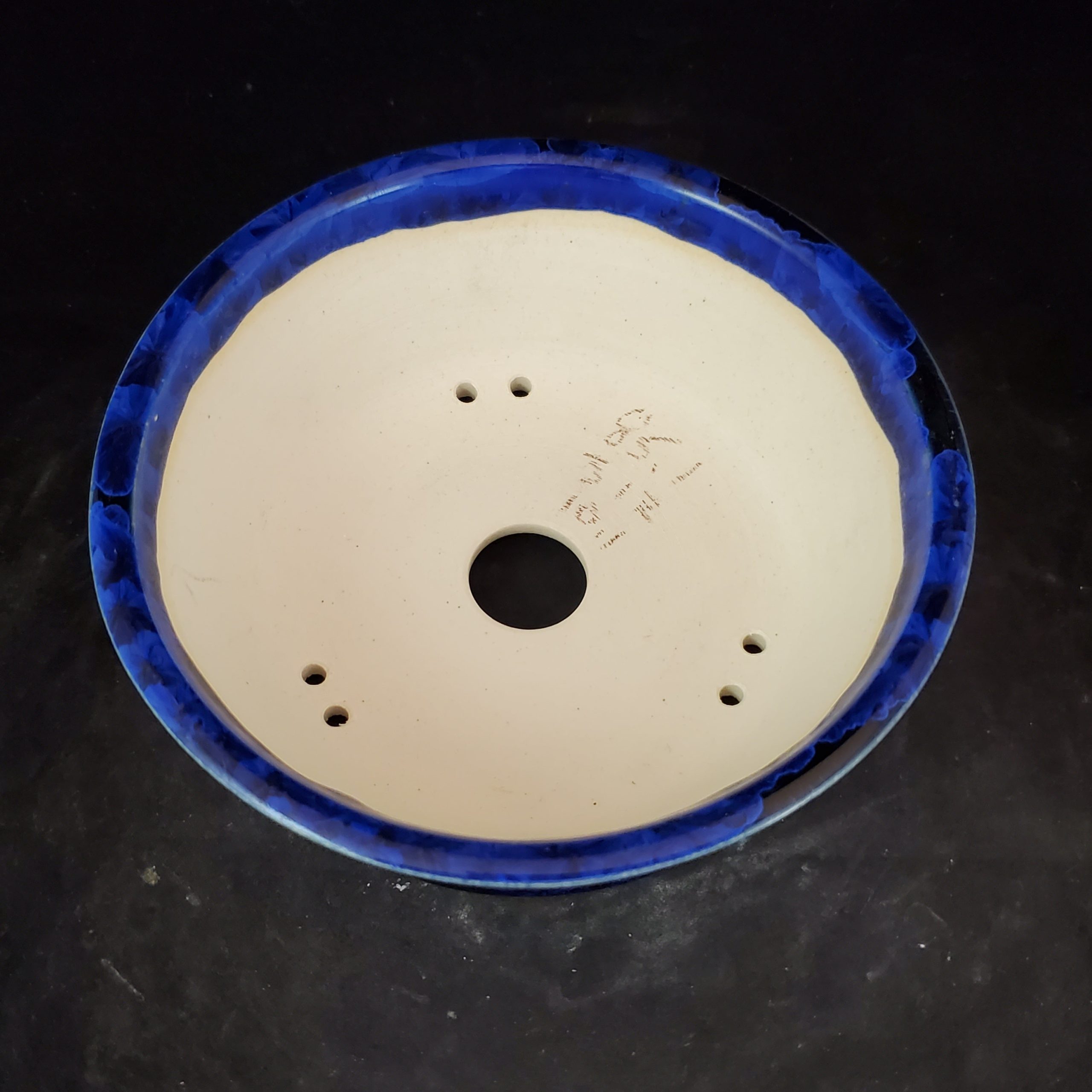 This is a charming ceramic planter, crafted as a bonsai pot or small plant container. It features a hand – applied marbled blue glaze on the exterior, with a smooth white interior. The presence of drainage holes and its shallow depth make it perfect for growing small plants.