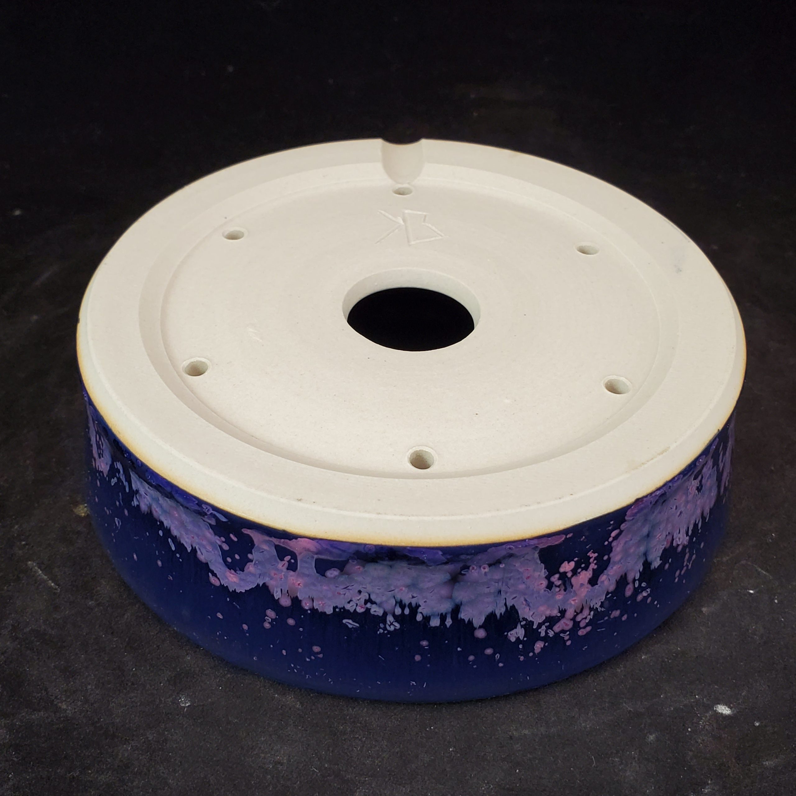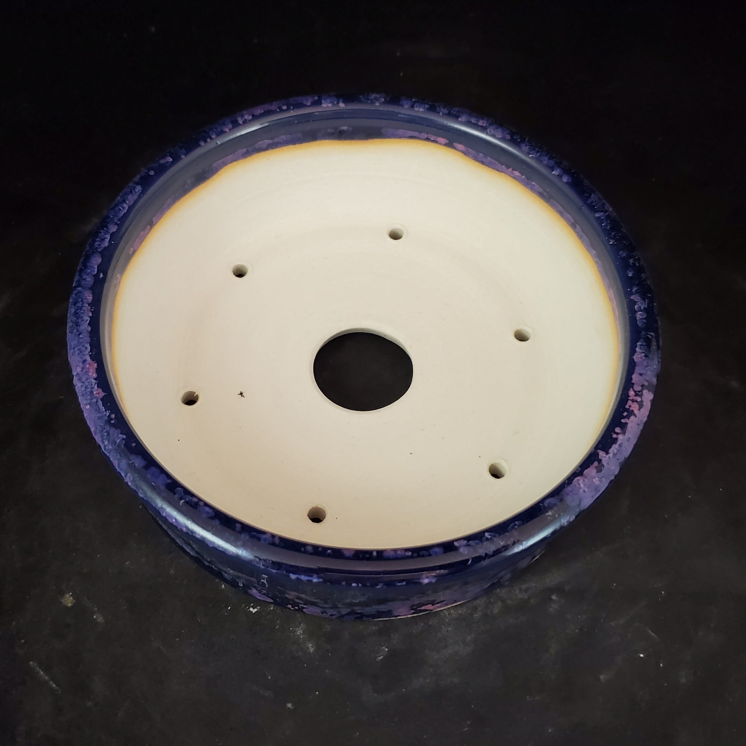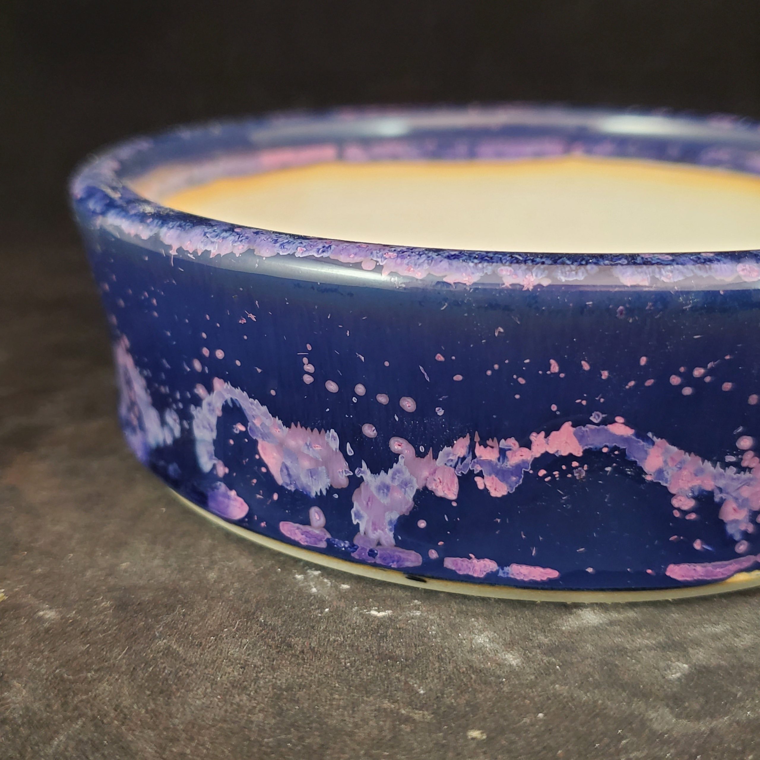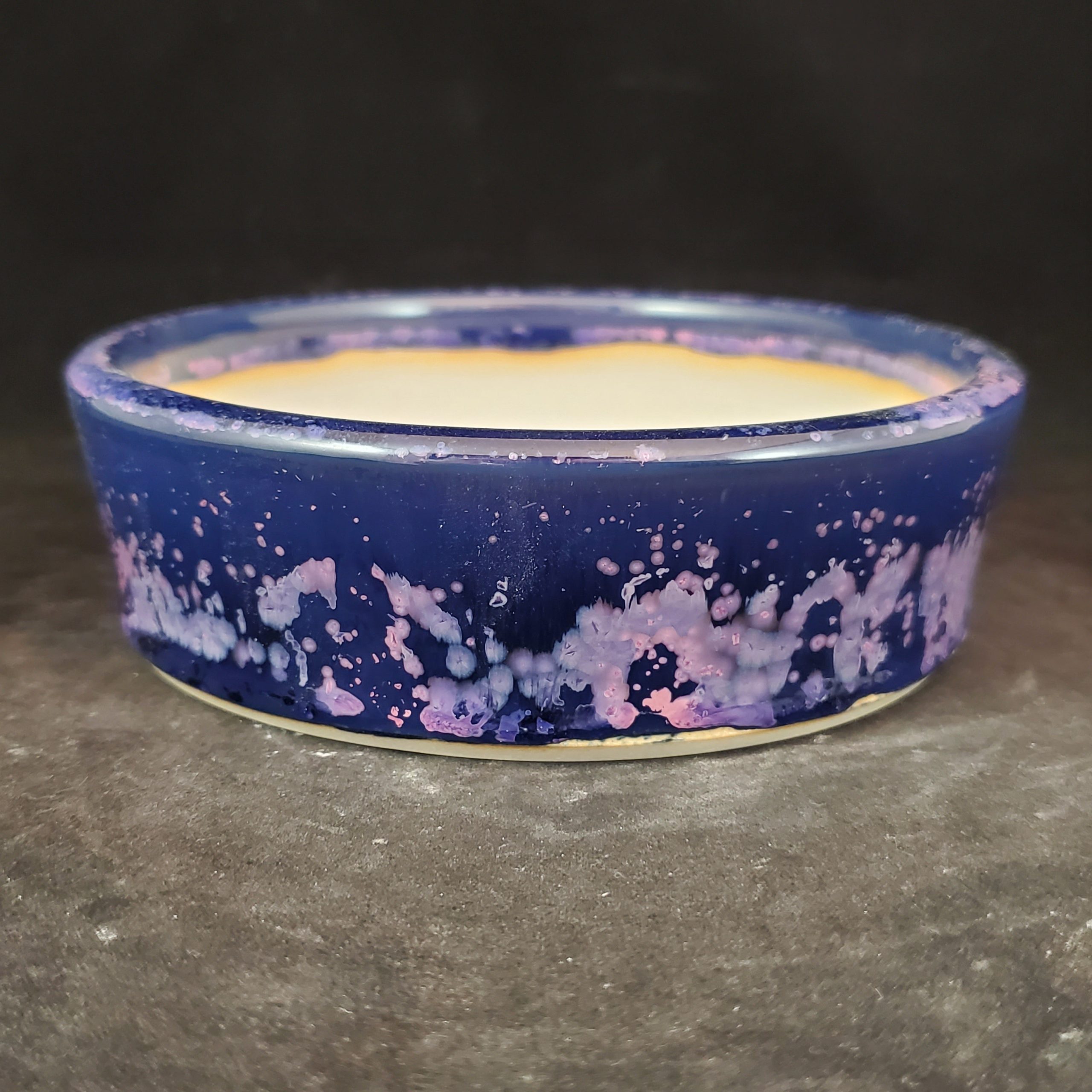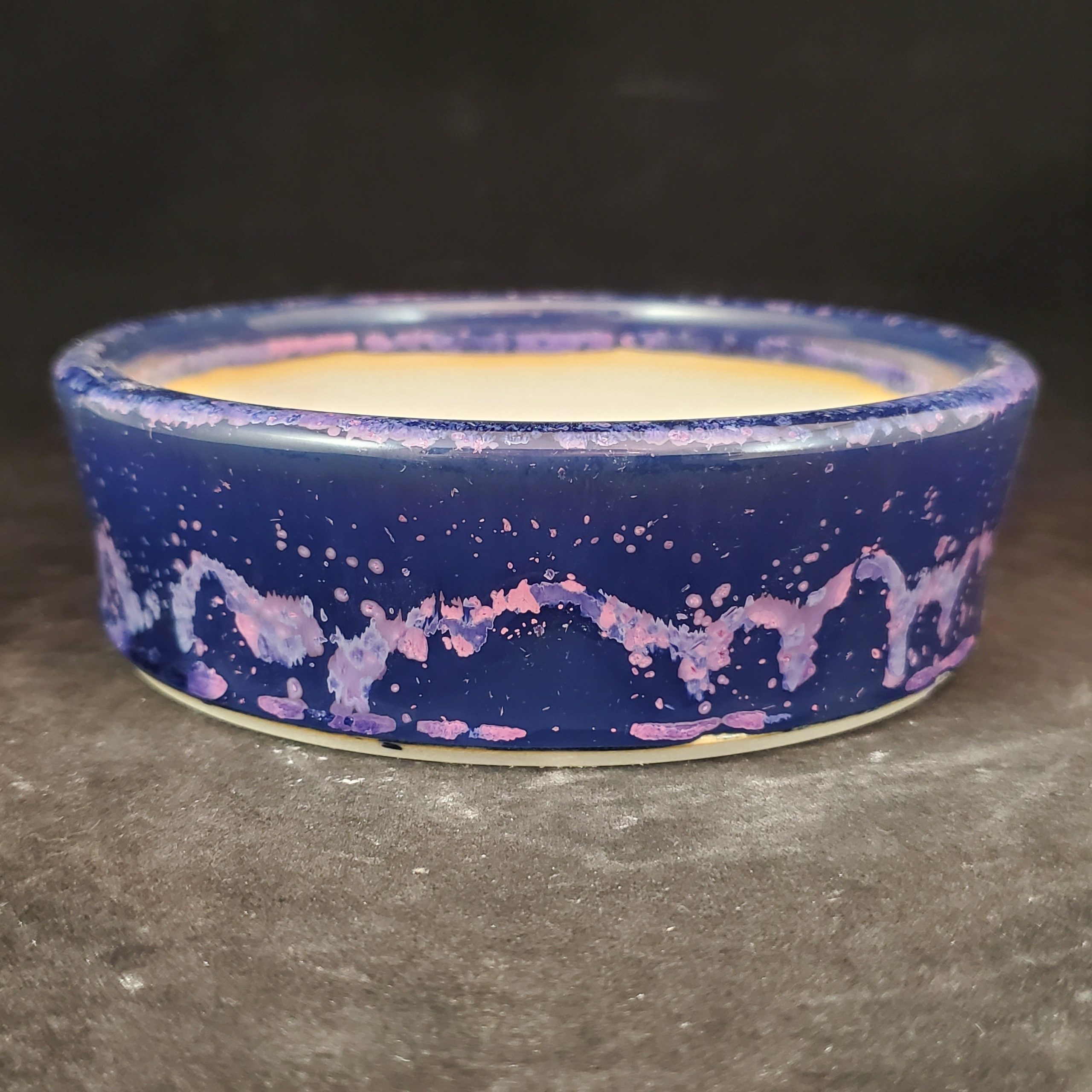 This product is a round, shallow ceramic bonsai pot. The outer surface is a deep navy blue with white and pink/purple splatter patterns, creating an abstract and artistic look. The inner surface is white with a subtle yellow – brown ring, and the bottom has drainage holes, making it both functional for plant growth and decorative for home use.