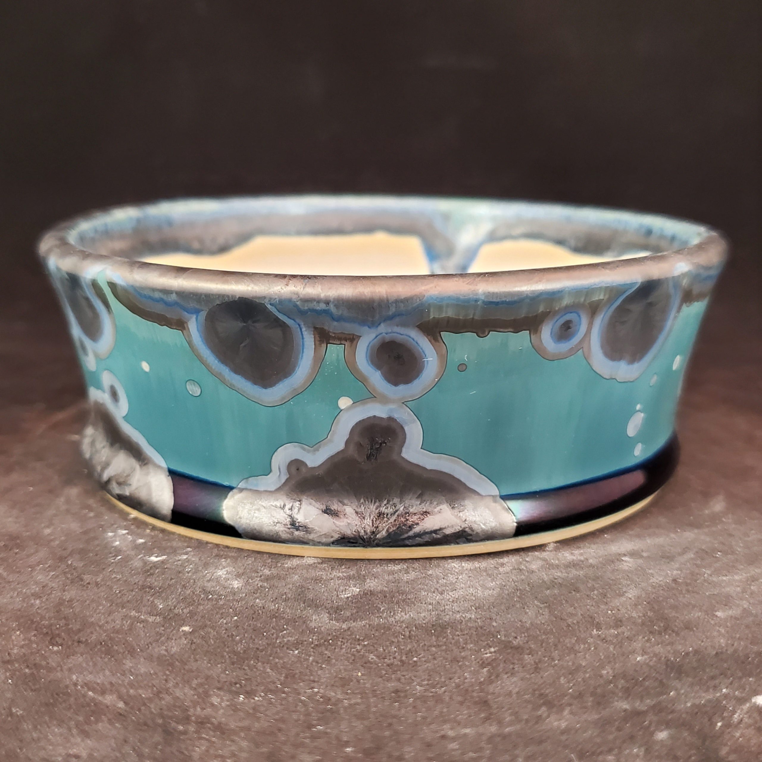 | Exterior Color & Design | Striking, organic pattern resembling agate with concentric circles and flowing, cloudy shapes in shades of teal/aquamarine blue, gray, white, and black. Glossy finish with layered, iridescent effects. |