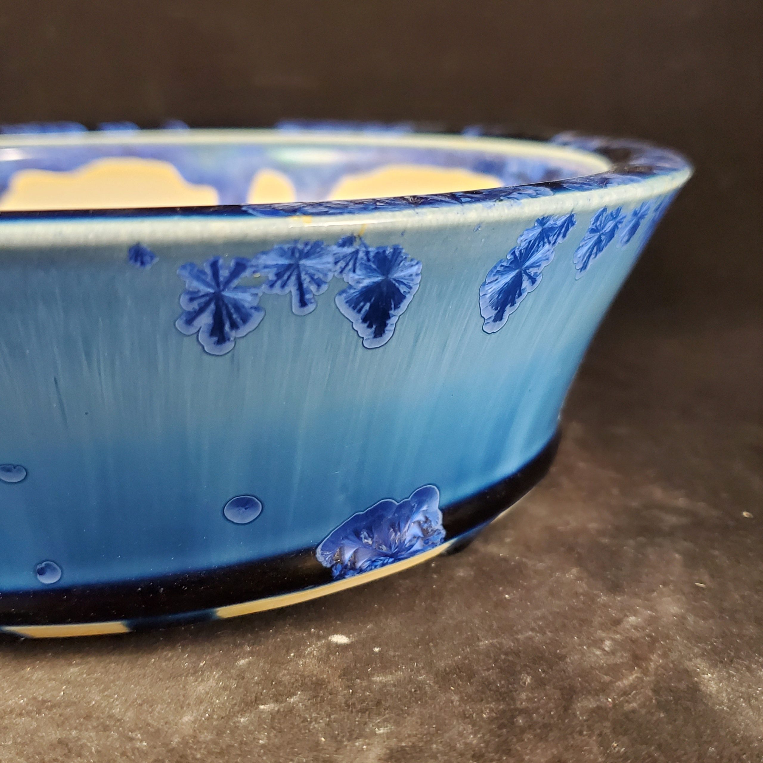 - Decorative blue floral motifs and gradient glazing