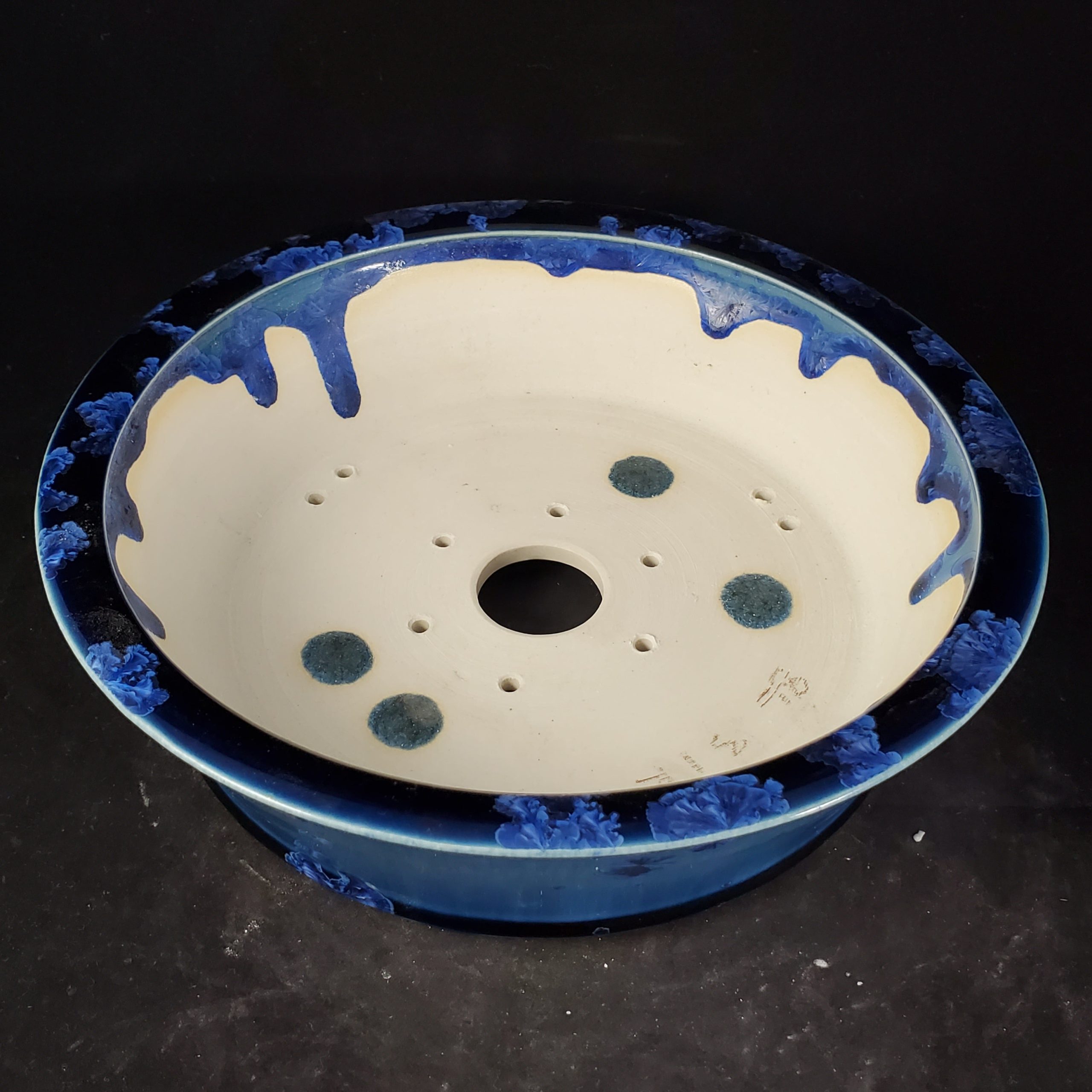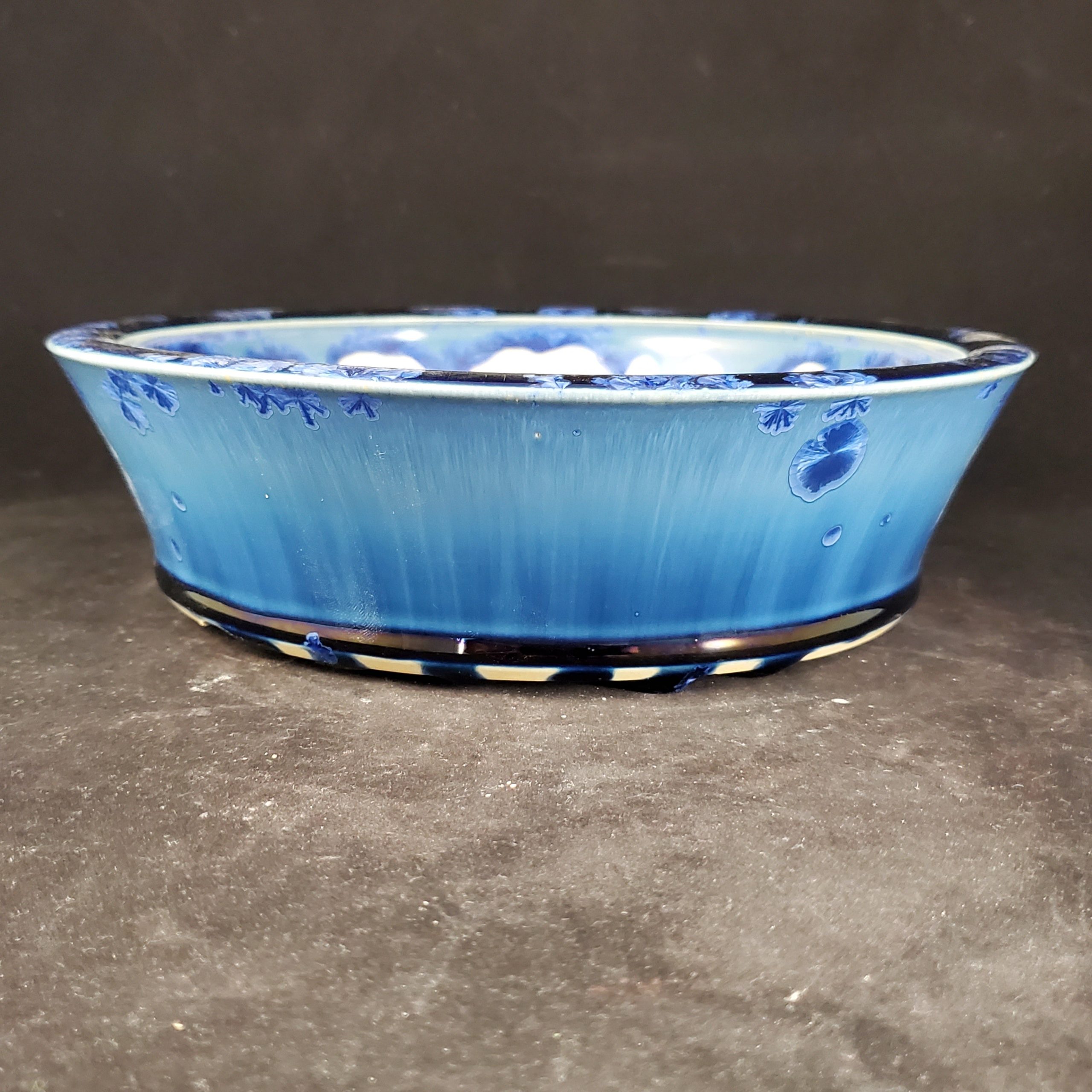 This ceramic bonsai pot is a beautiful and functional piece. It features a glazed finish with a gradient of blue shades on the exterior, adorned with floral motifs. The interior has a white base with irregular blue patterns, creating a striking contrast. The pot is designed for small plants like bonsai or succulents, with proper drainage holes to prevent root rot.