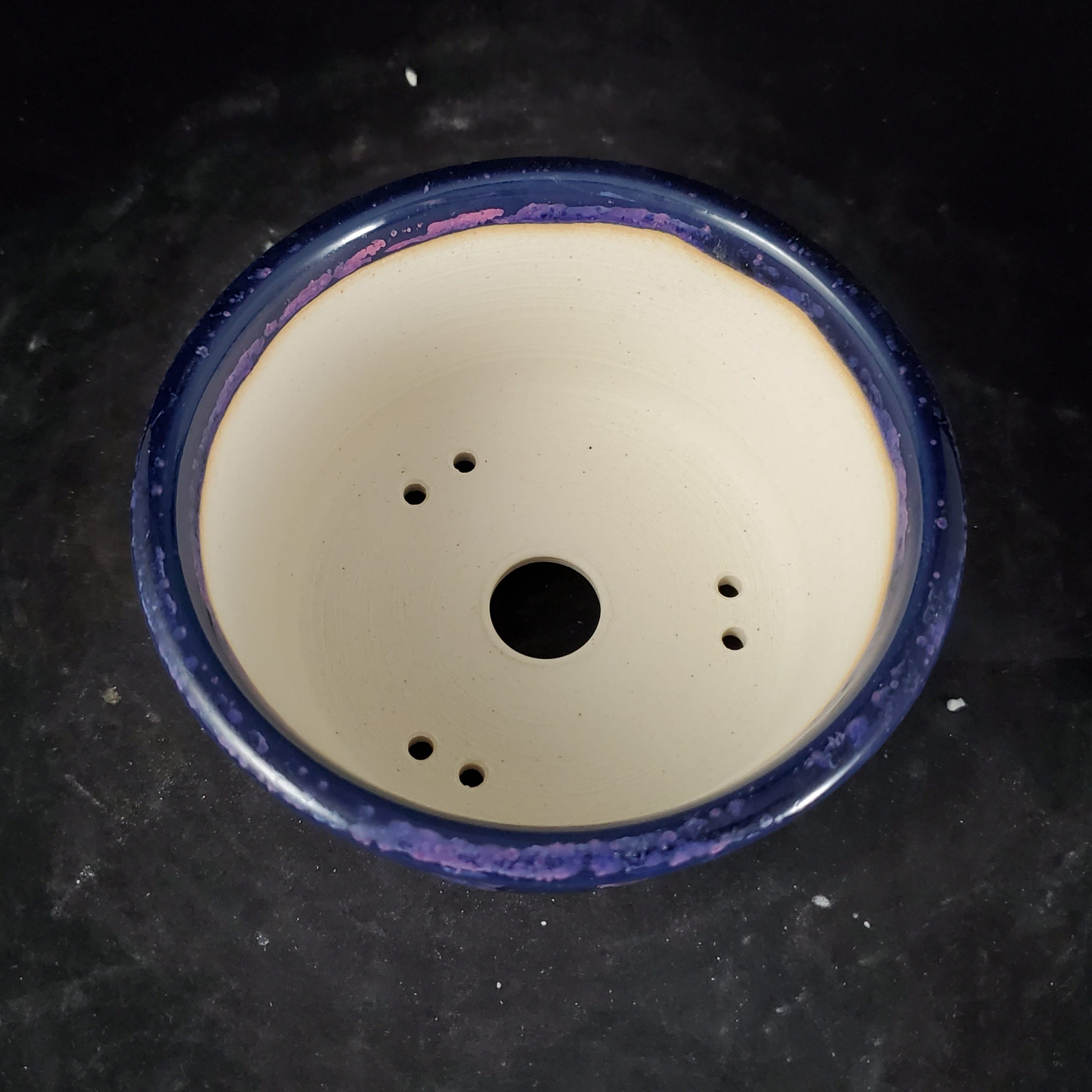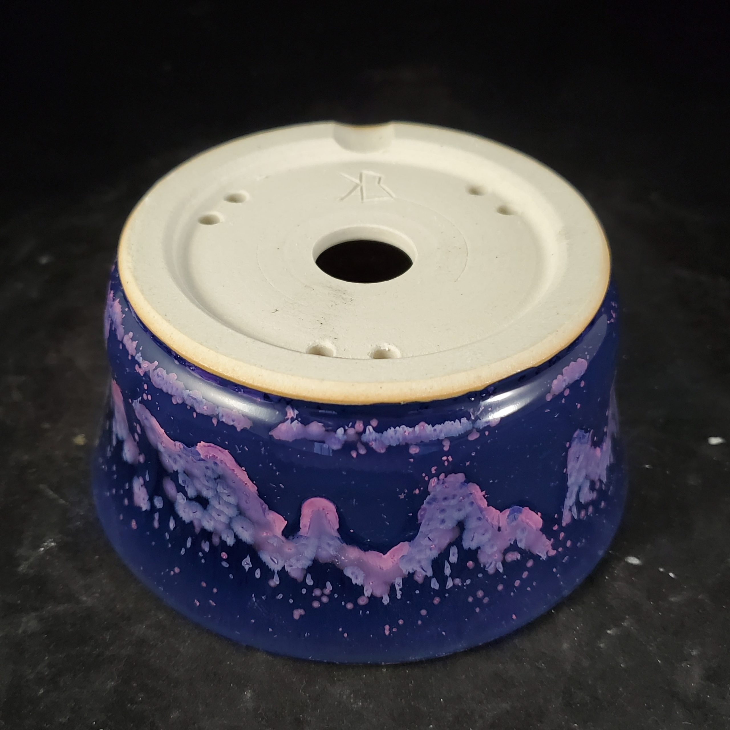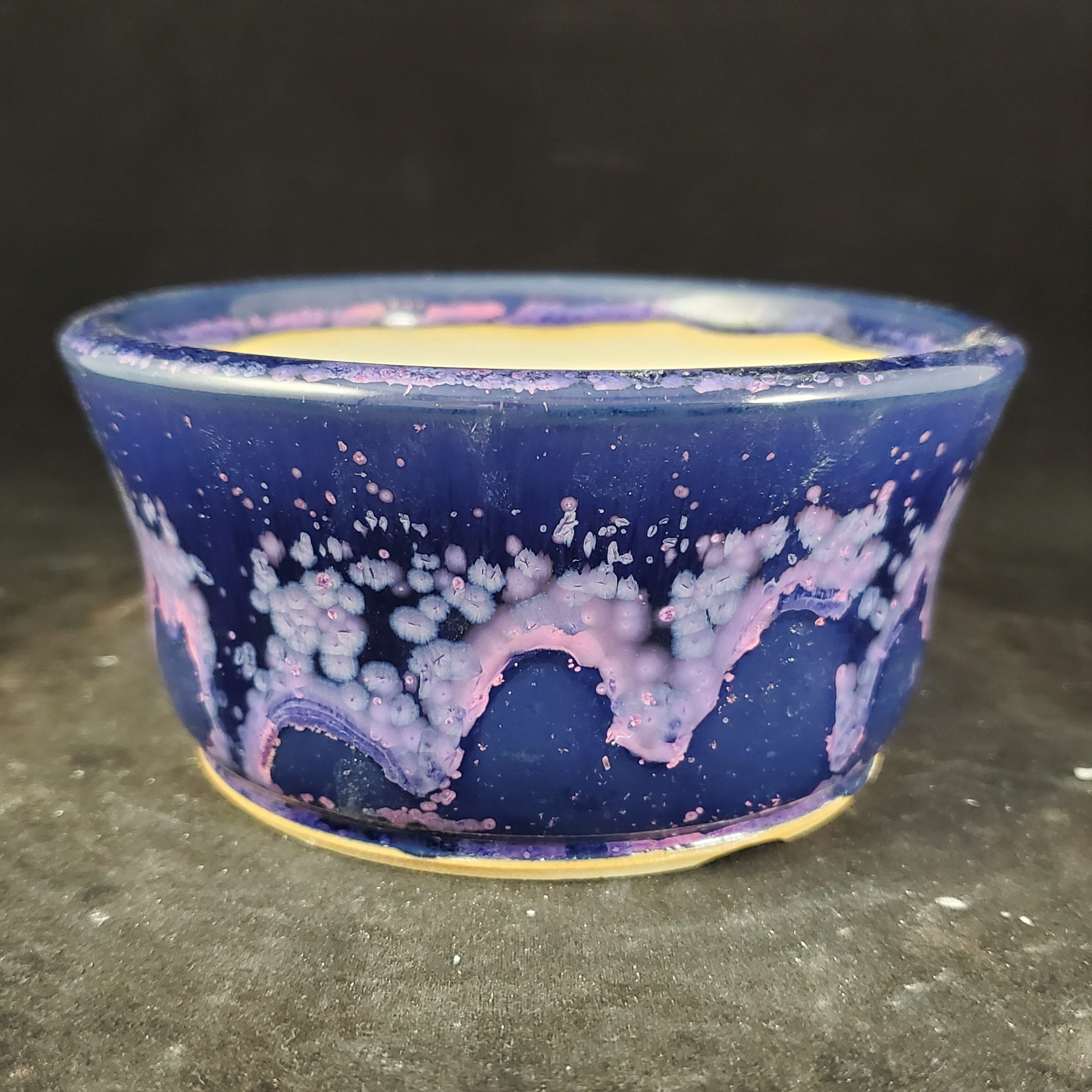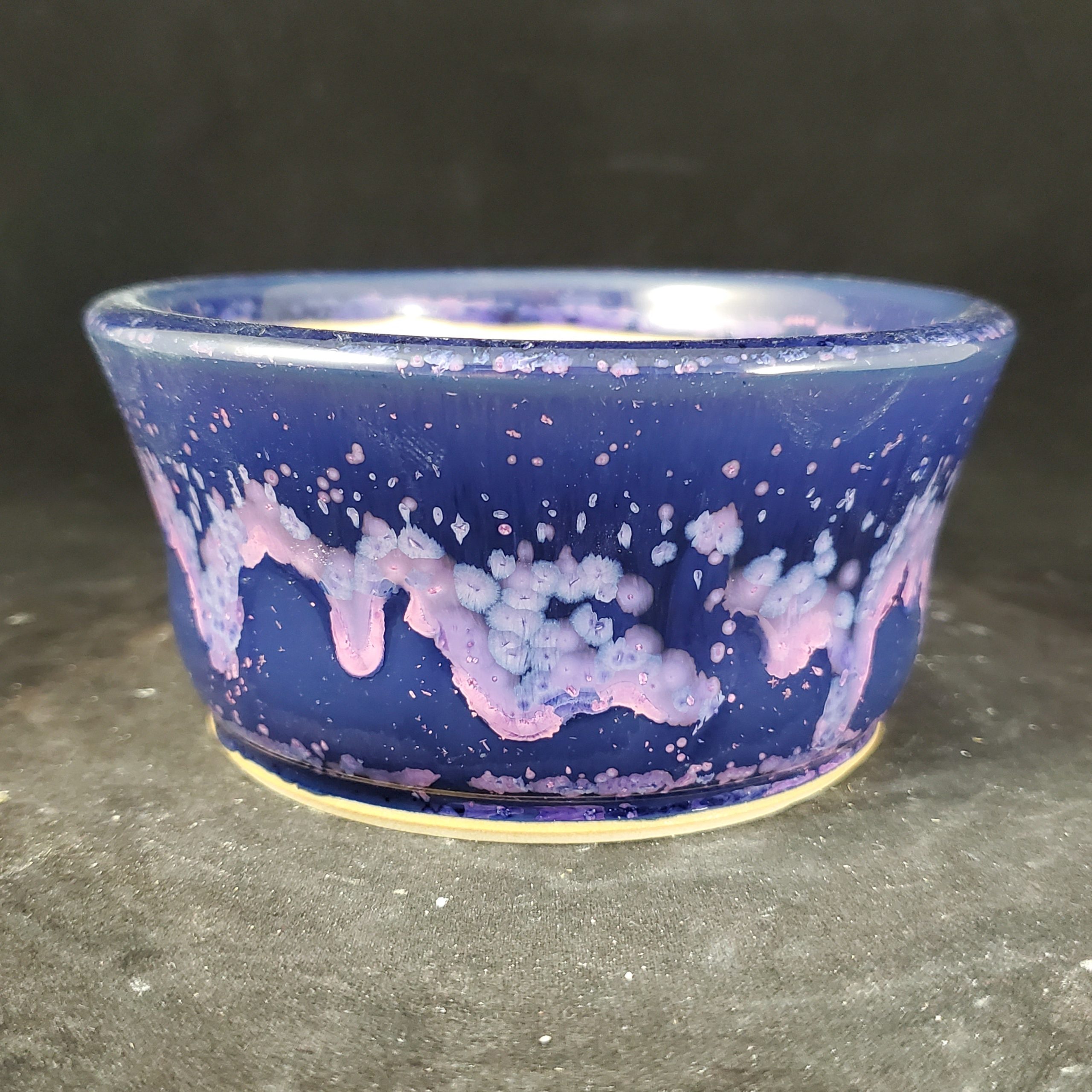 This small ceramic planter is a perfect choice for housing small plants like succulents or bonsai. It features a deep navy – blue exterior glaze with white and pink/purple splattered patterns, creating a galaxy – like aesthetic. The interior is made of unglazed light – colored clay, and it has a well – designed drainage system at the bottom.