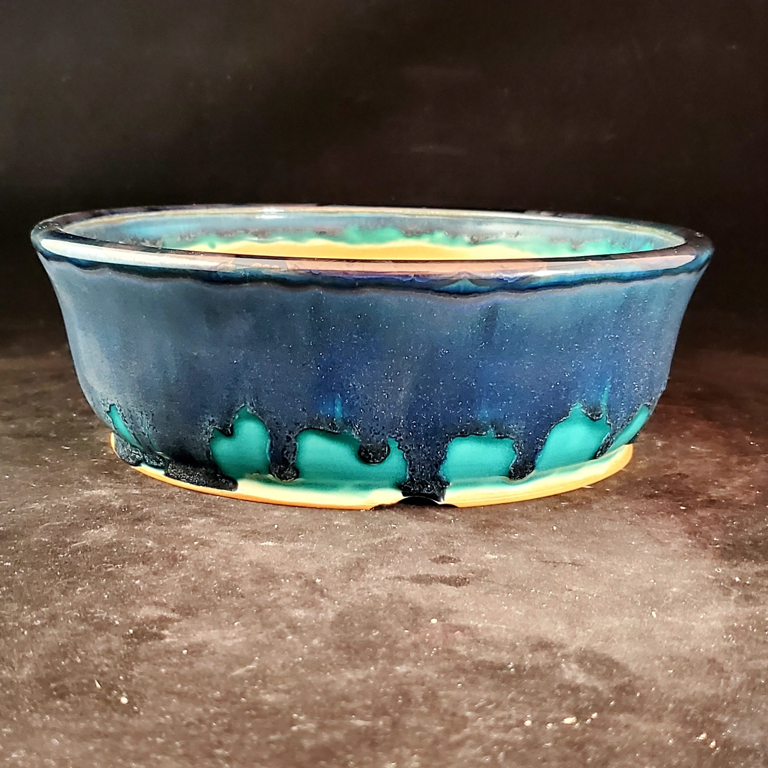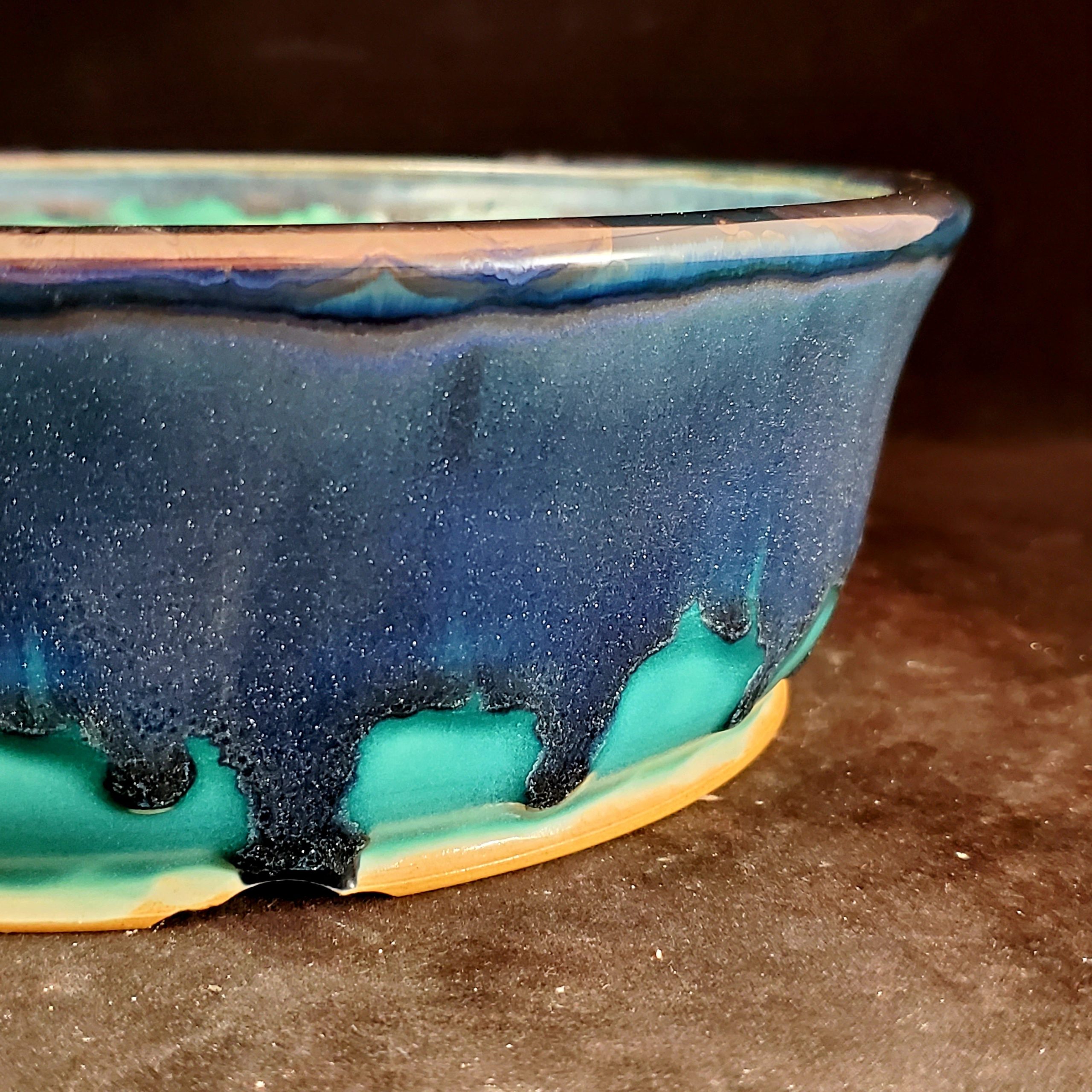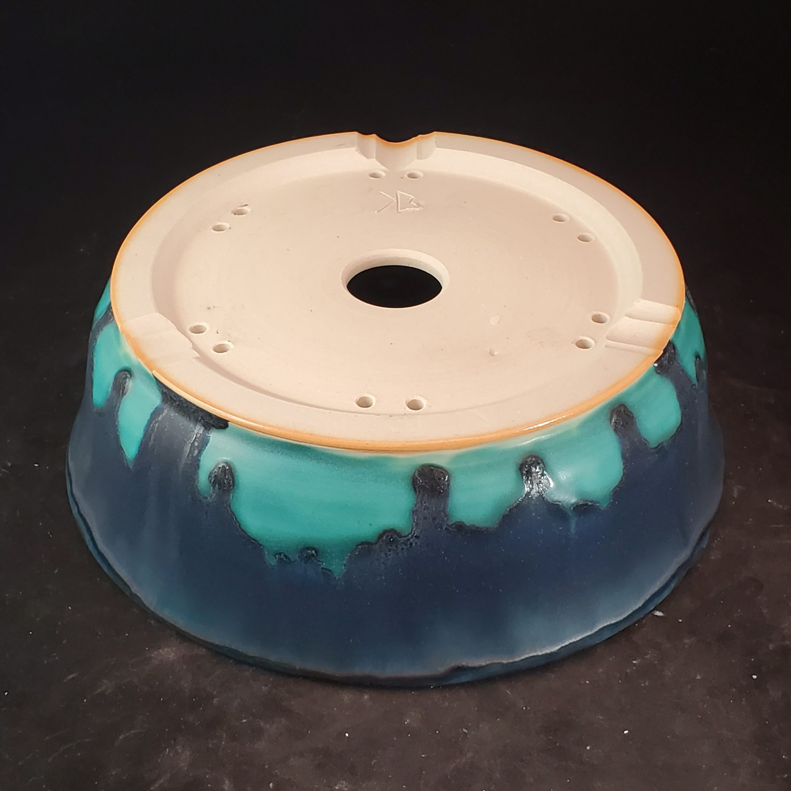 | Patterns/Textures | Blue glaze transitions into teal in irregular, “dripping” patterns, creating a marbled, organic effect; glossy finish |
