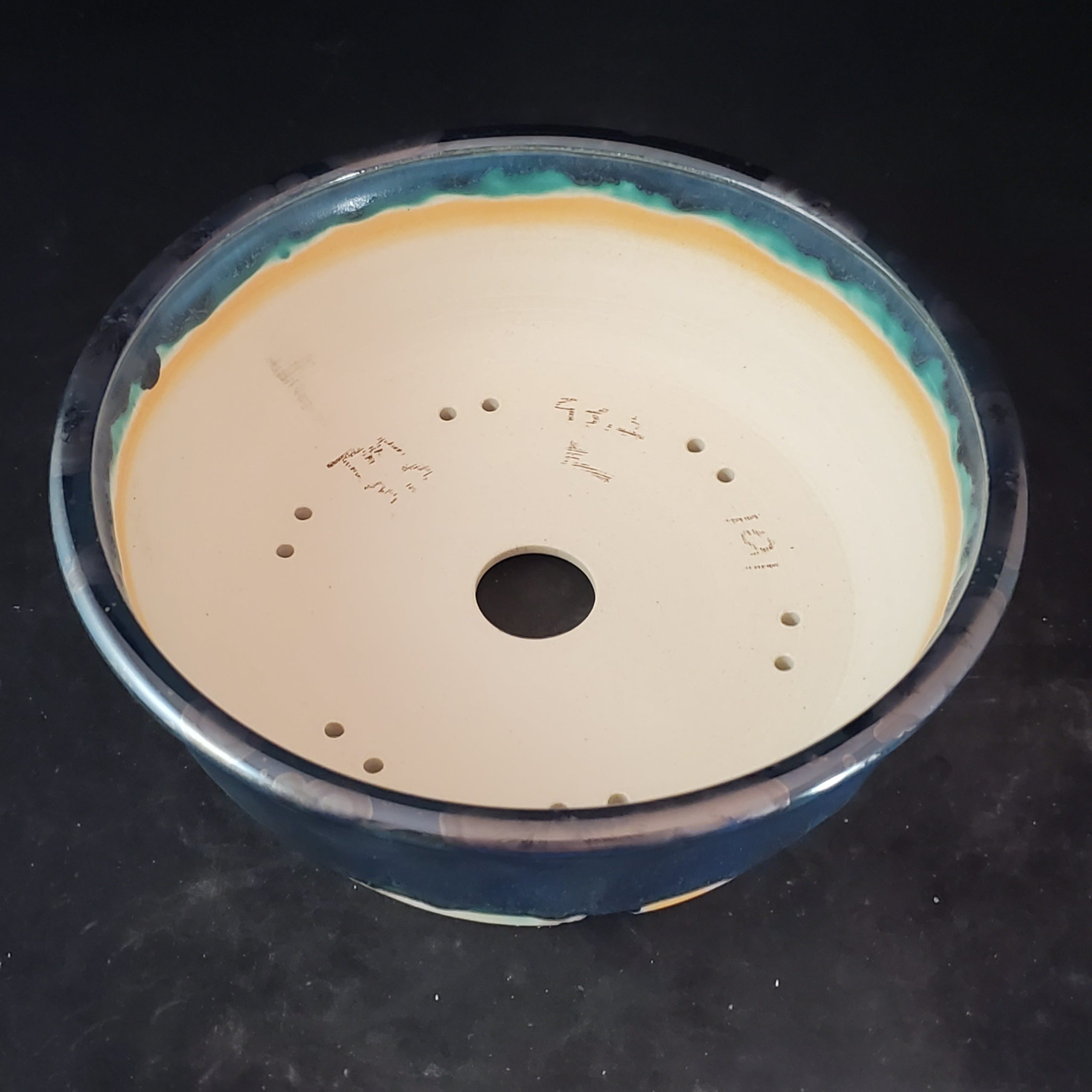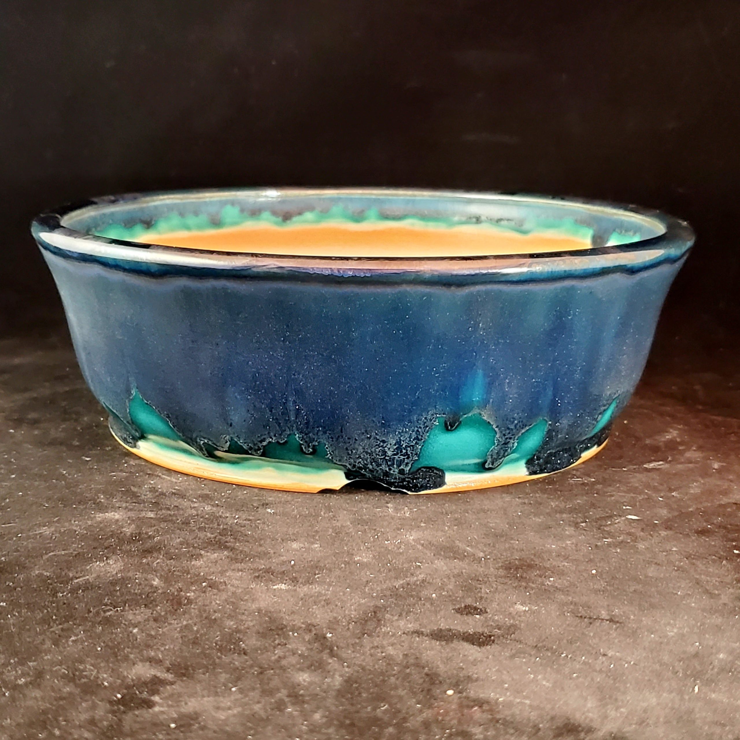 This is a beautifully crafted ceramic bonsai pot. It showcases a stunning marbled design with deep blue and teal/turquoise accents on the exterior, while the interior has a yellowish peach hue. The pot has a shallow, wide shape and comes with proper drainage holes, making it perfect for growing bonsai or other small plants.