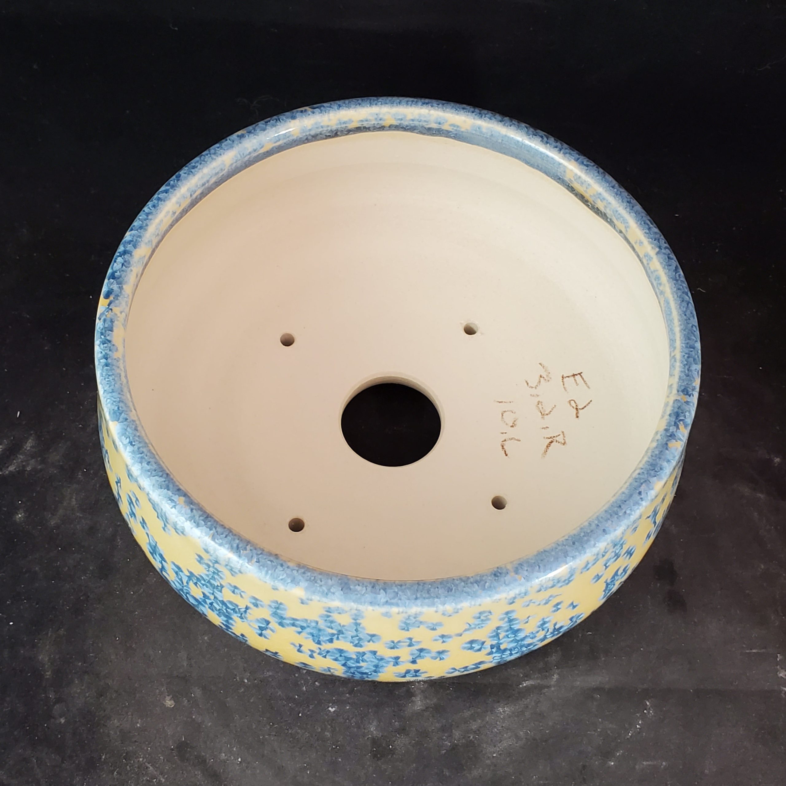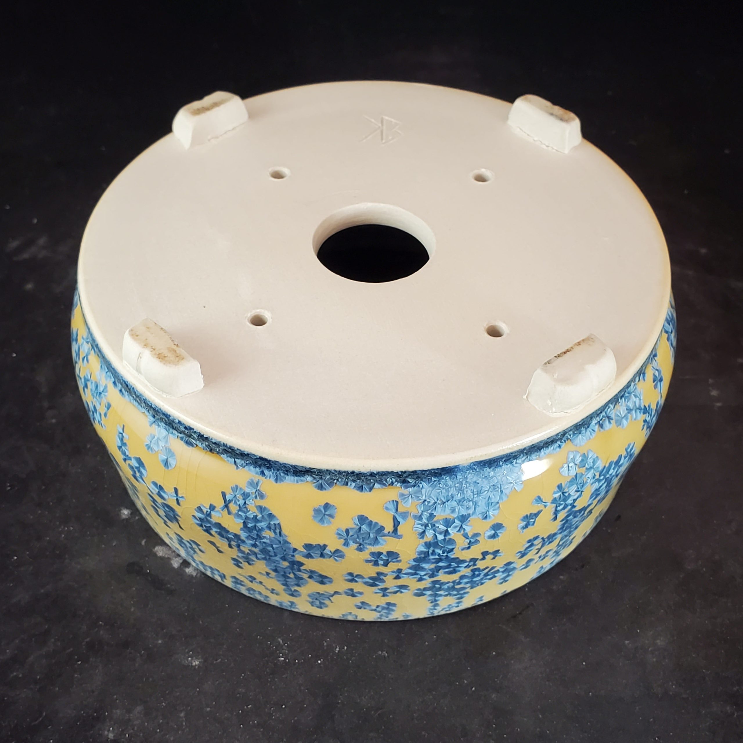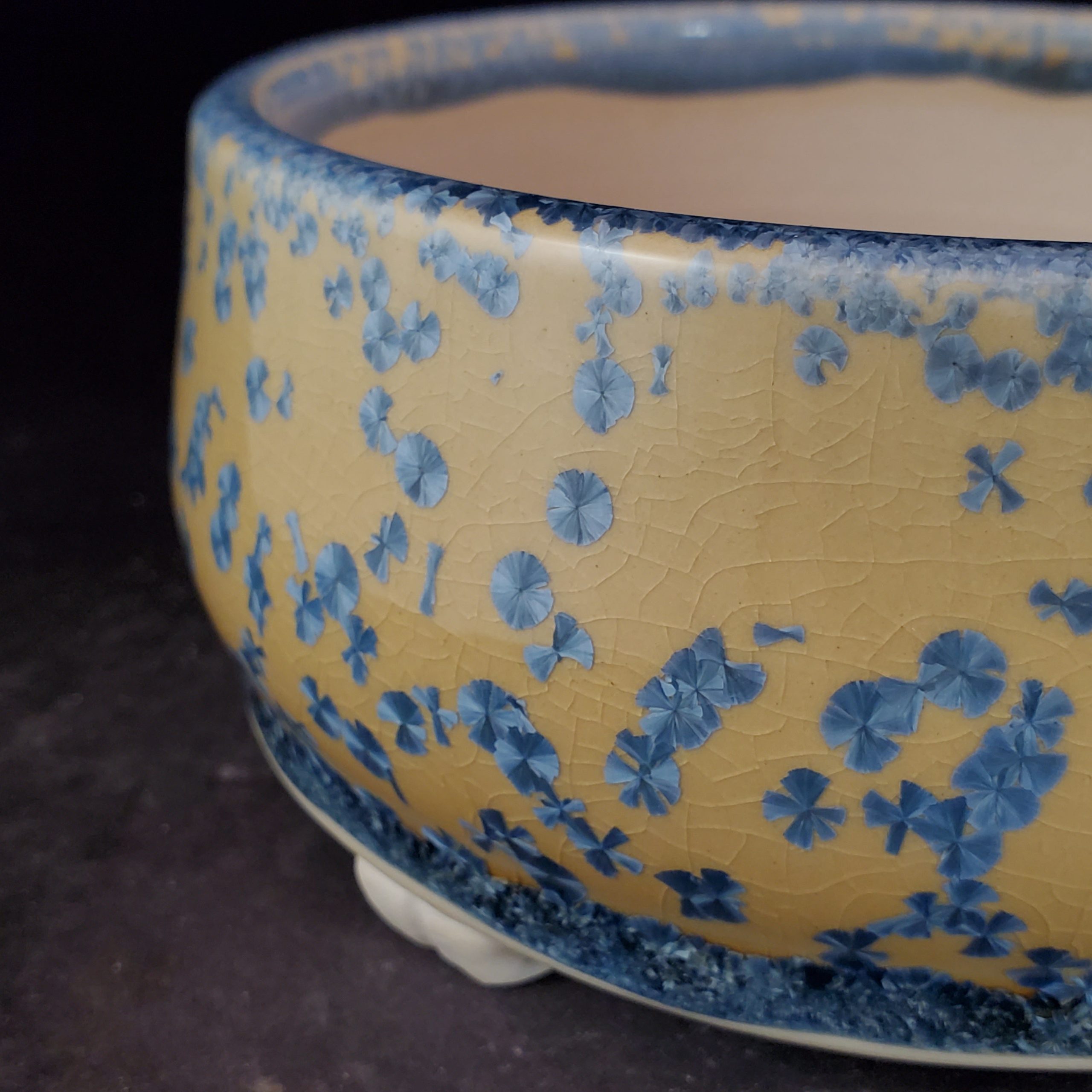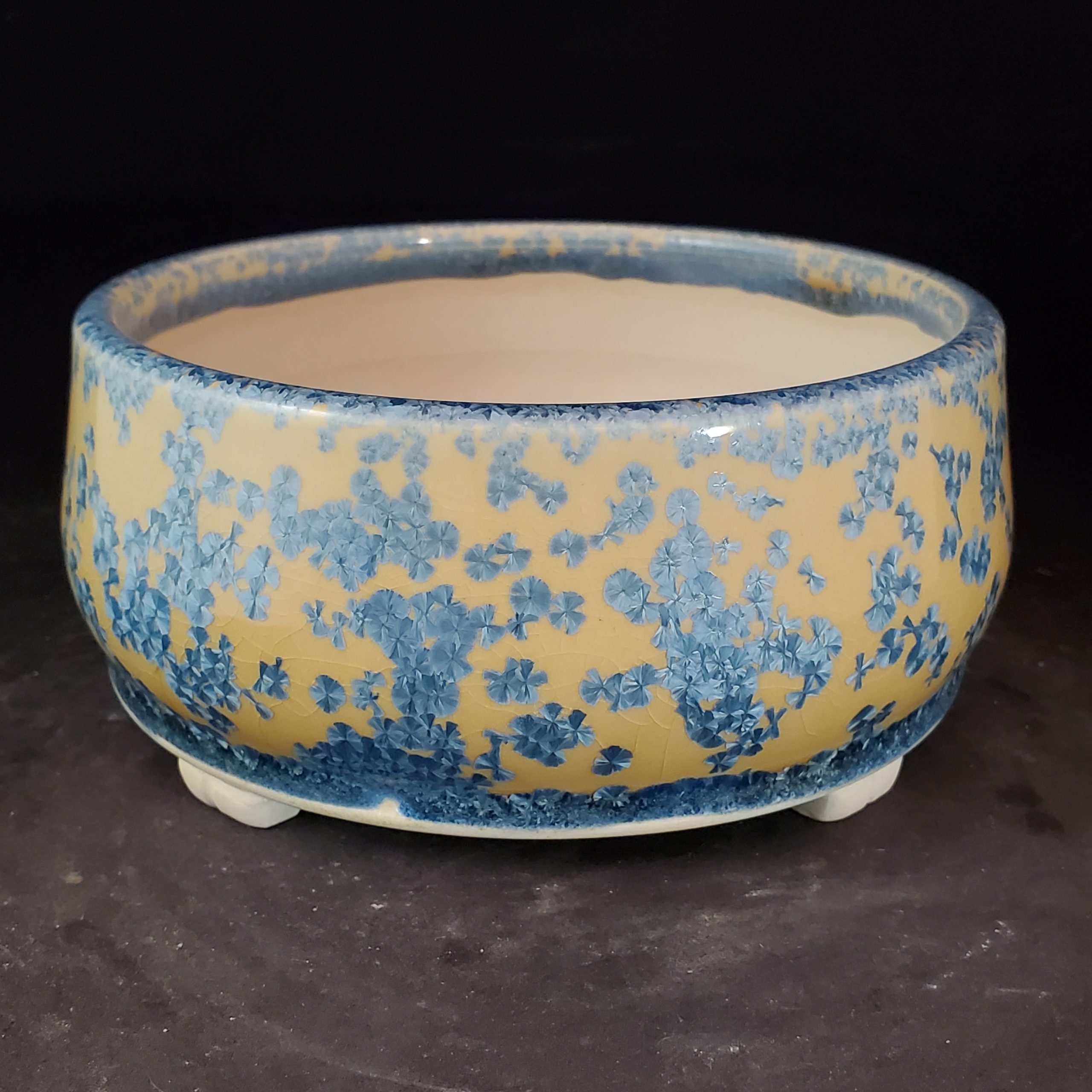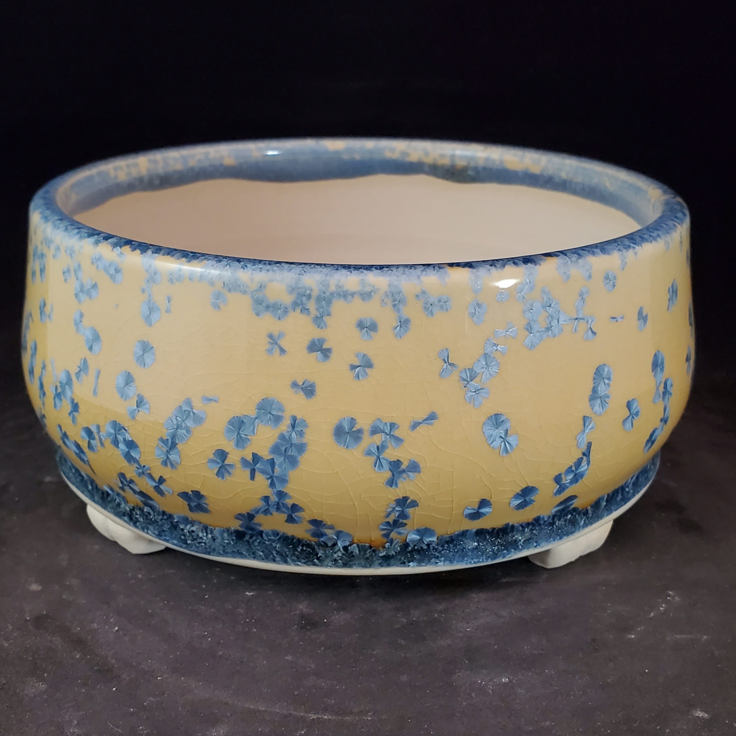 This is a charming decorative ceramic planter. It features a crackled yellow base with blue floral motifs and a blue rim band, offering both functionality and aesthetic appeal. With a central large hole and four smaller drainage holes, it’s well – suited for growing small plants like bonsai or succulents.
