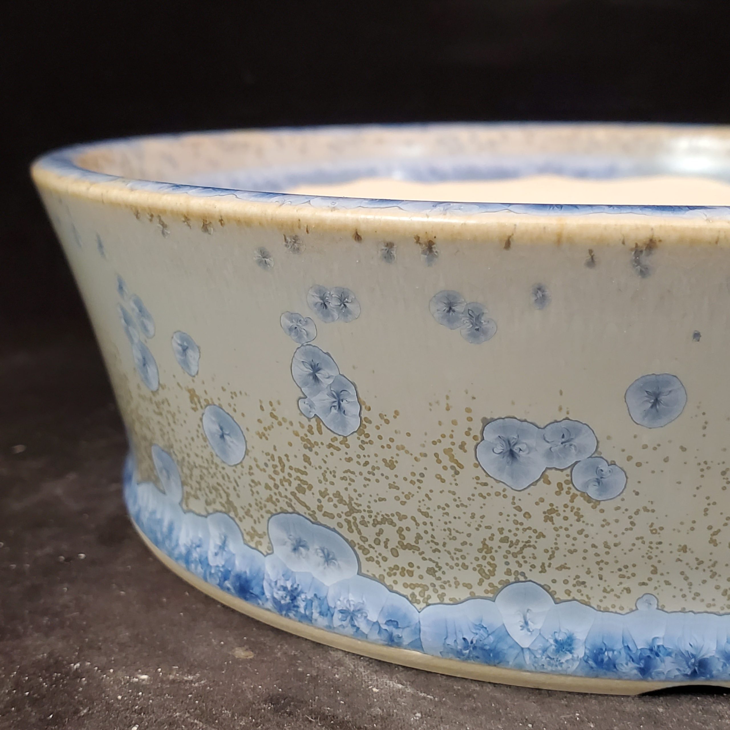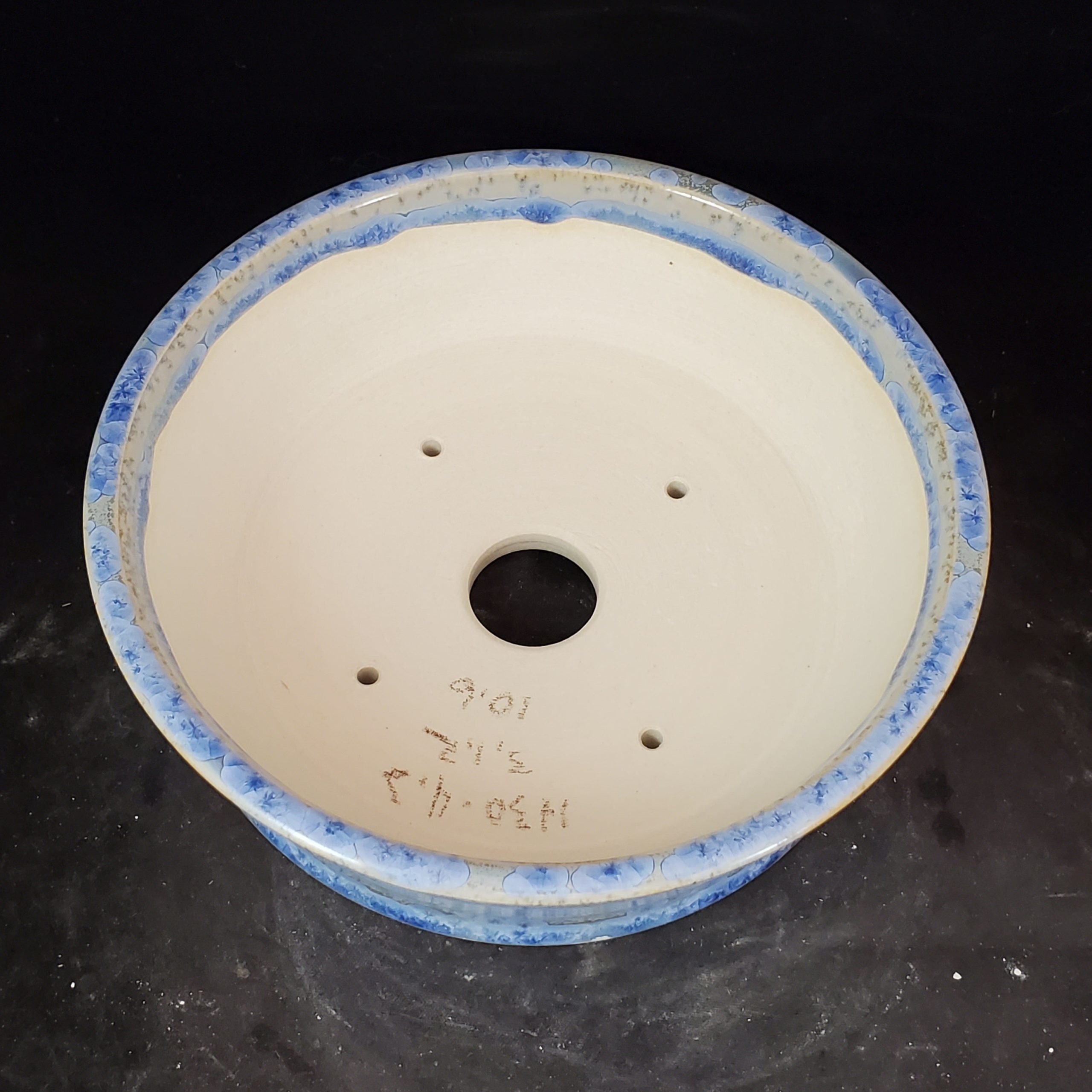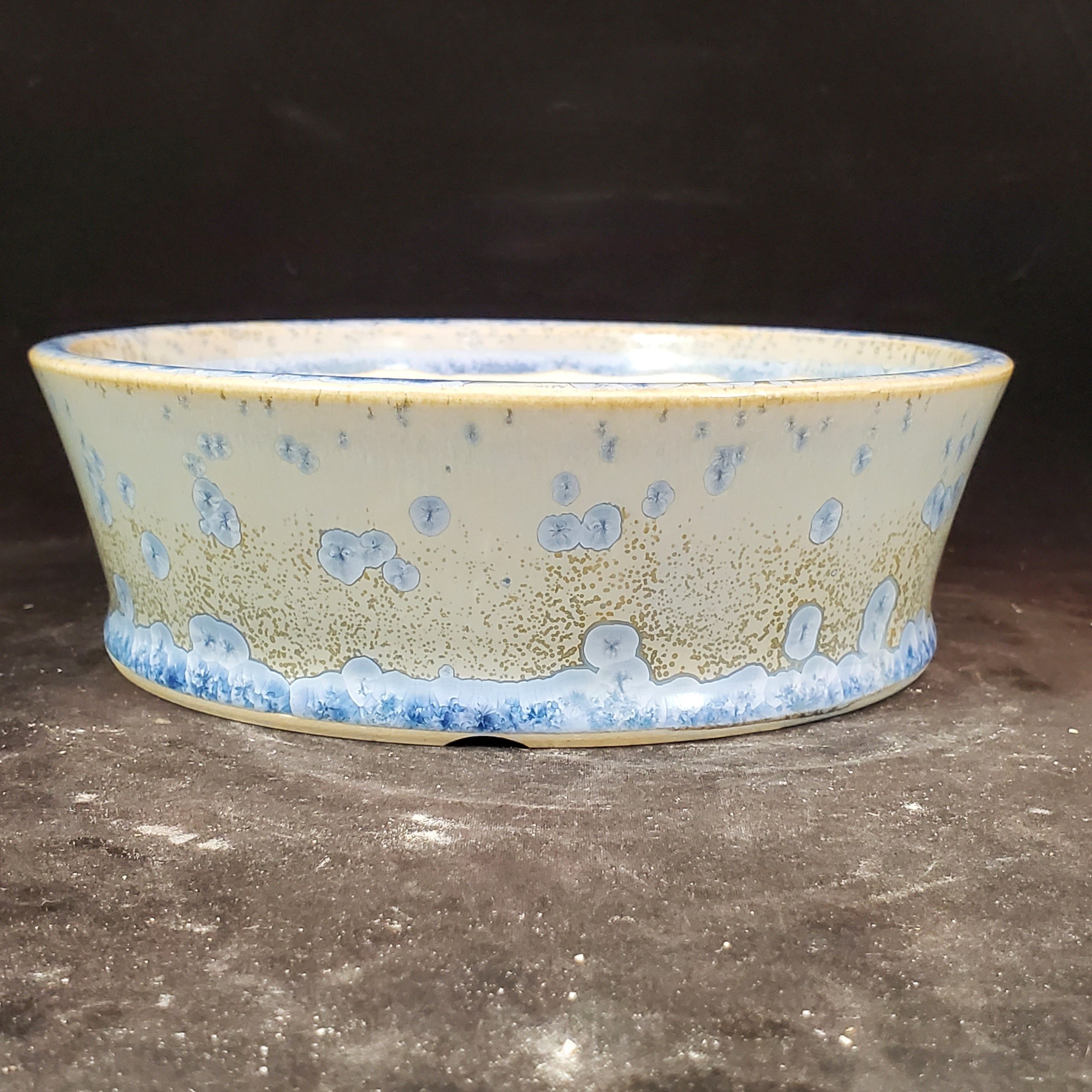 This is a medium-sized ceramic bonsai pot. It features a light cream/off – white base with blue accents and golden – beige/brown speckles. The blue floral/abstract motifs add a touch of elegance, and the subtle cracked glaze texture makes it visually appealing. The pot’s design with multiple drainage holes ensures proper water management for the plants.
