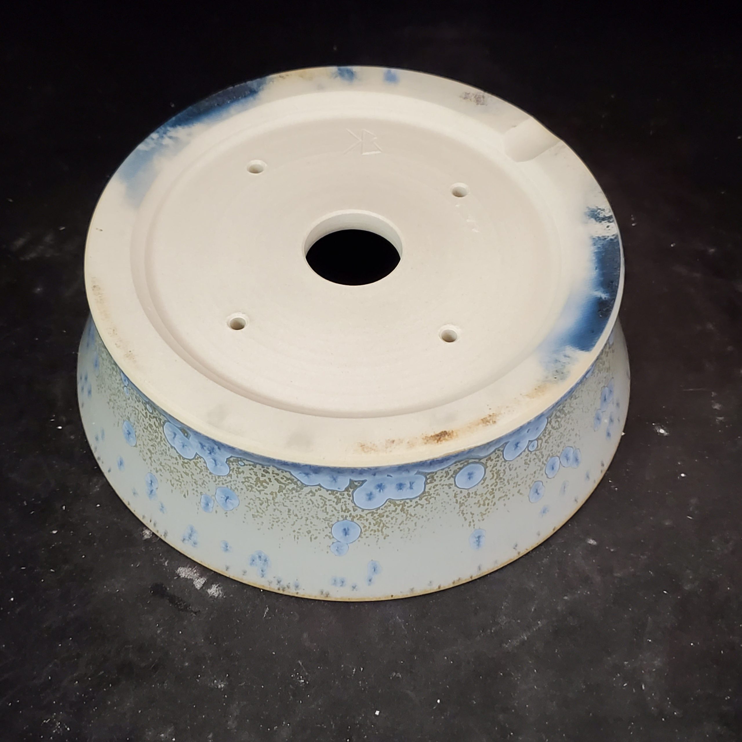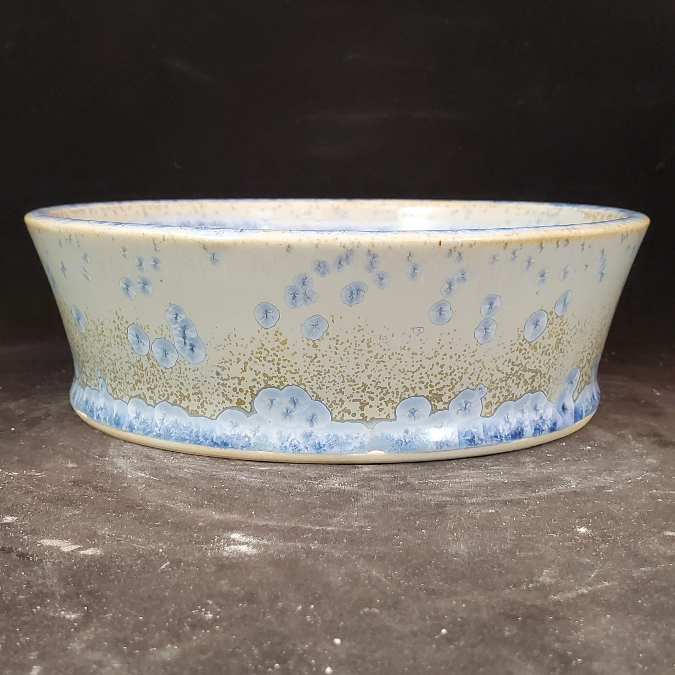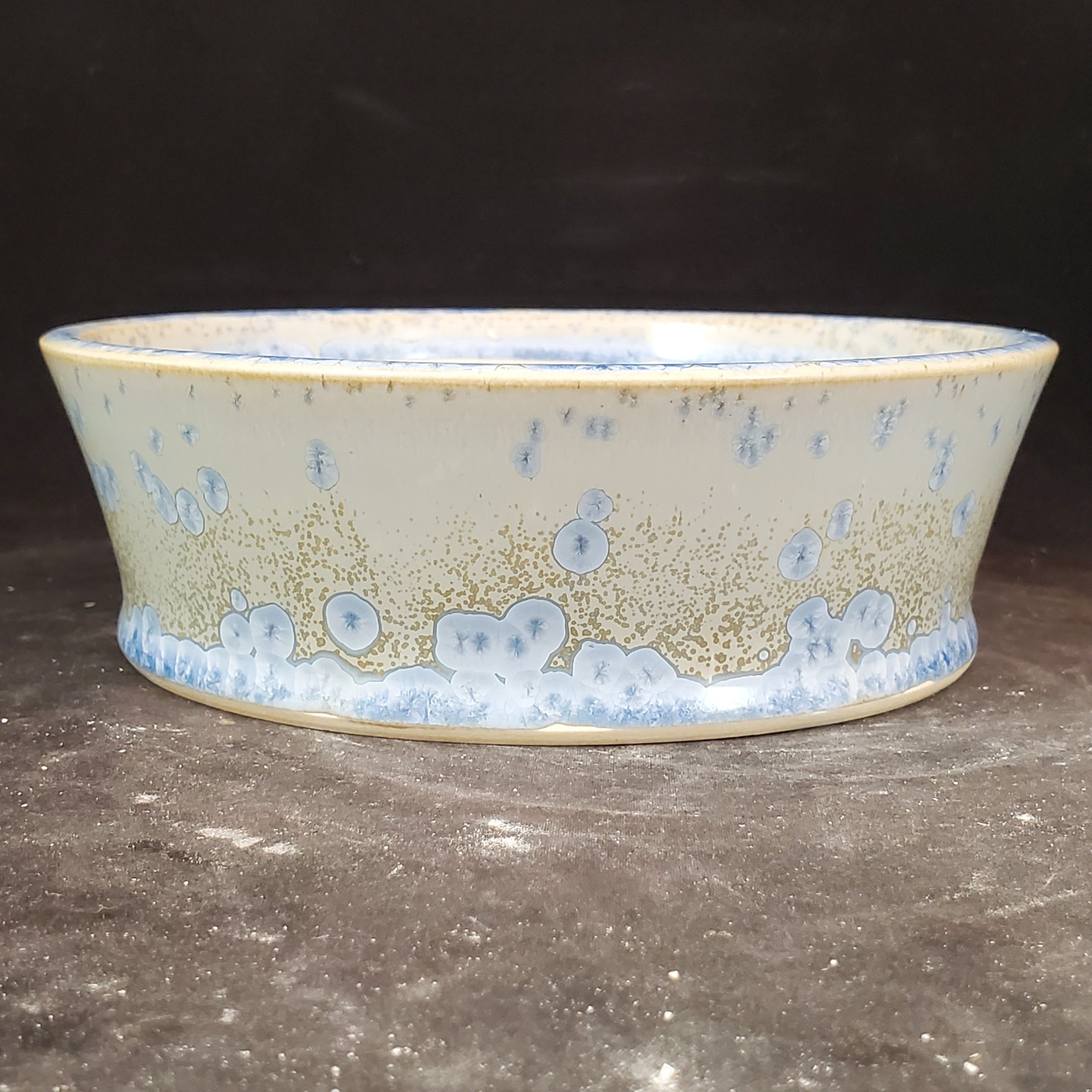 This is a medium-sized ceramic bonsai pot. It features a light cream/off – white base with blue accents and golden – beige/brown speckles. The blue floral/abstract motifs add a touch of elegance, and the subtle cracked glaze texture makes it visually appealing. The pot’s design with multiple drainage holes ensures proper water management for the plants.