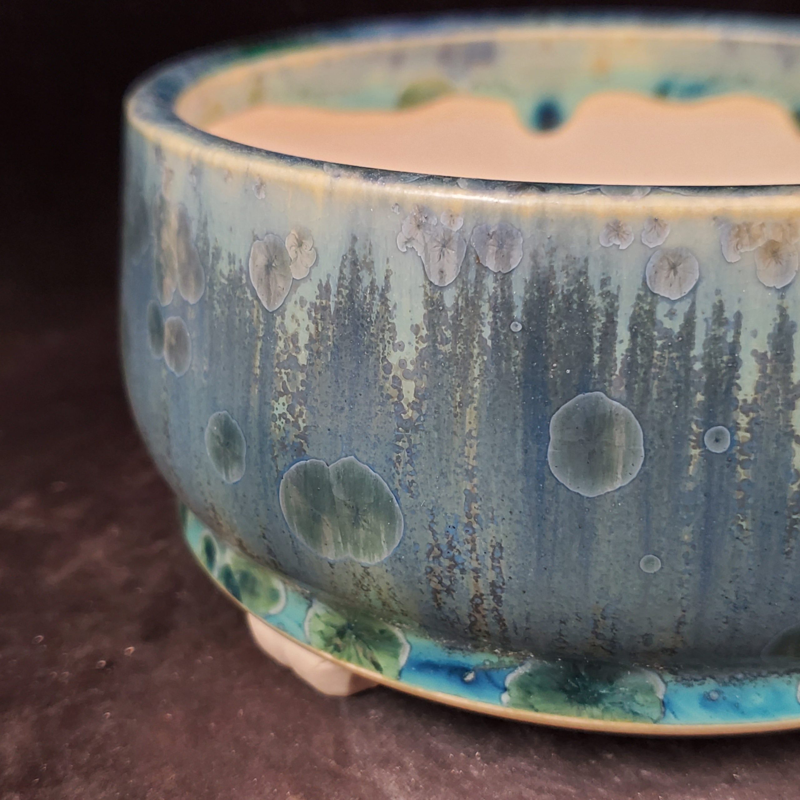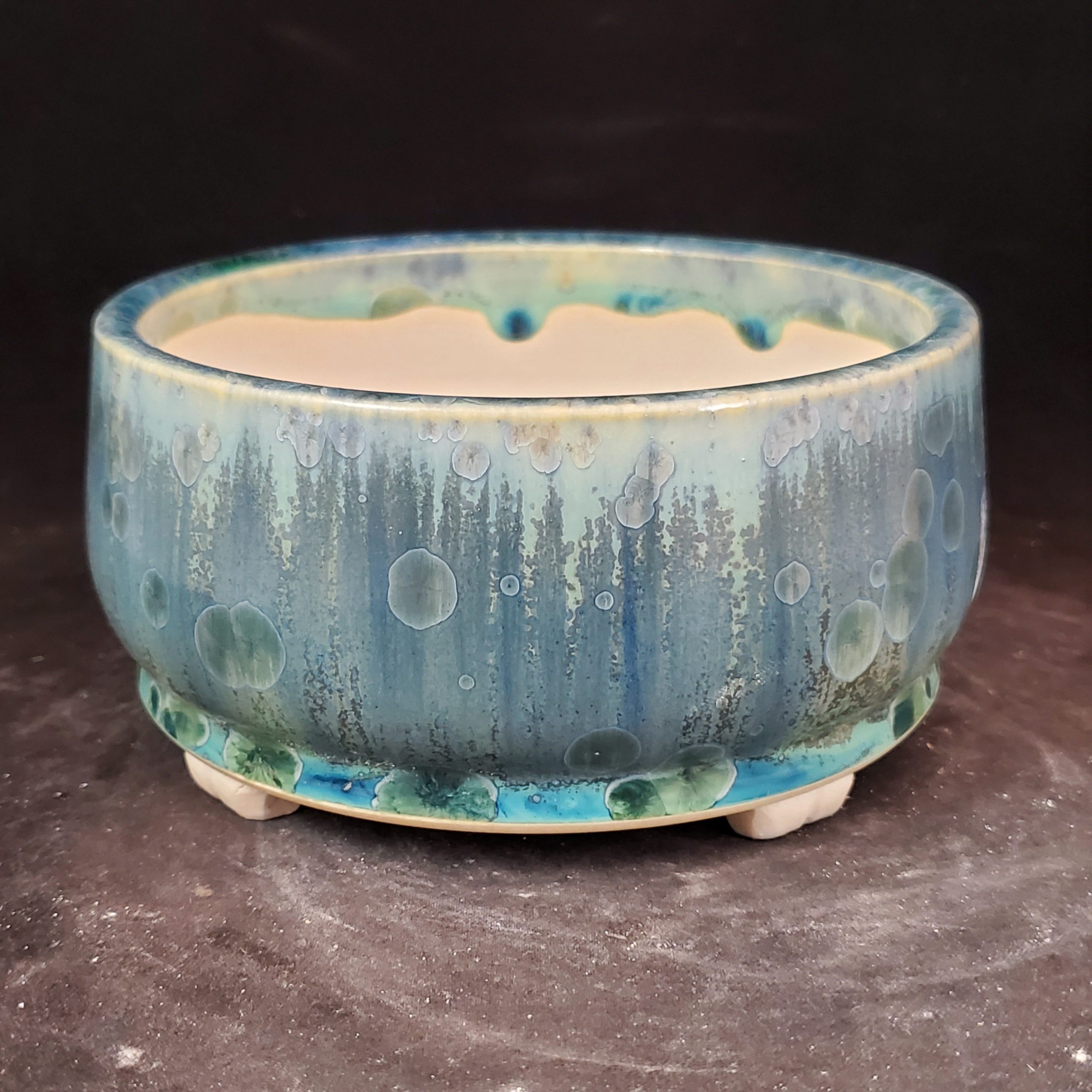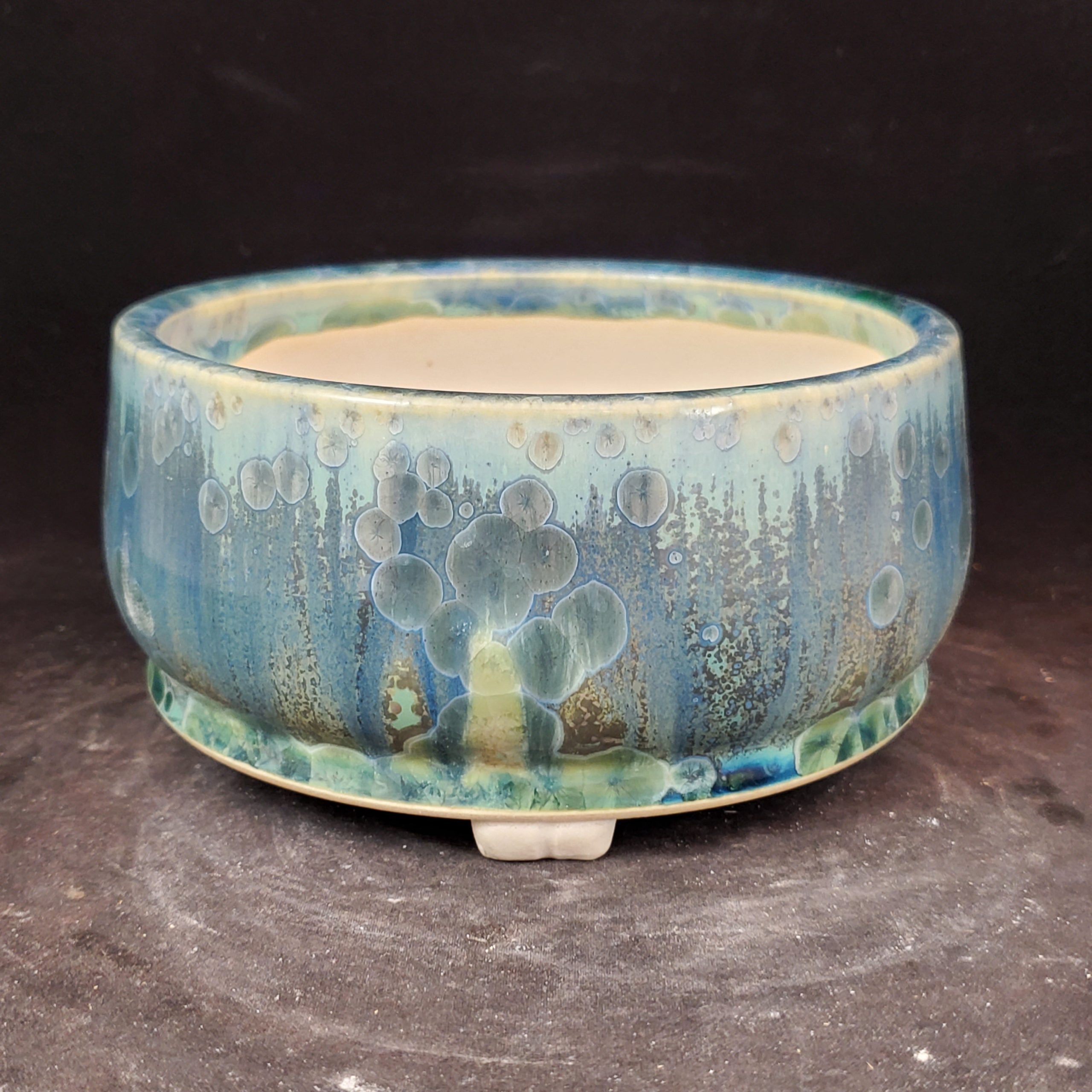 - A glossy, durable glaze on the exterior with intentional bubble patterns, adding aesthetic value and protection.