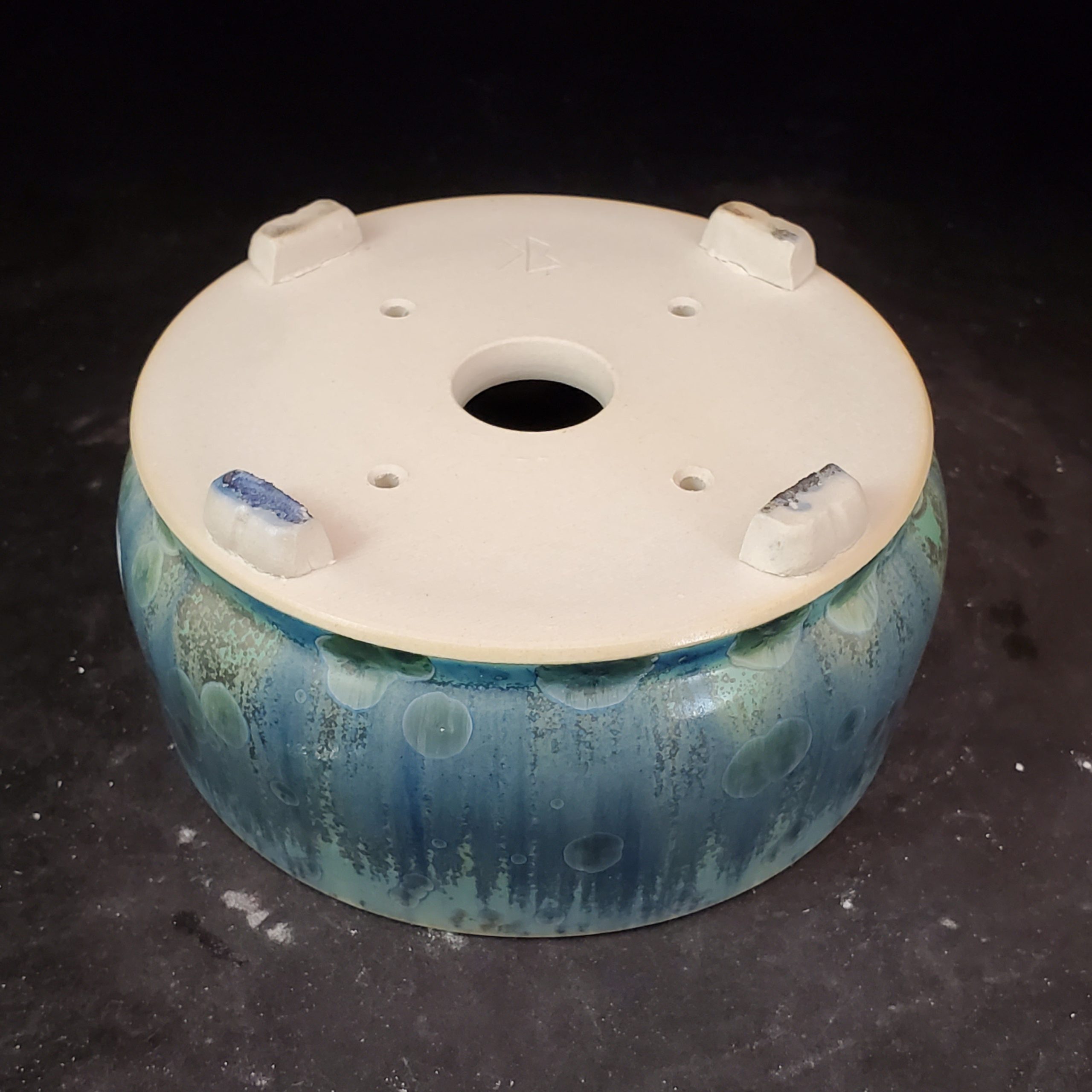 - Four small, white, unglazed feet that lift the pot off surfaces, aiding airflow and preventing moisture accumulation.