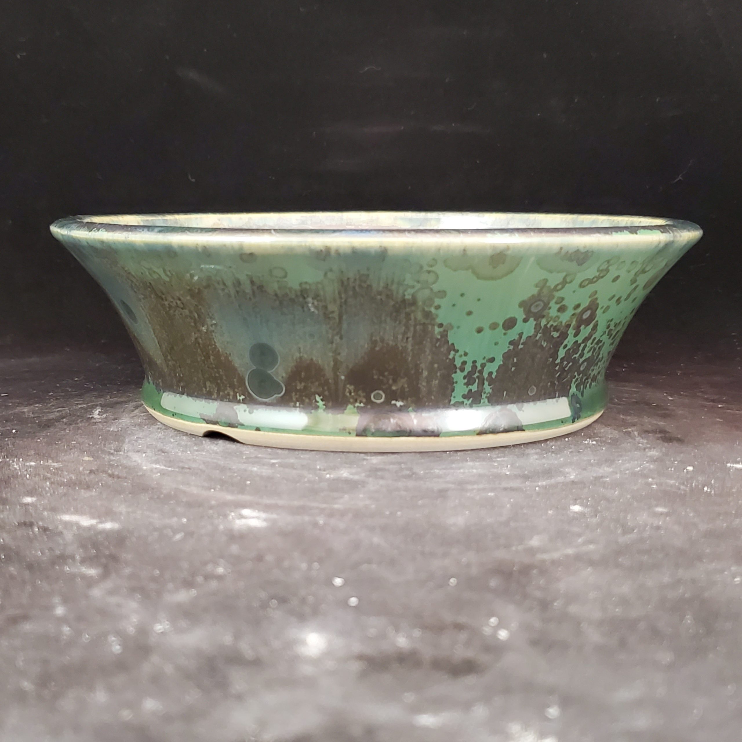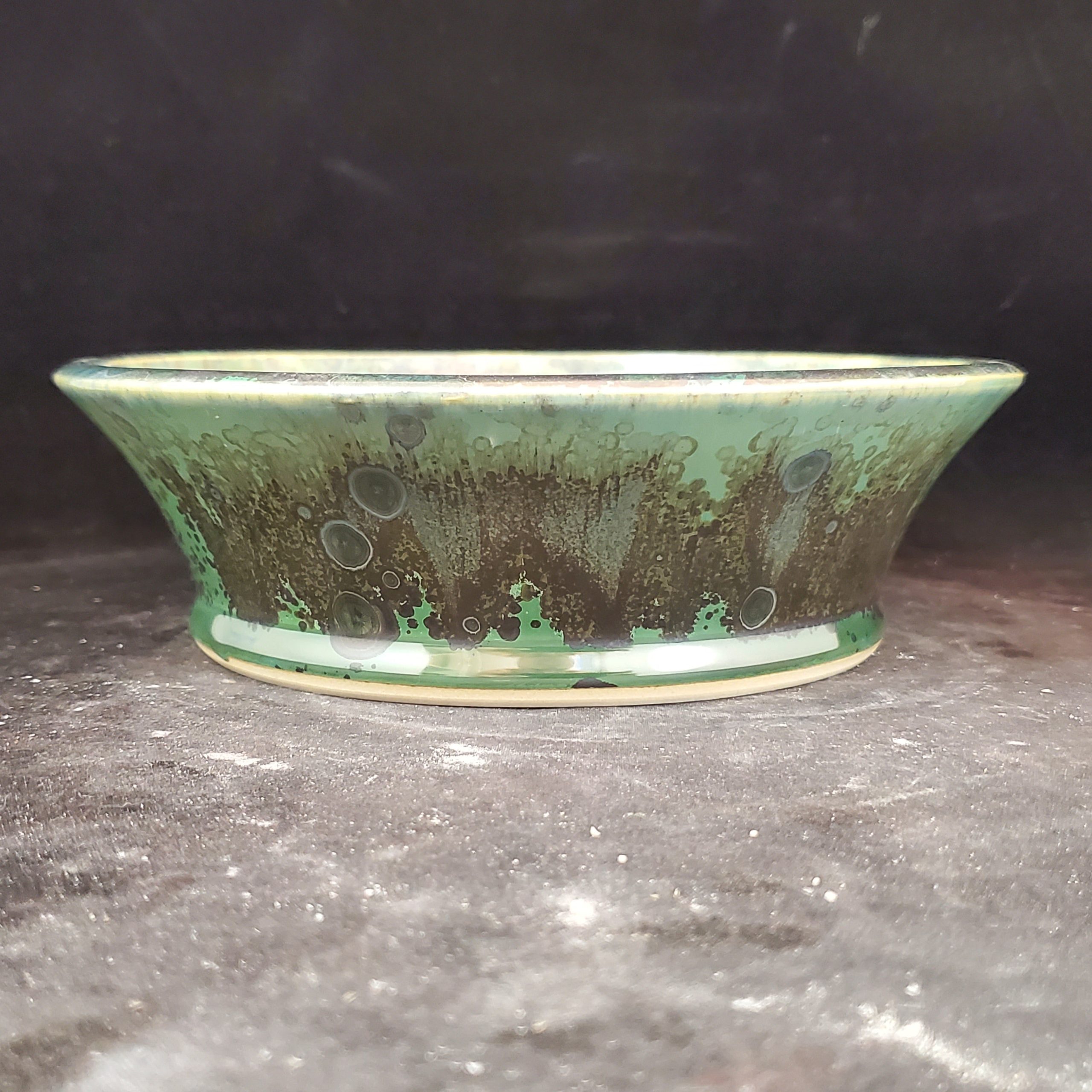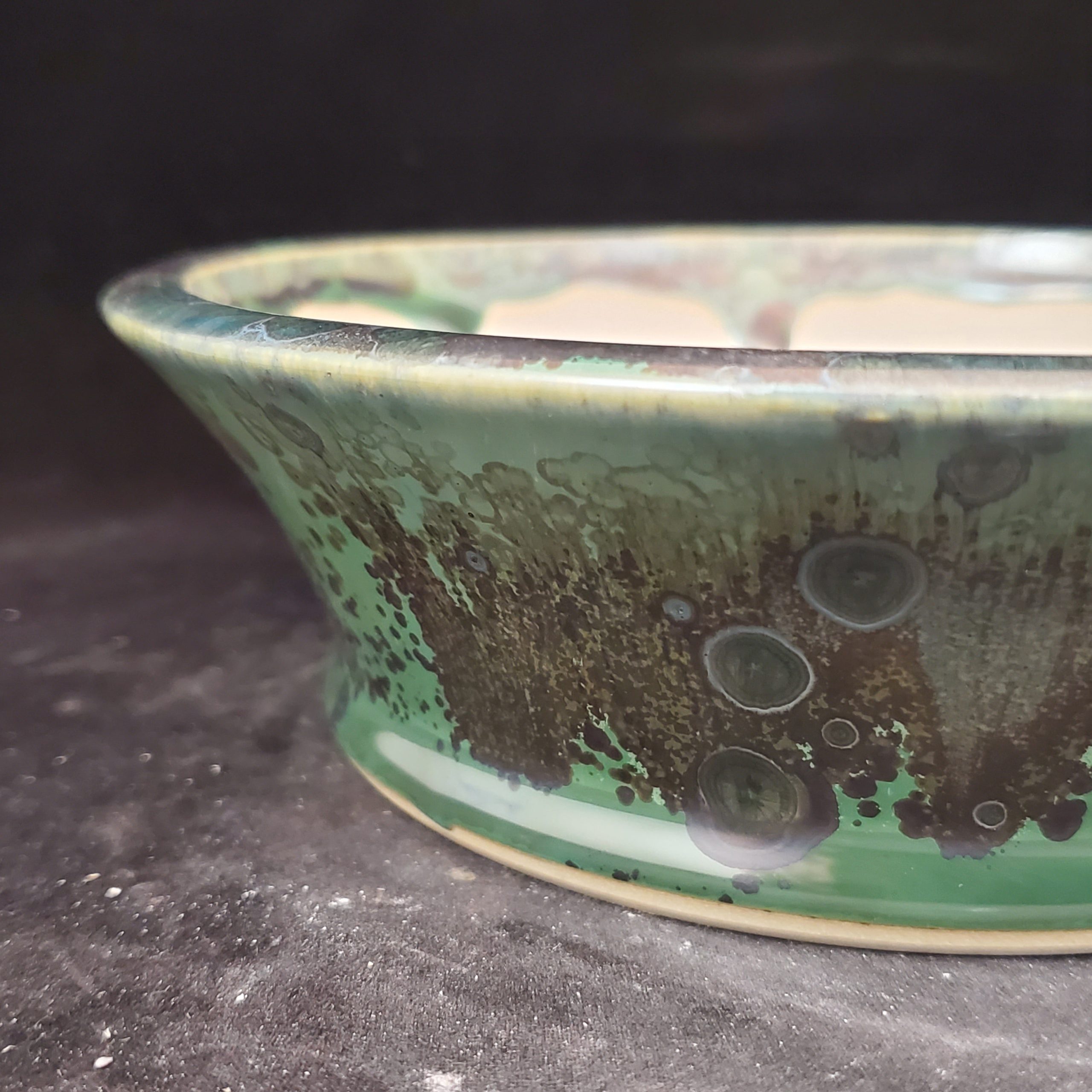 This is a shallow ceramic planter, perfect for bonsai trees or small houseplants. It features a beautiful bubbled – gradient glaze with a marbled effect of green and brown tones on the exterior, while the interior base is unglazed white ceramic. The planter has a flared – rim design and built – in drainage holes, combining functionality and aesthetics.