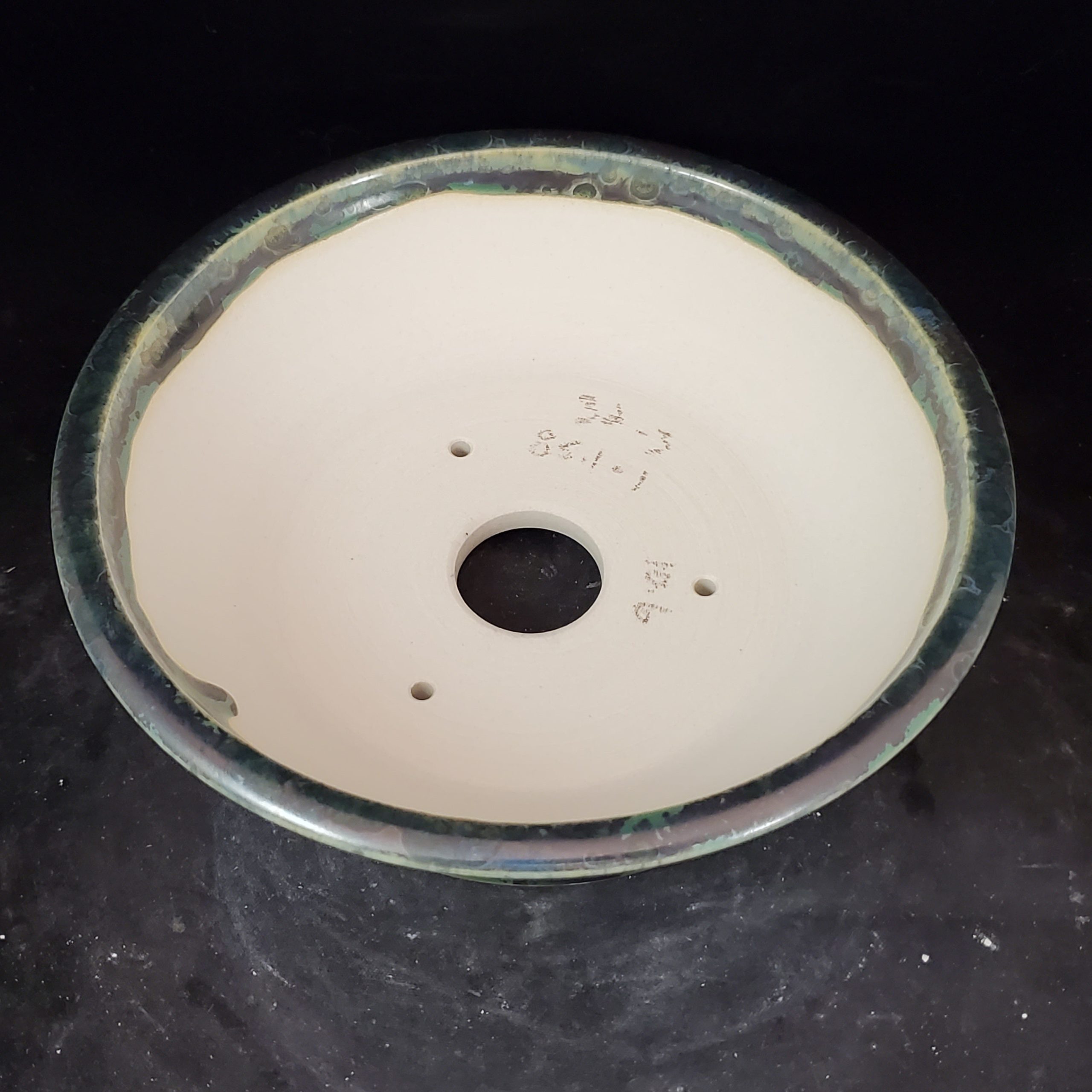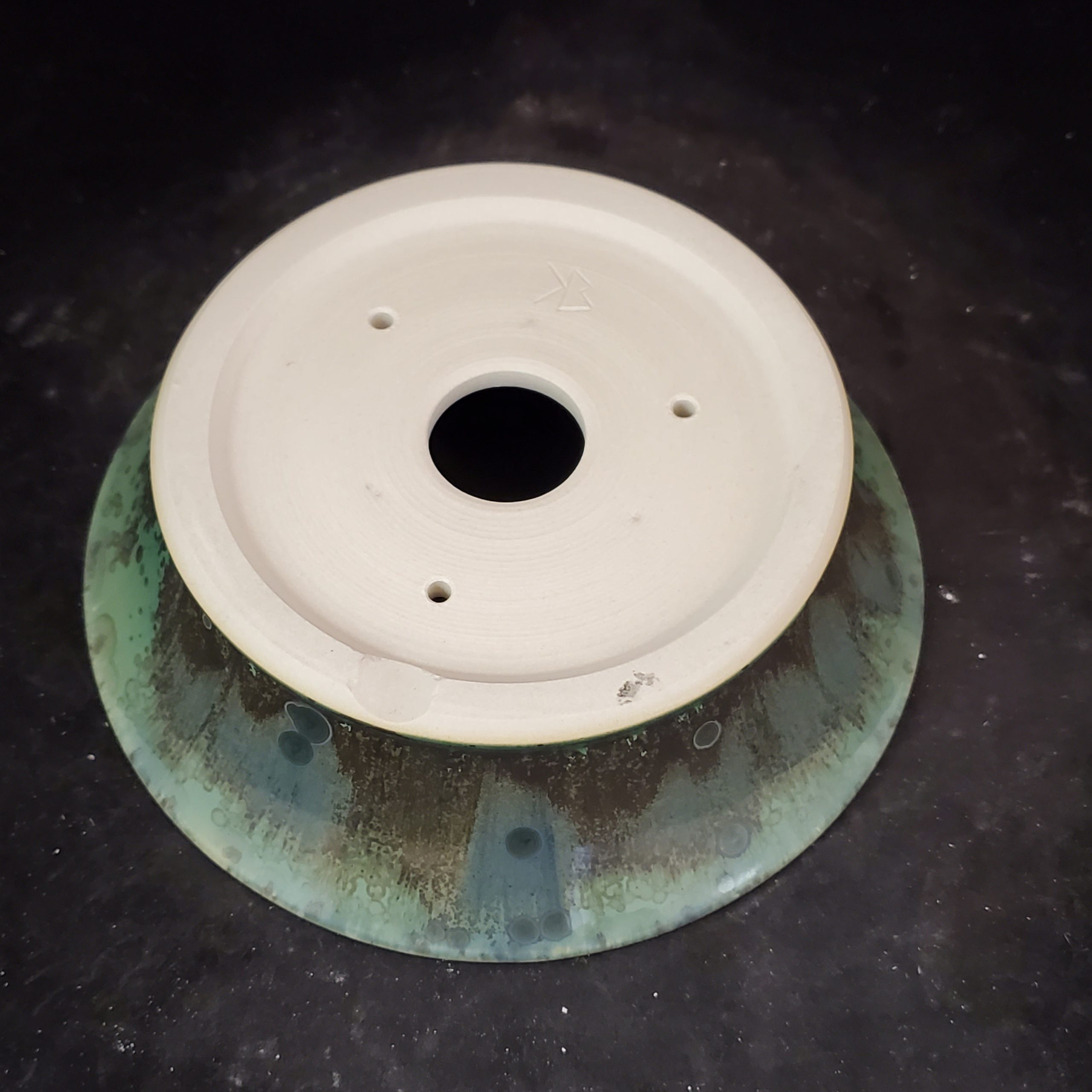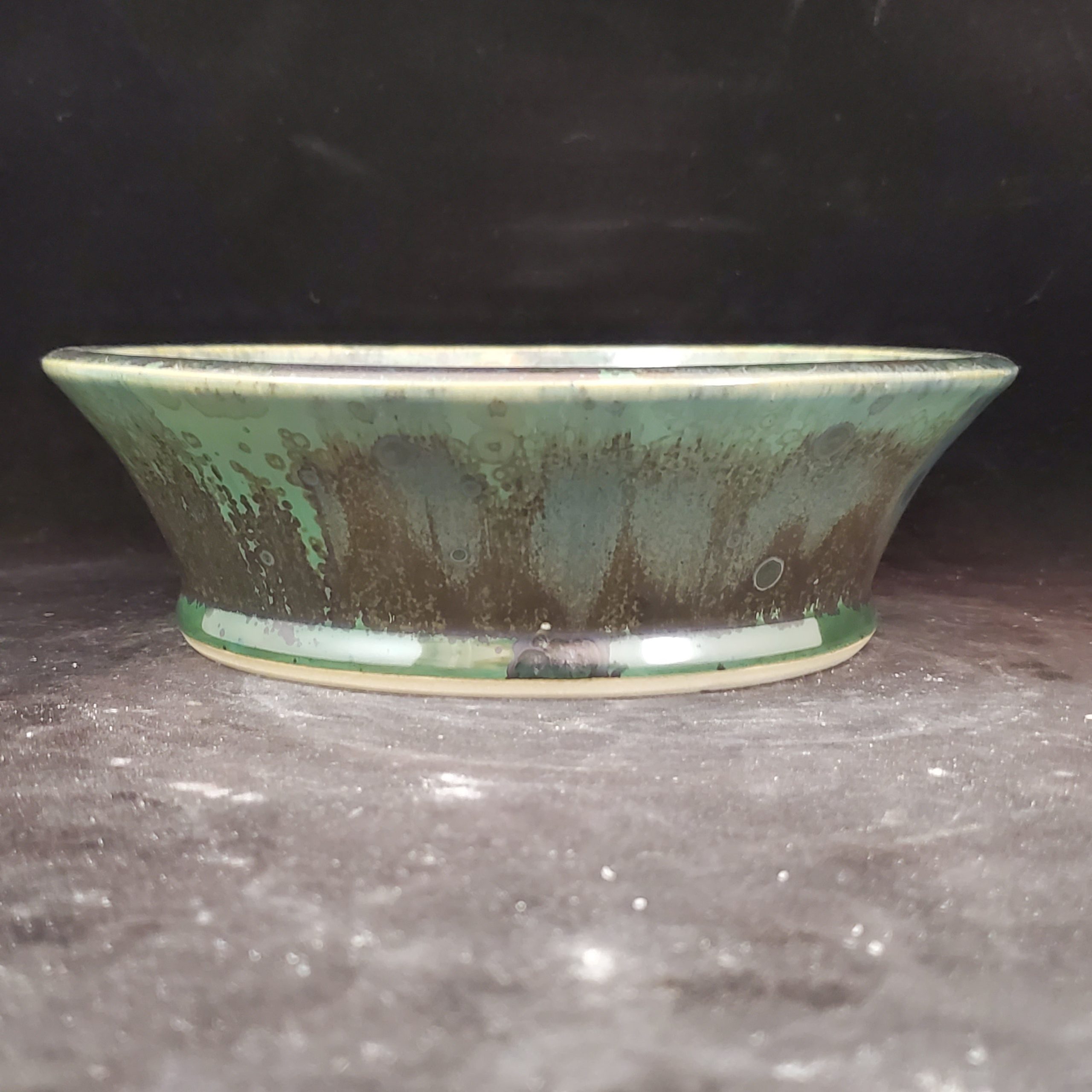 This is a shallow ceramic planter, perfect for bonsai trees or small houseplants. It features a beautiful bubbled – gradient glaze with a marbled effect of green and brown tones on the exterior, while the interior base is unglazed white ceramic. The planter has a flared – rim design and built – in drainage holes, combining functionality and aesthetics.