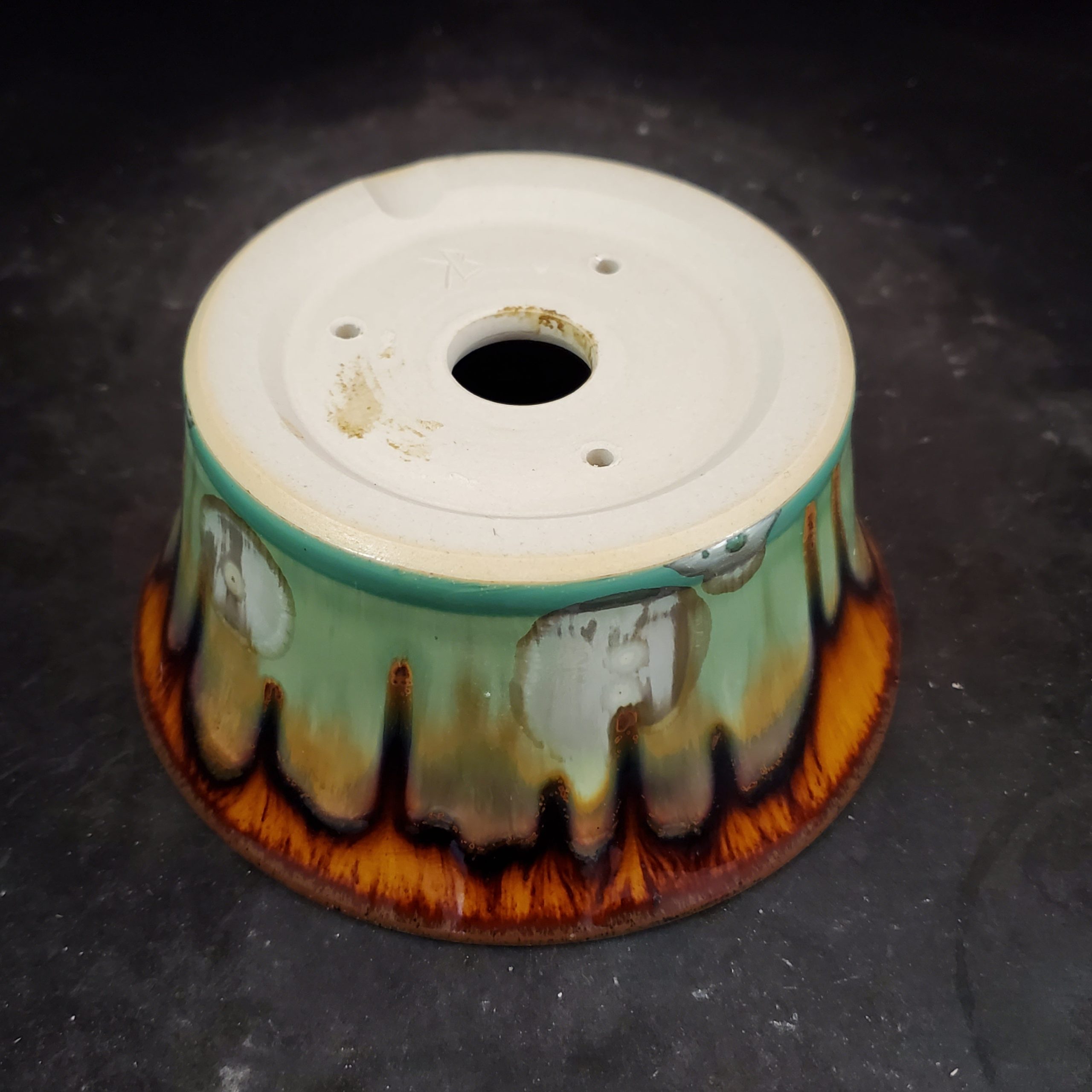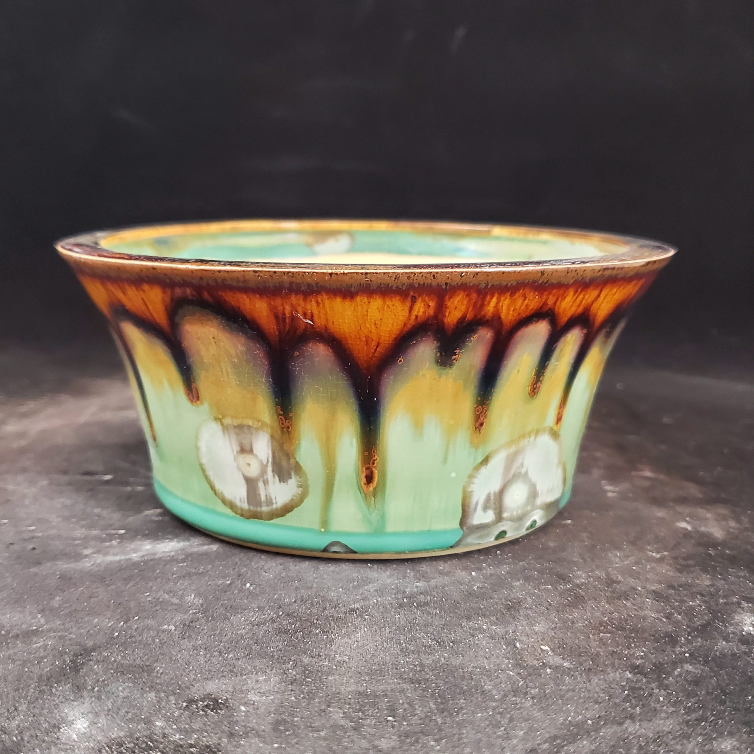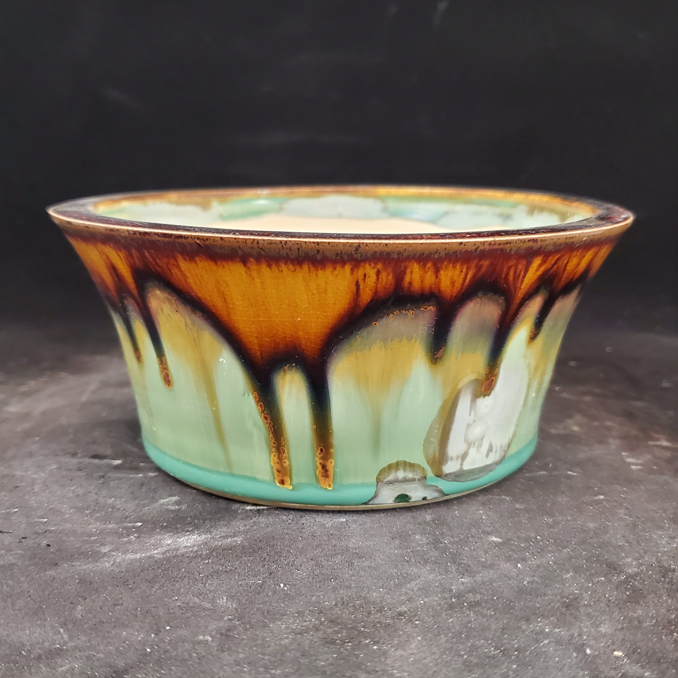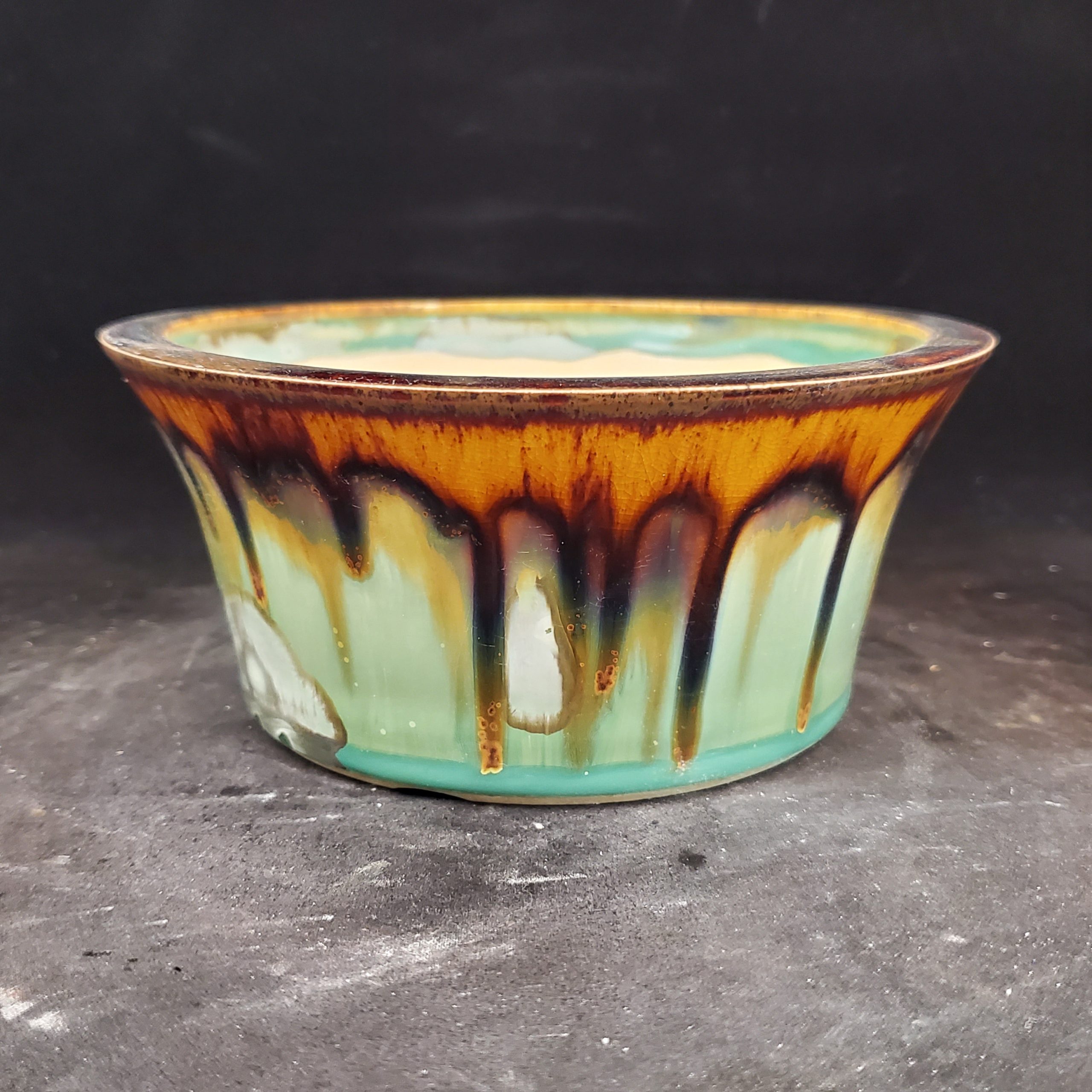 - Artistic, multi – colored glaze with natural “drip” patterns, crackling details, and a glossy finish.