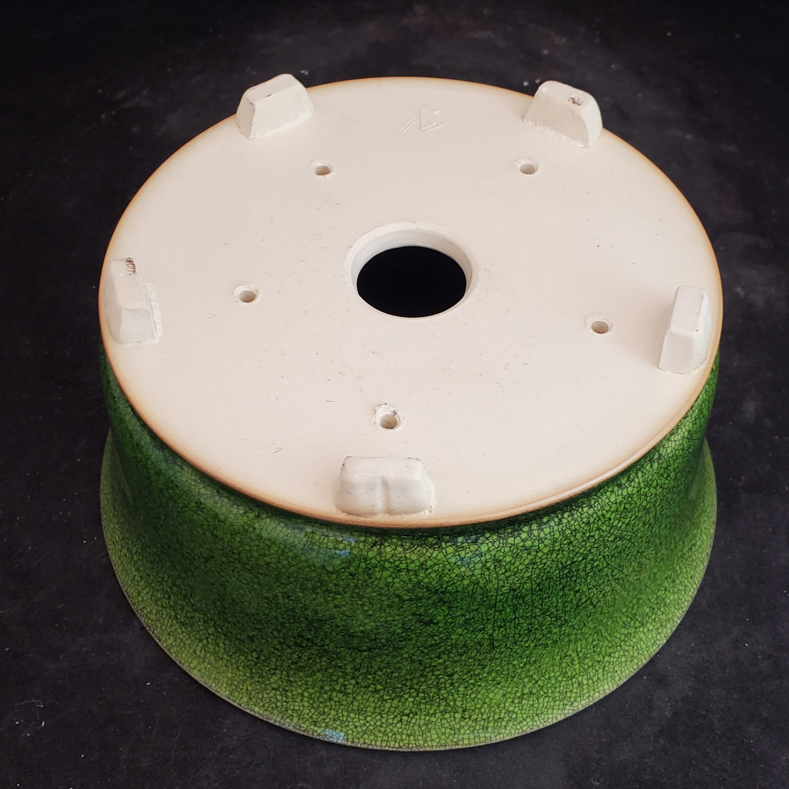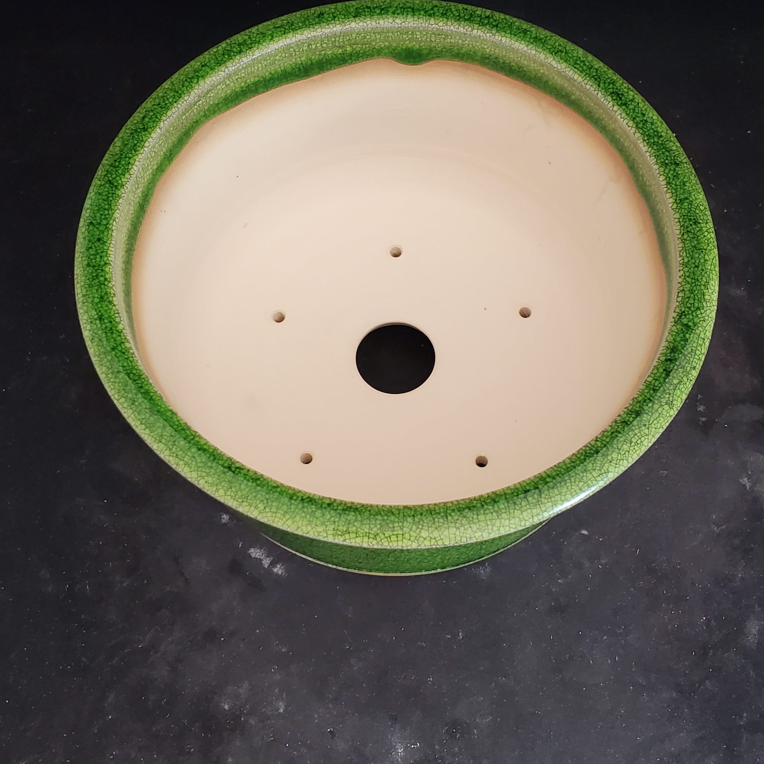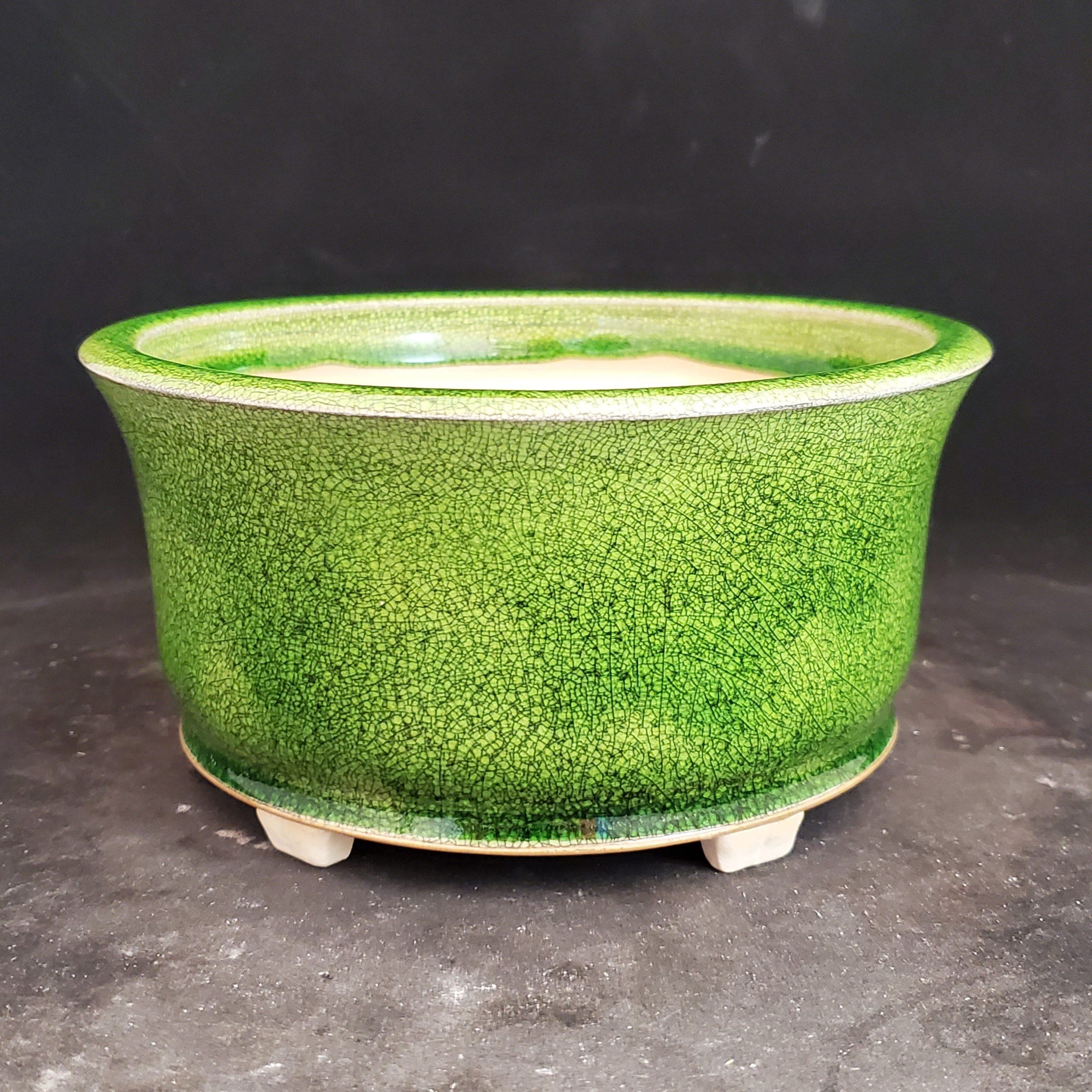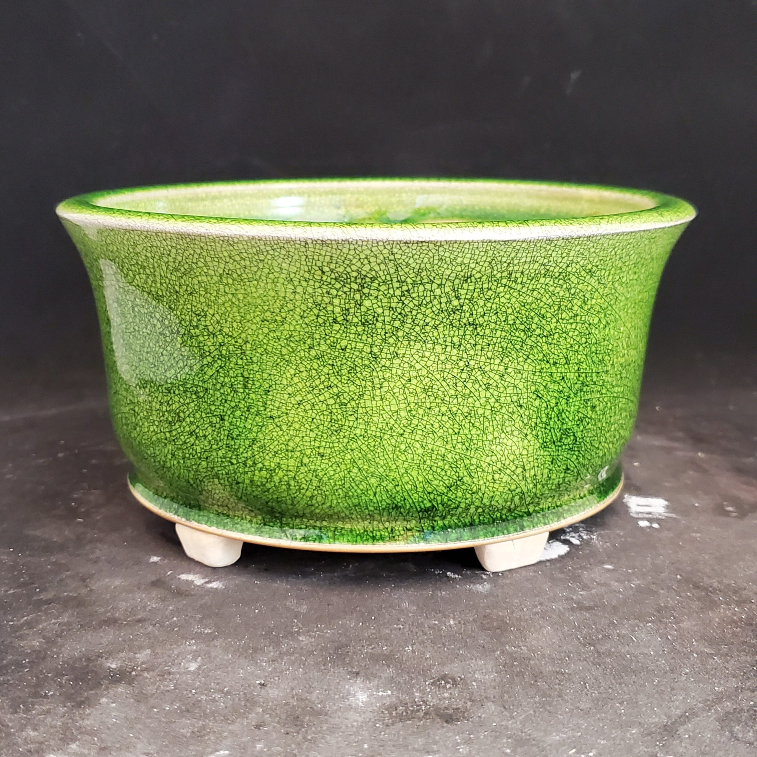 This is a medium-sized ceramic plant pot, likely for bonsai trees or small decorative plants. It has a wide, flared top opening that tapers inwards and then widens at the base with small ceramic feet. The exterior is a vibrant green with a crackled glaze, while the interior is an off – white color, and it comes with a proper drainage system.