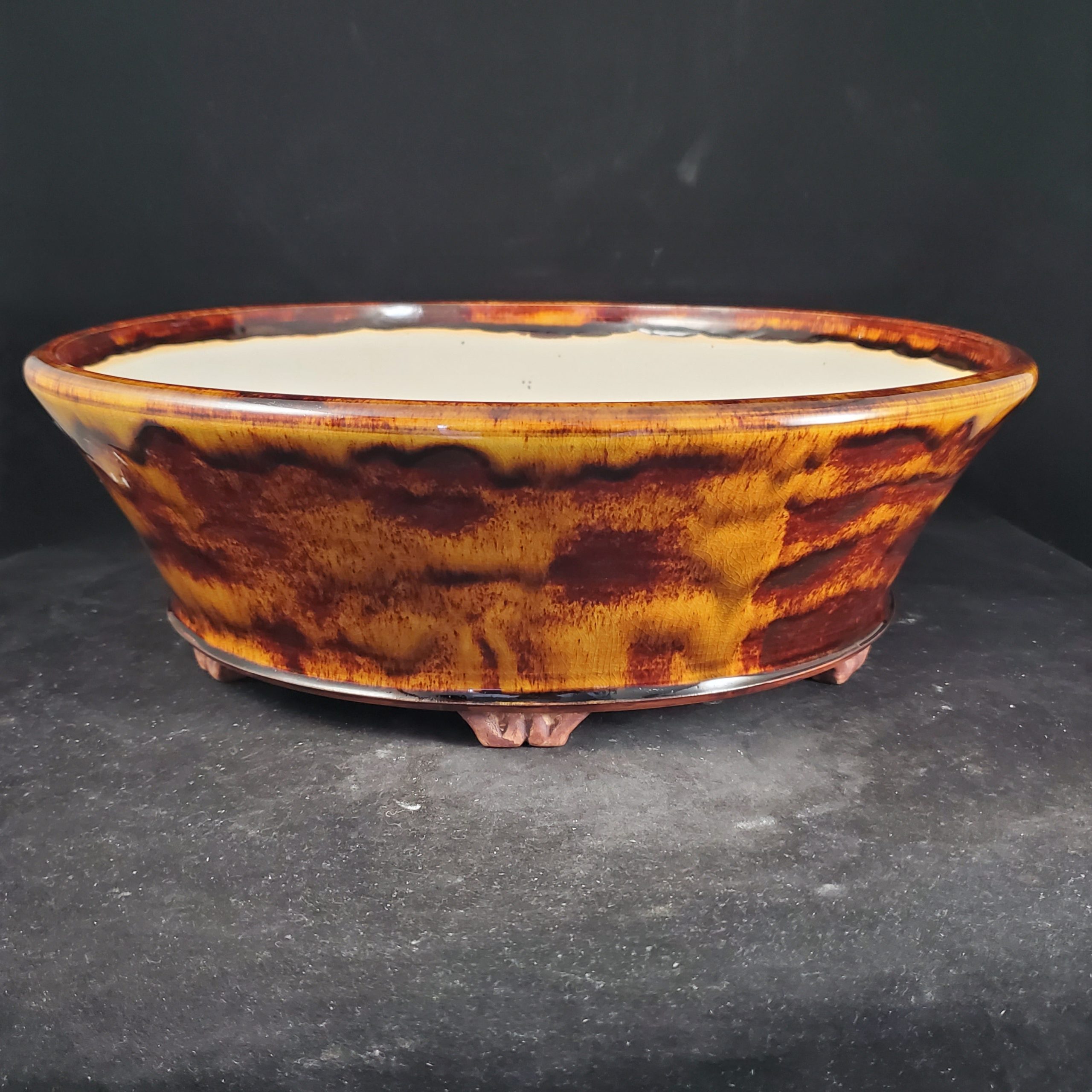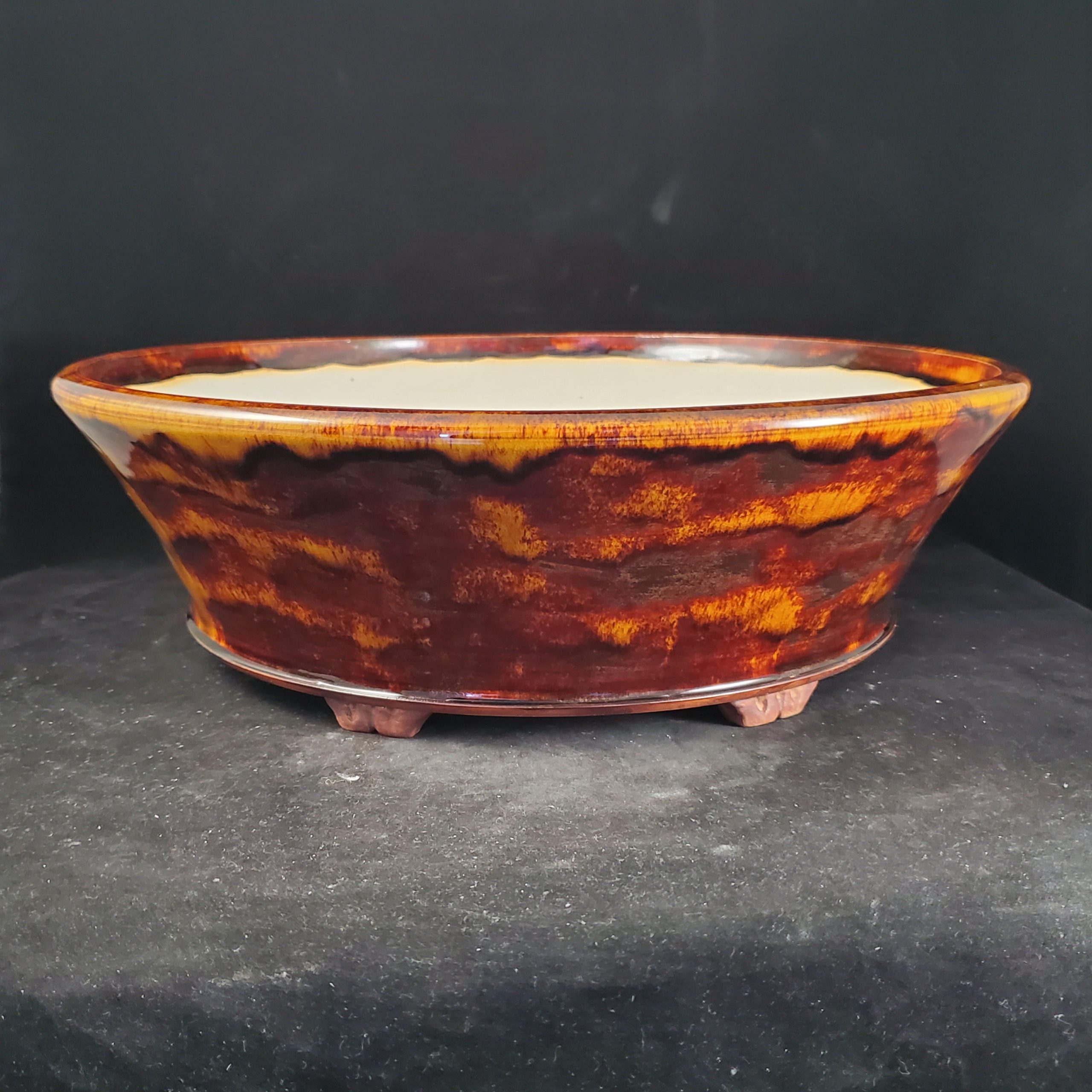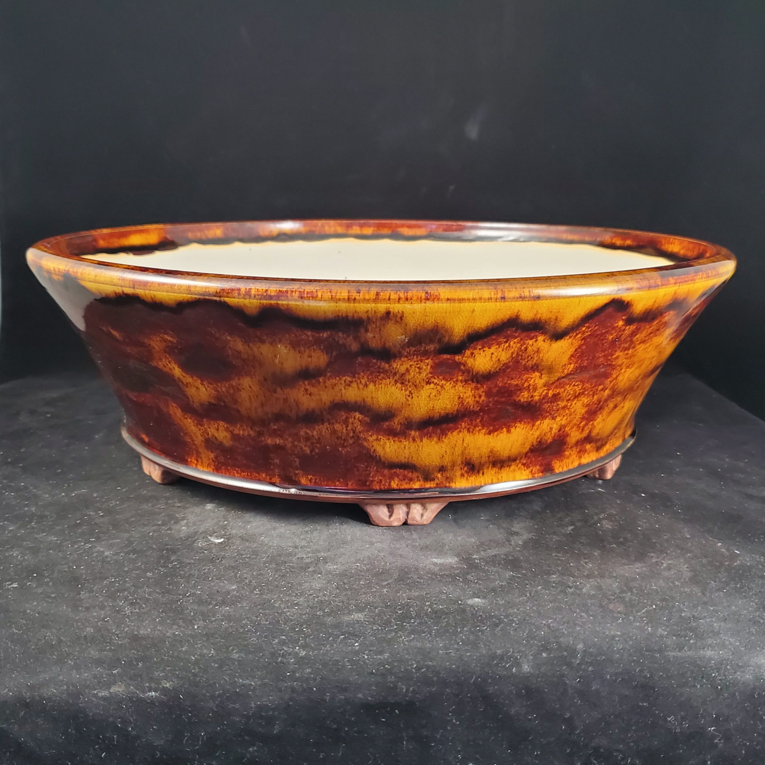 This is a large, shallow glazed ceramic container, likely a bonsai pot. It features a unique marbled glaze in warm orange/yellow and deep red/brown tones on the exterior, with a crackled texture adding visual interest. The interior is a smooth white/cream color, and the pot has small decorative feet and a drainage hole.