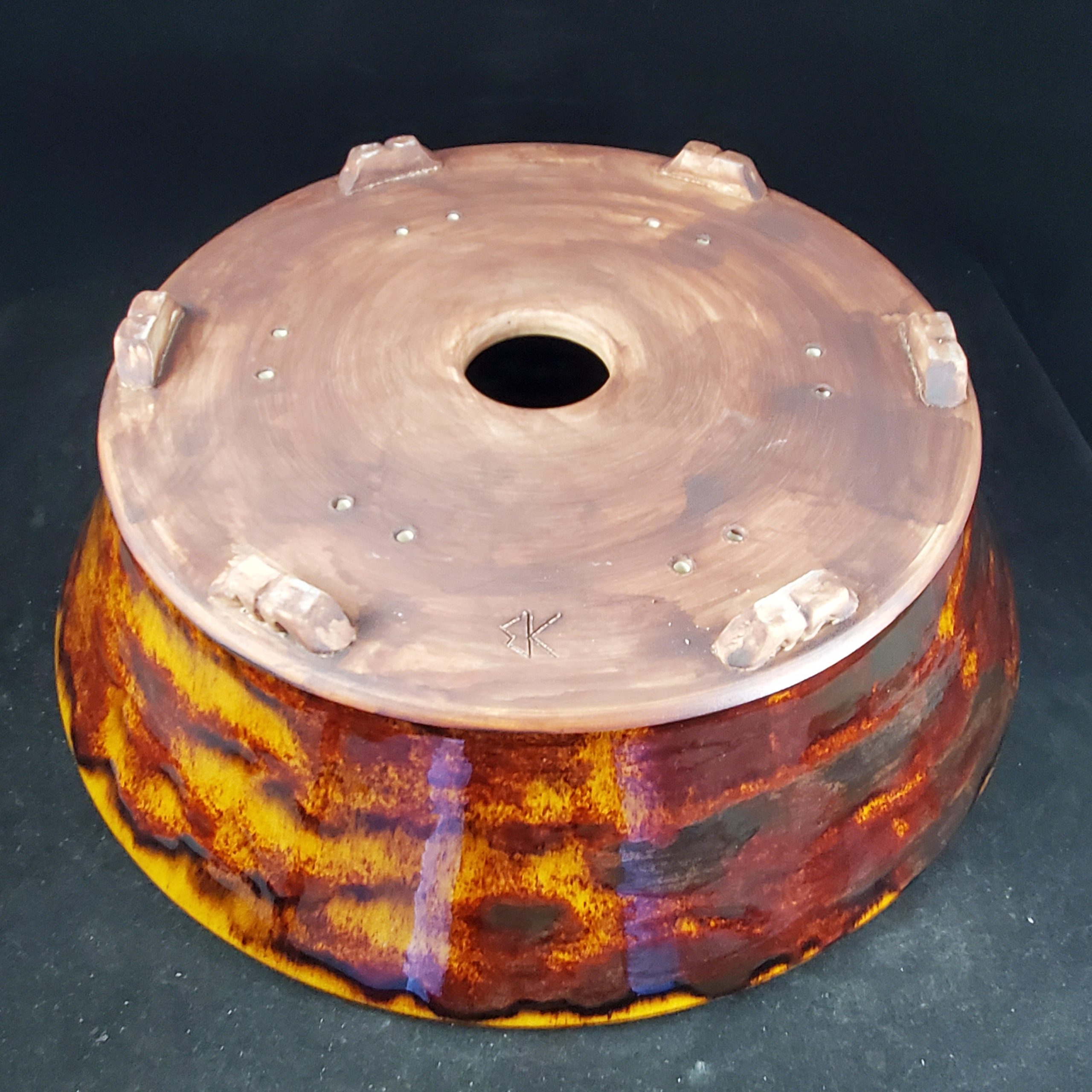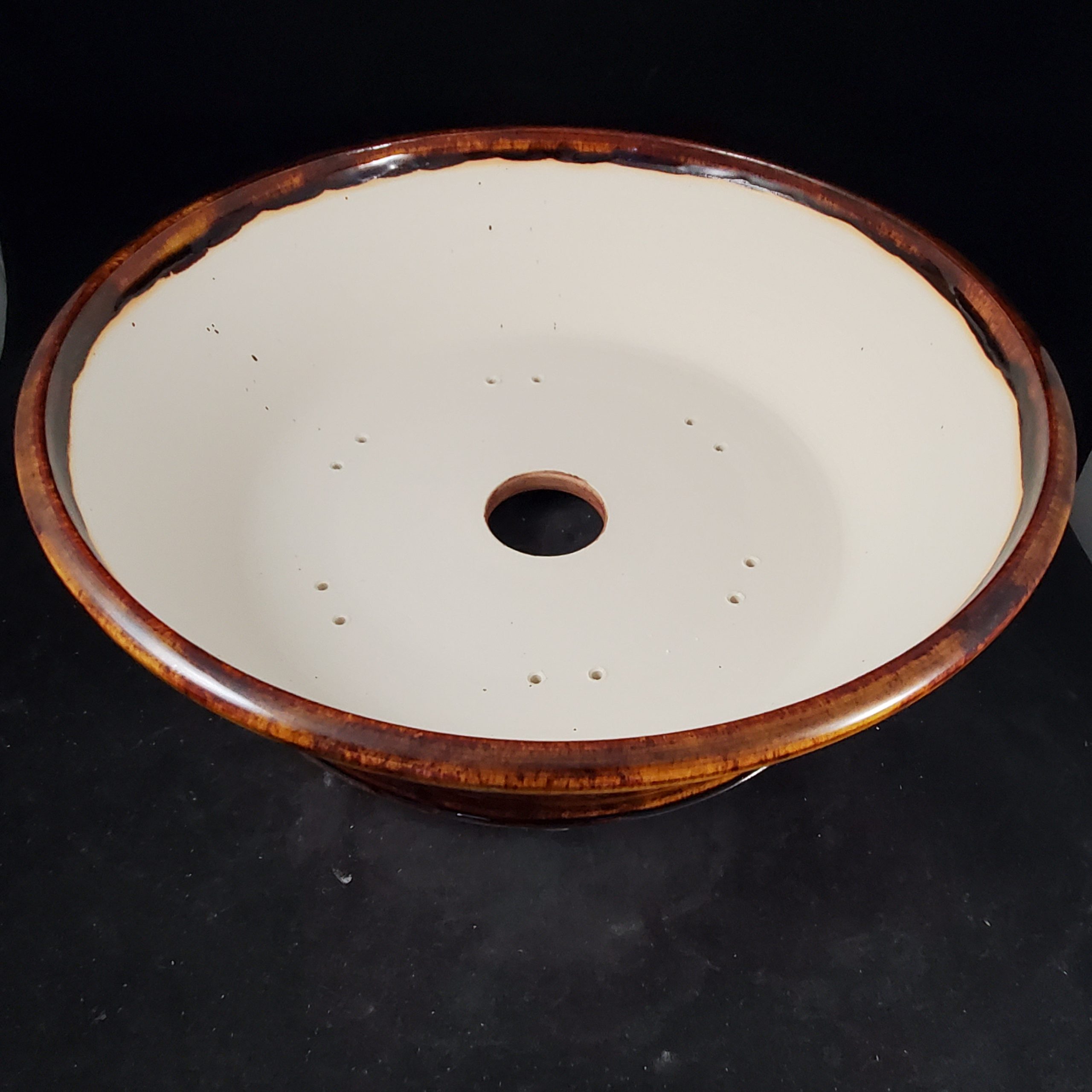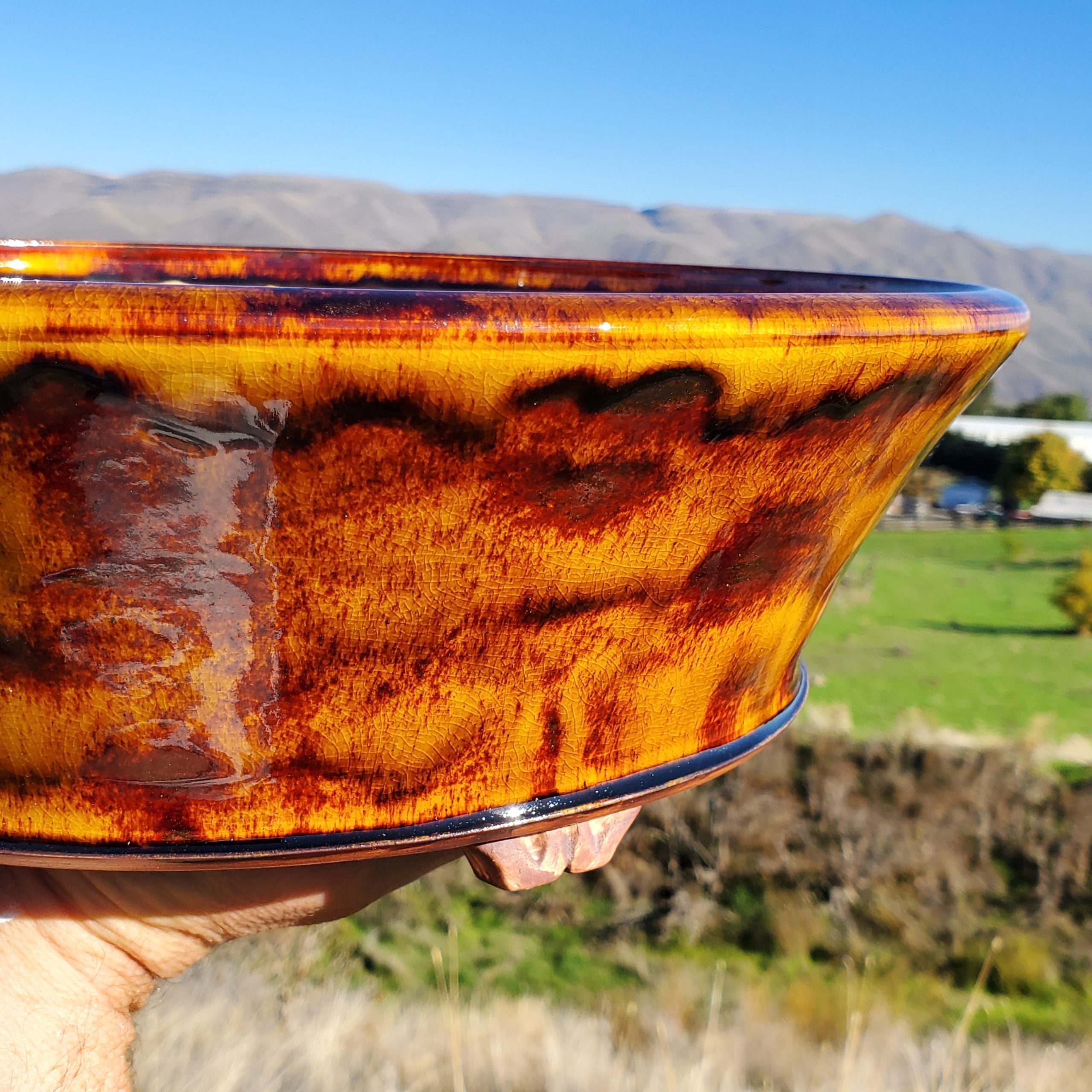 This is a large, shallow glazed ceramic container, likely a bonsai pot. It features a unique marbled glaze in warm orange/yellow and deep red/brown tones on the exterior, with a crackled texture adding visual interest. The interior is a smooth white/cream color, and the pot has small decorative feet and a drainage hole.